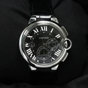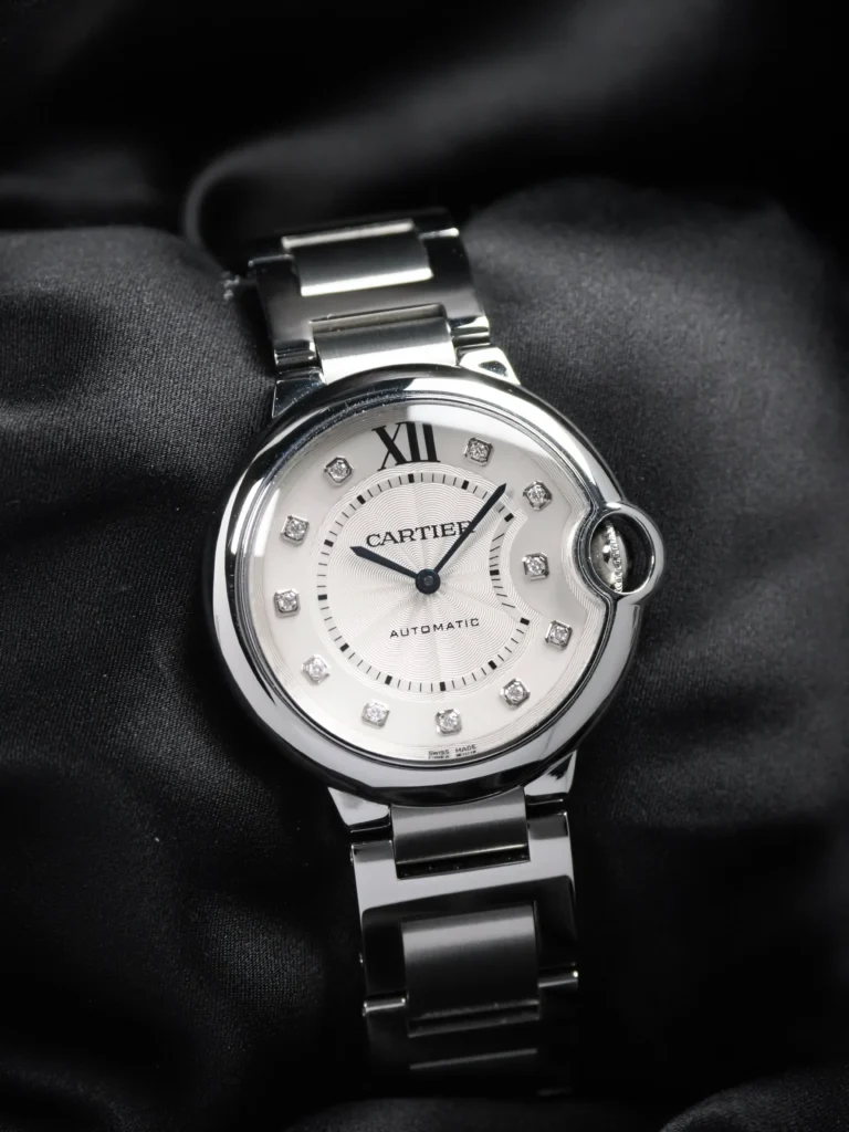 Adorned with a diamond-set guilloché dial, the Cartier Ballon Bleu (Ref. WE902075) captivates with its timeless 36mm case and signature blue sapphire cabochon crown. Powered by the in-house 1847 MC automatic movement, this Ballon Bleu blends horology with jewelry-like allure, perfect for those seeking a luxurious yet versatile timepiece.
