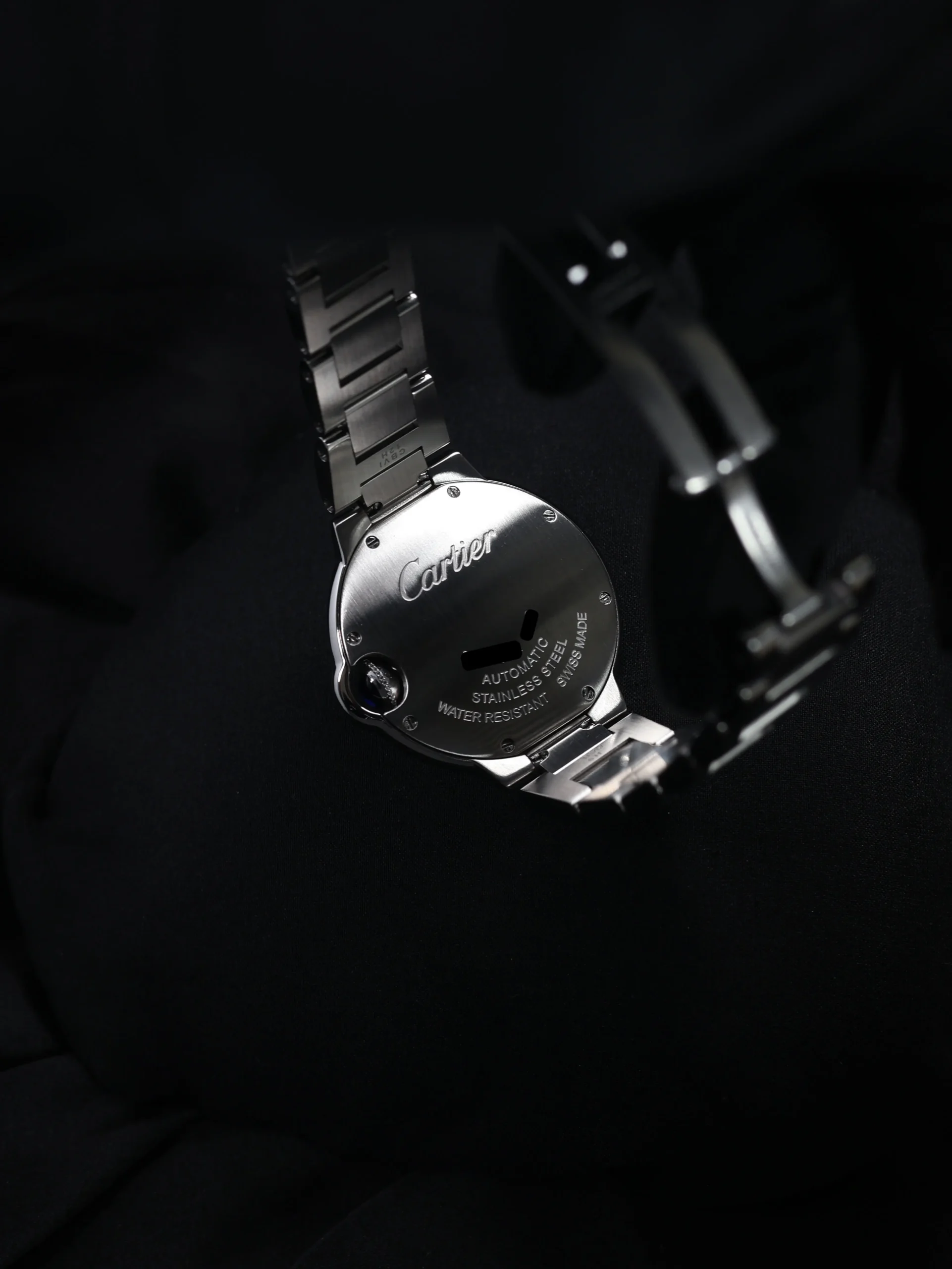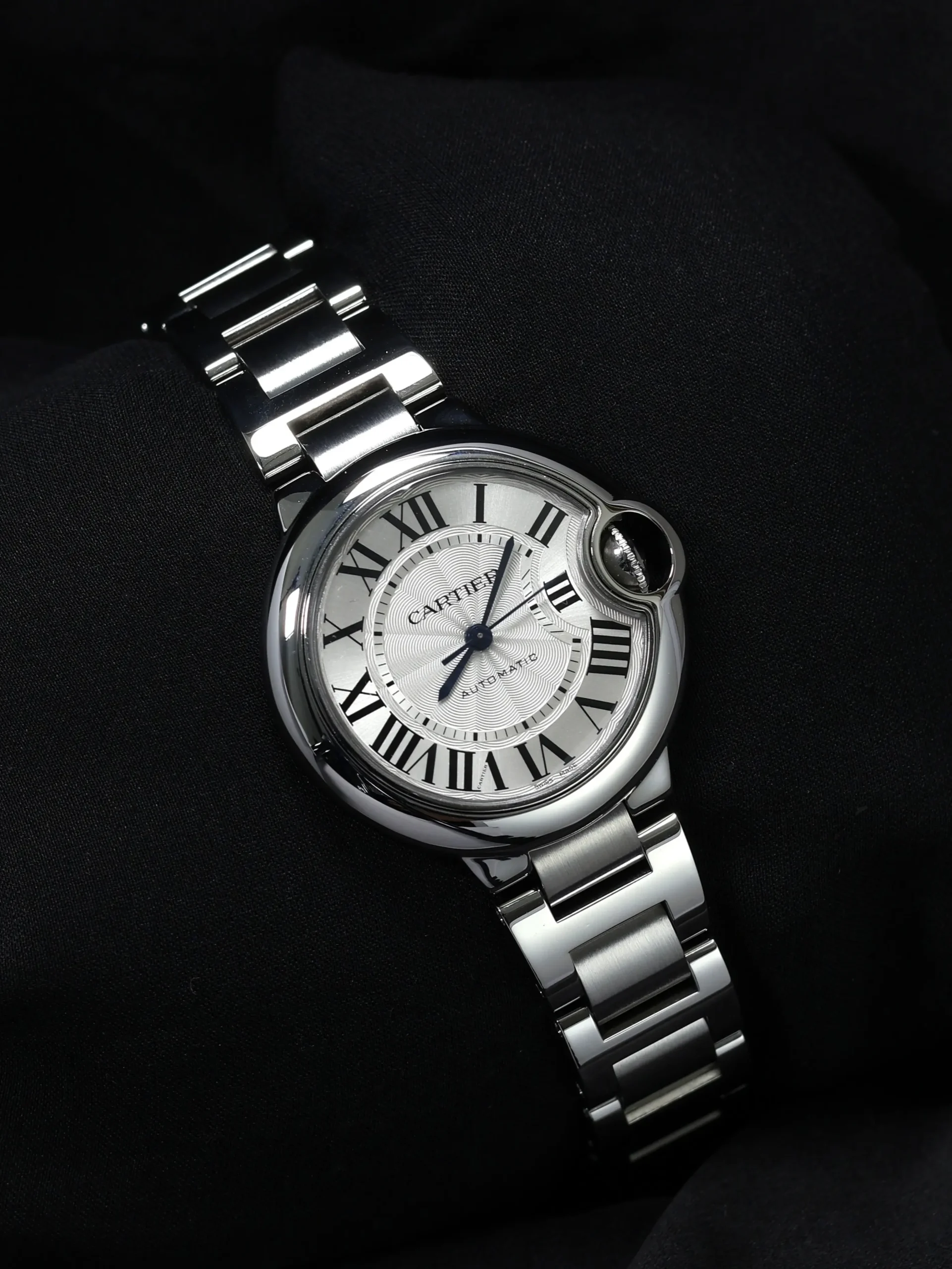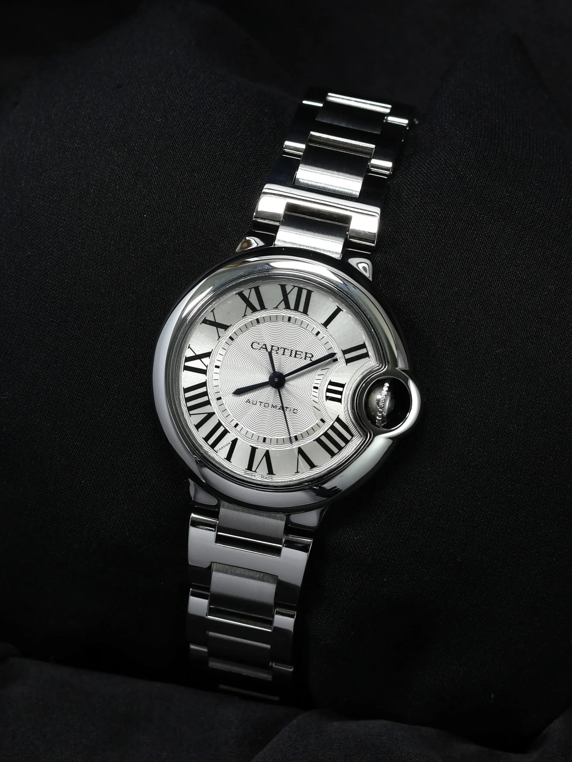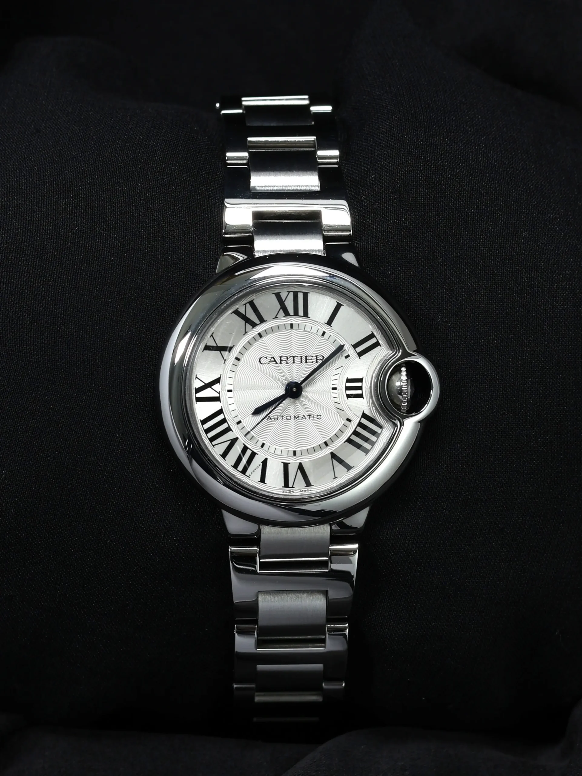 Pre-owned Cartier Ballon Bleu (W6920071) self-winding automatic watch. This reference features a silver dial, encased in a 33mm steel case and bracelet. Features seconds, minutes, and hours functions. This watch shows light use. Functions and keeps time well. Comes with original box and warranty papers dated 2016.