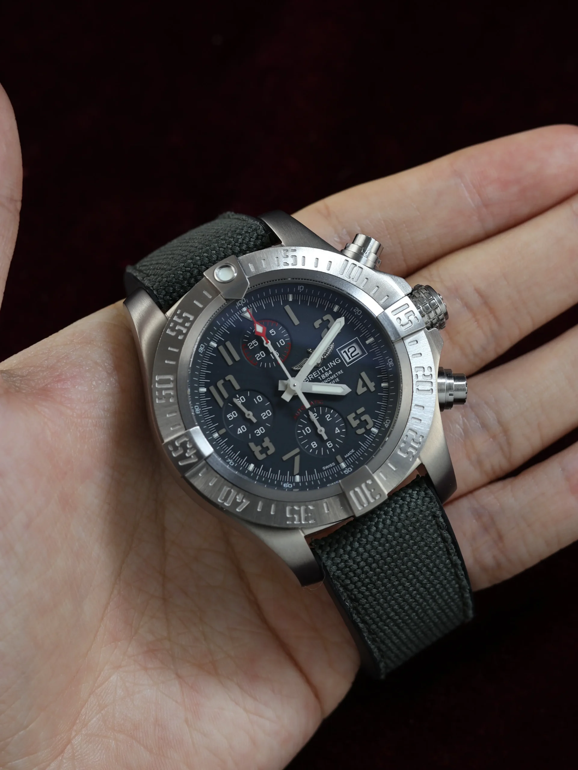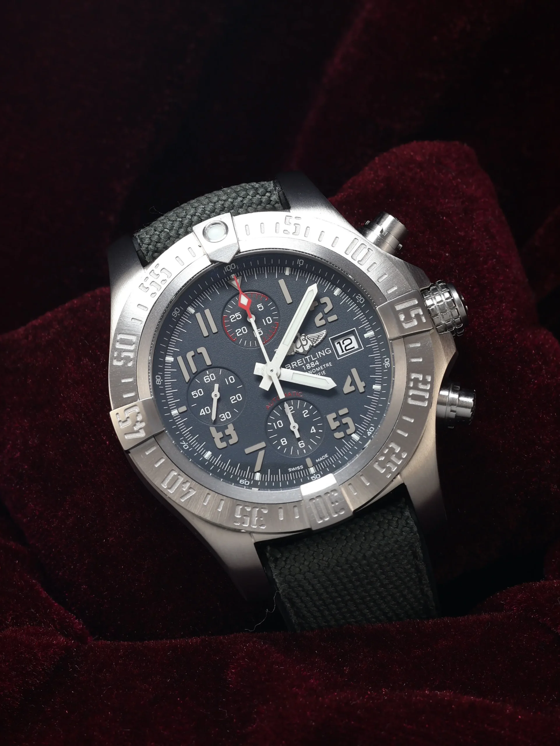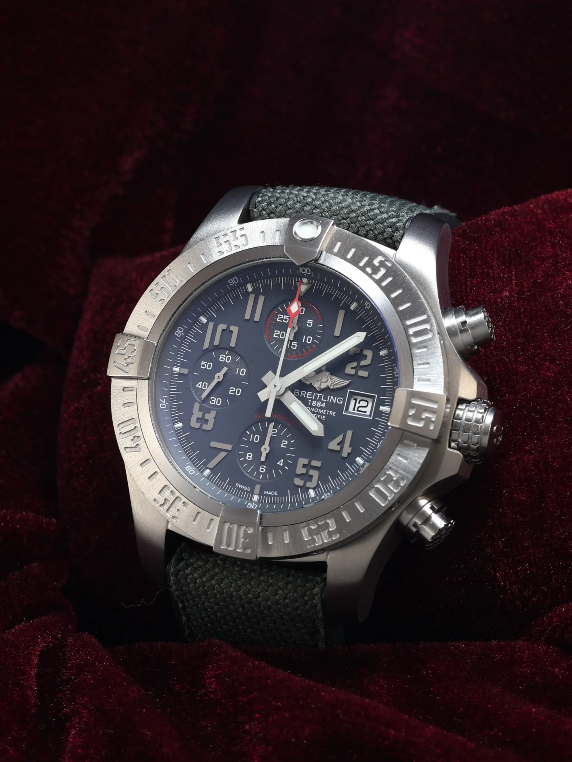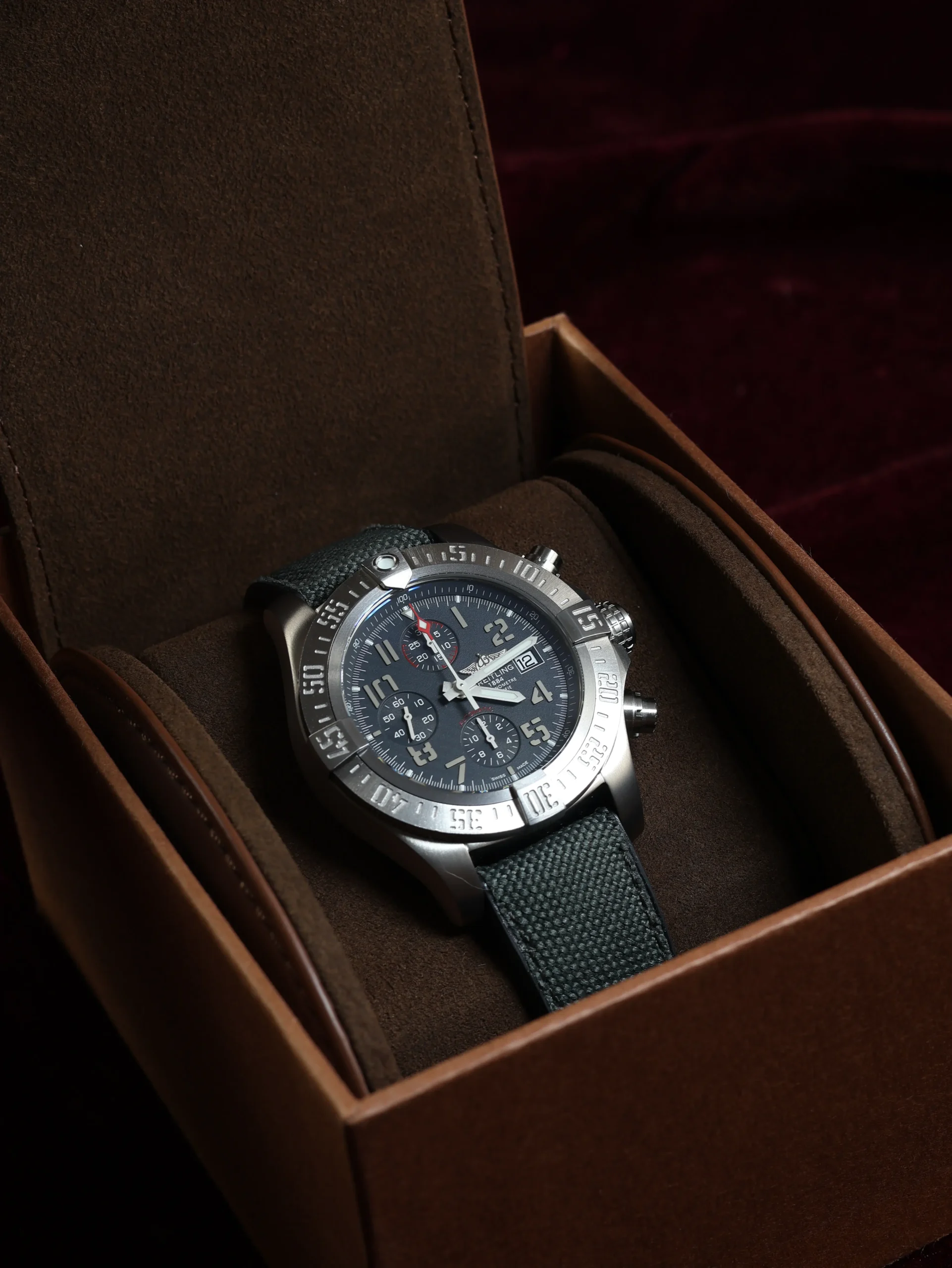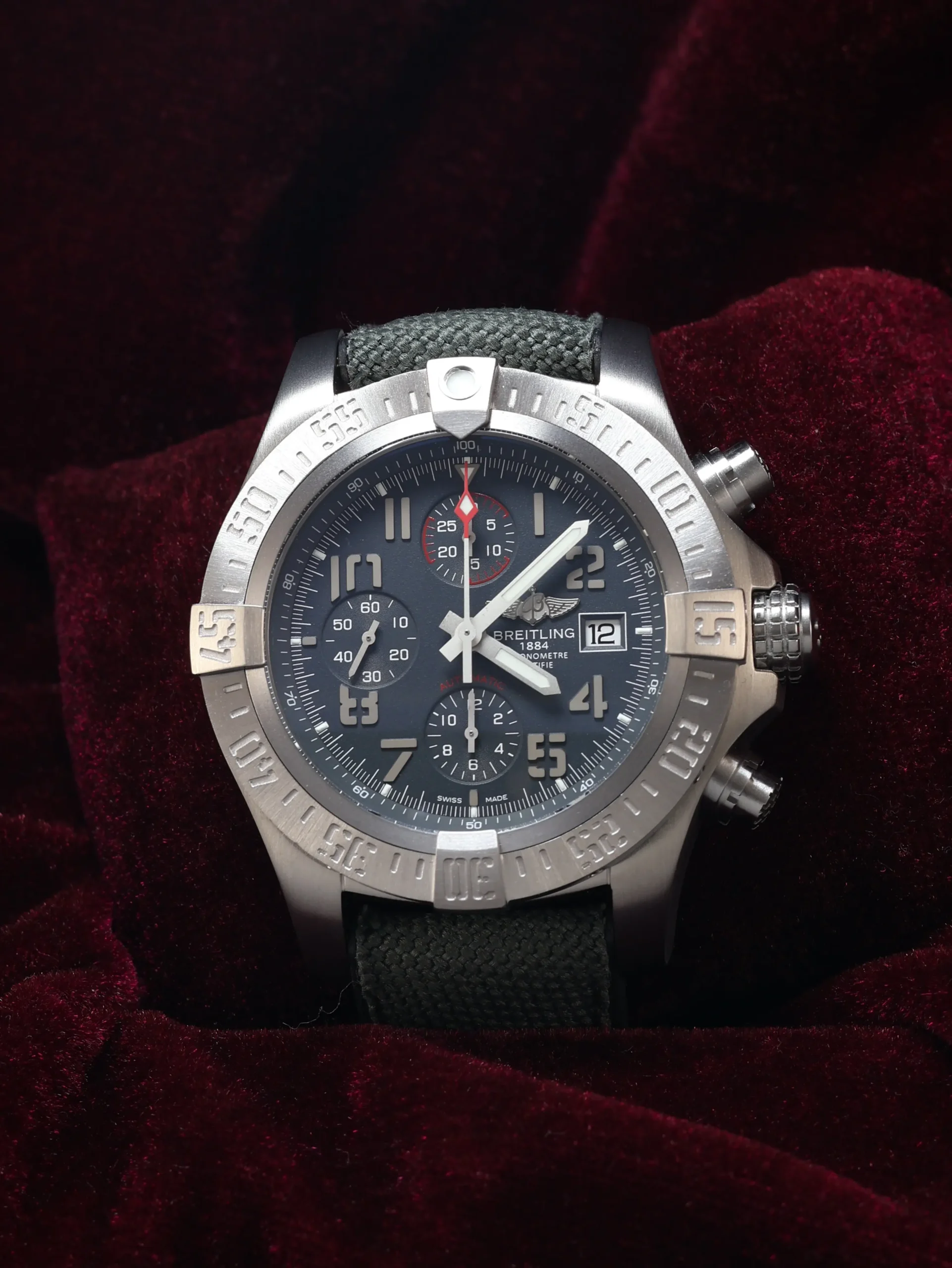 Pre-owned Breitling Avenger Bandit (E13383 ) self-winding automatic watch. This reference features a grey dial and titanium bezel, encased in a 45mm titanium case and green straps. Features seconds, minutes, hours, date, chronograph, and 60-minute countdown functions. This watch shows light use. Functions and keeps time well. Comes with original box dated 2020.