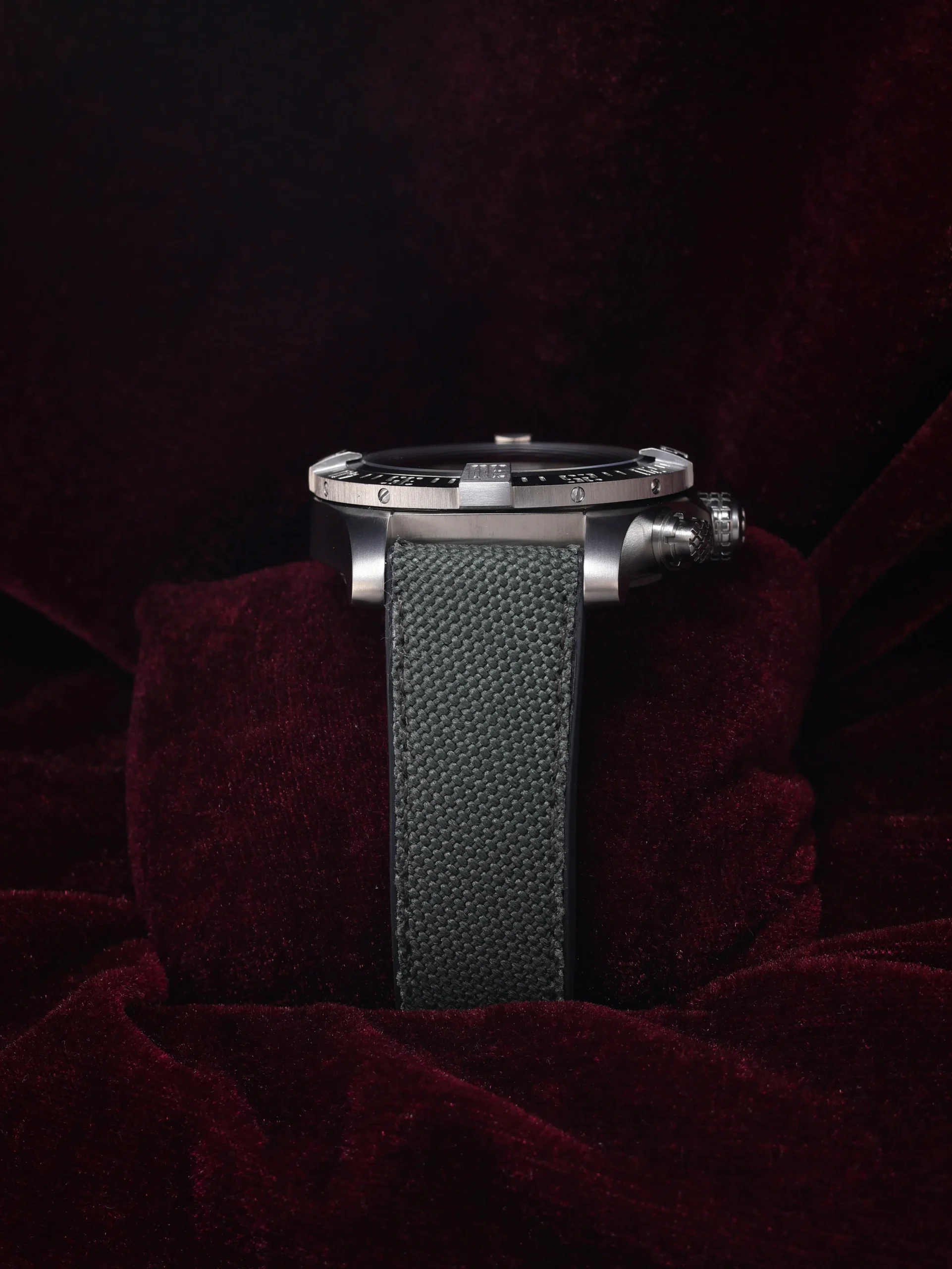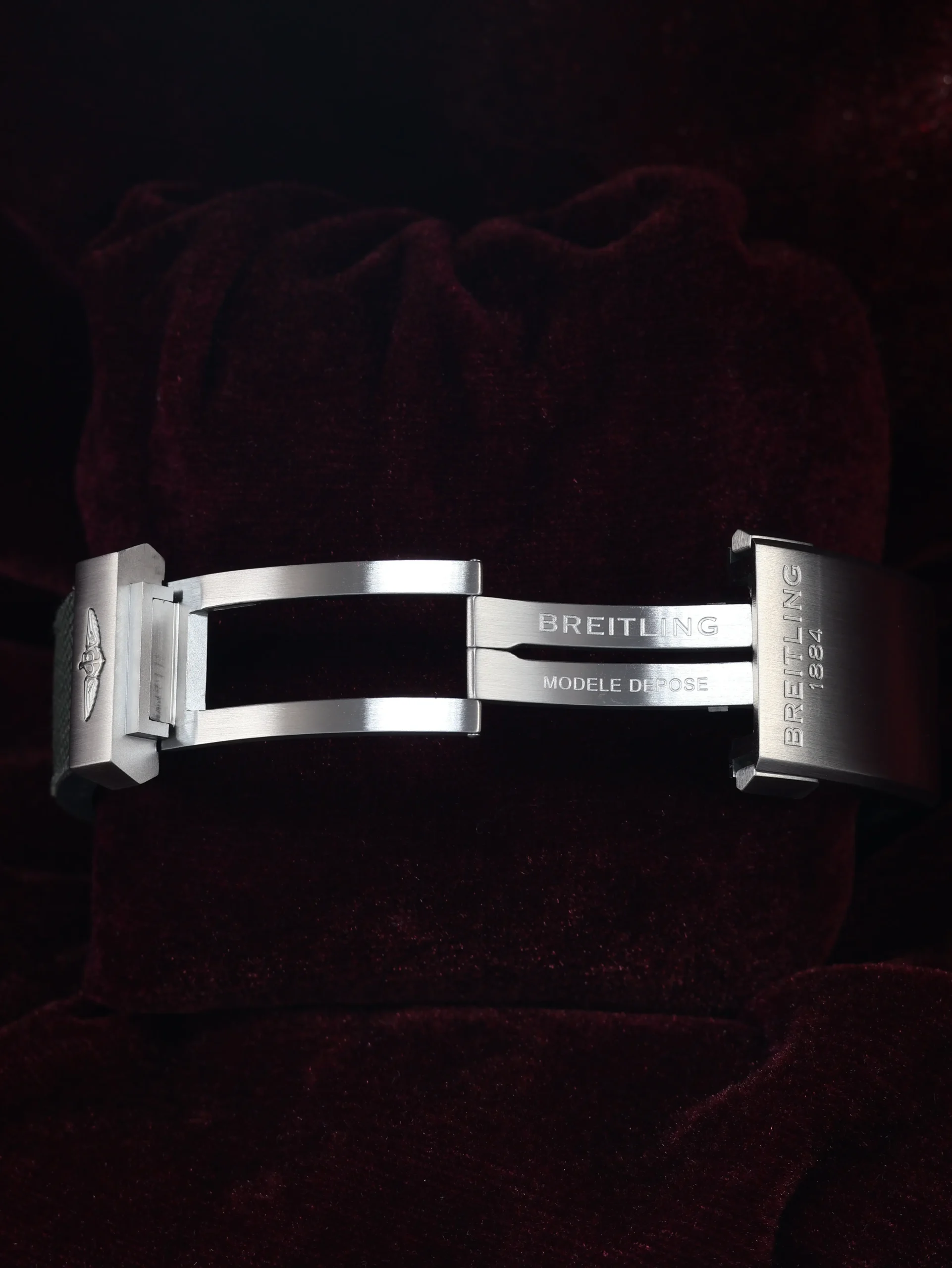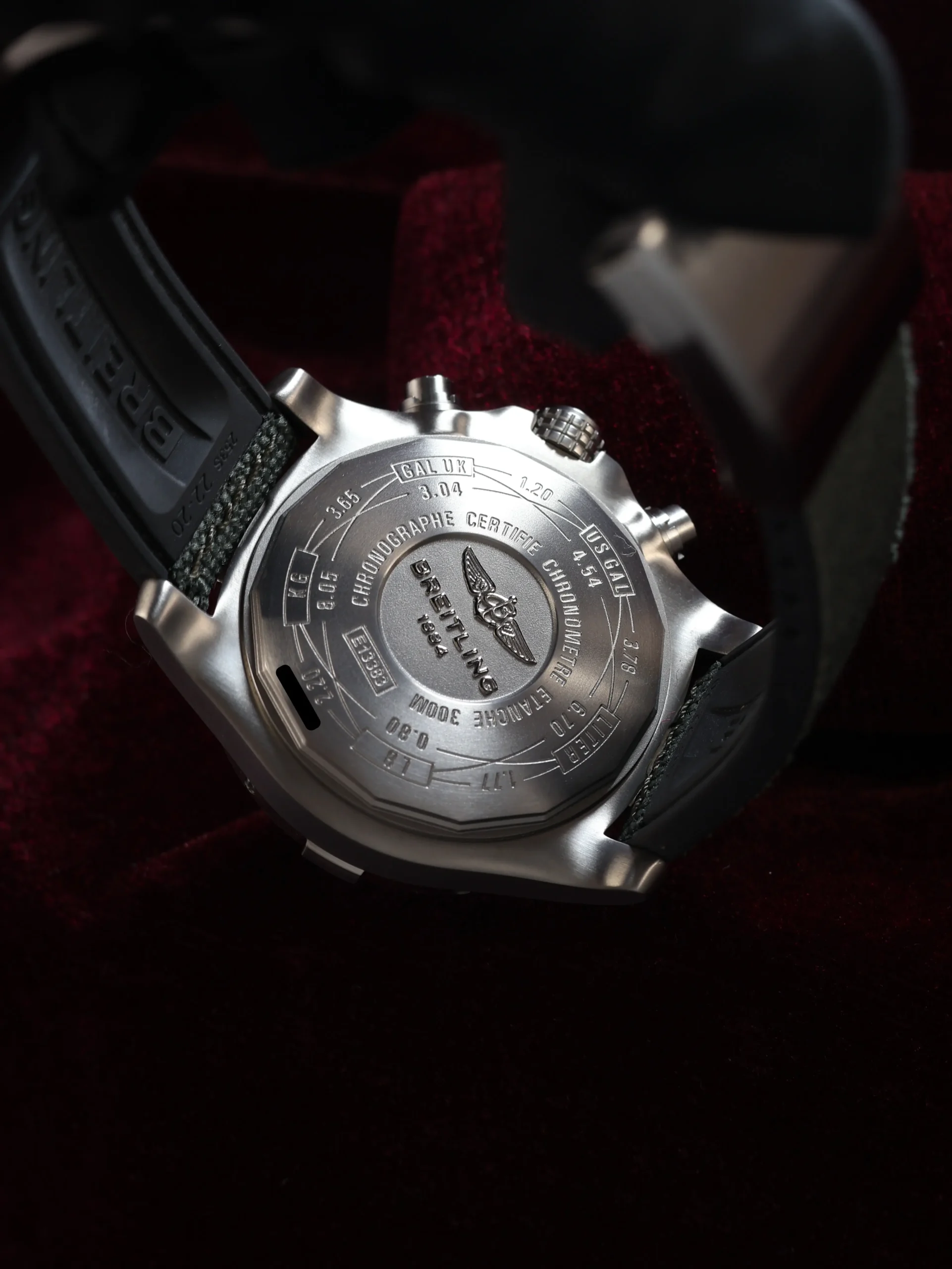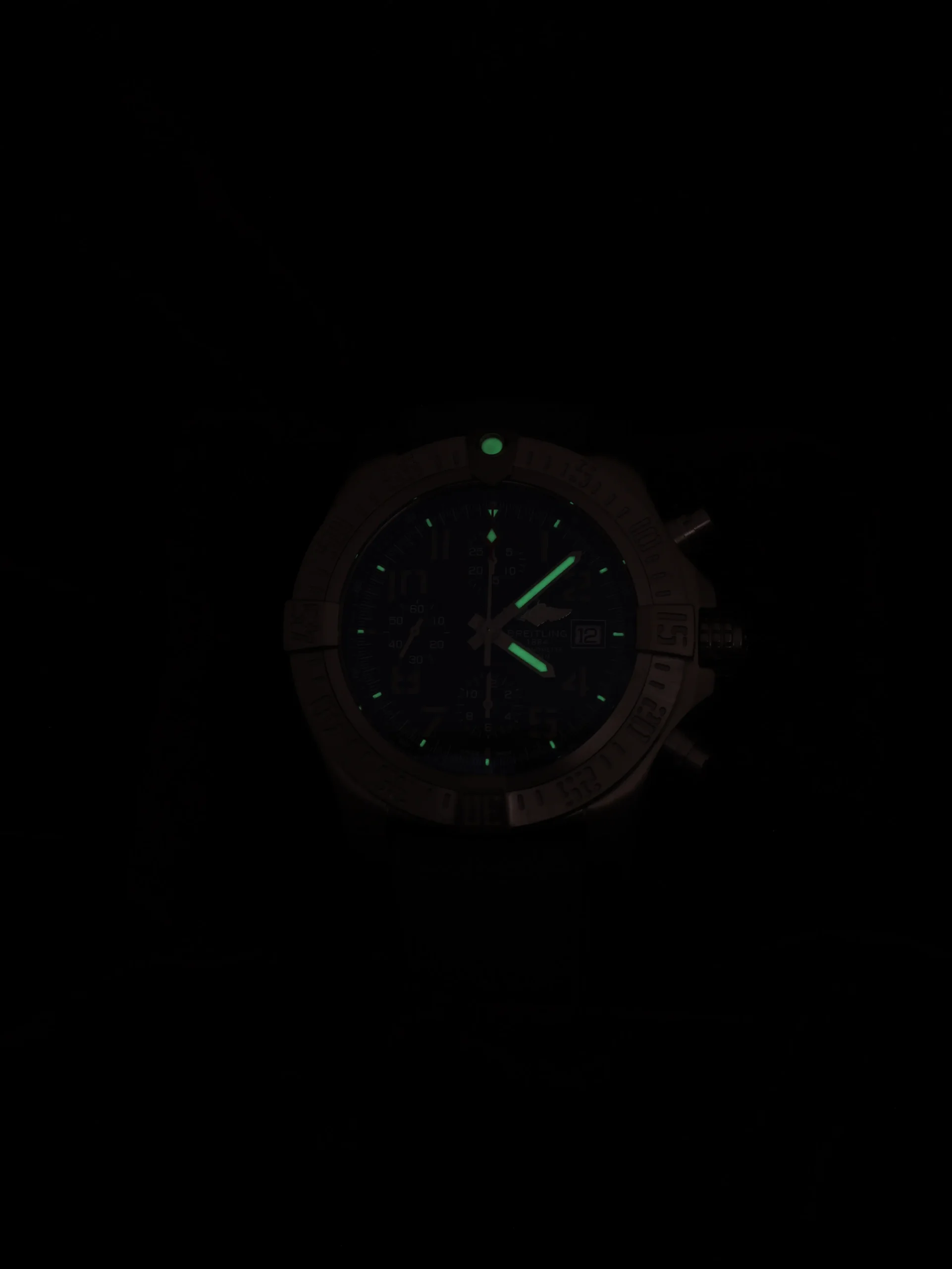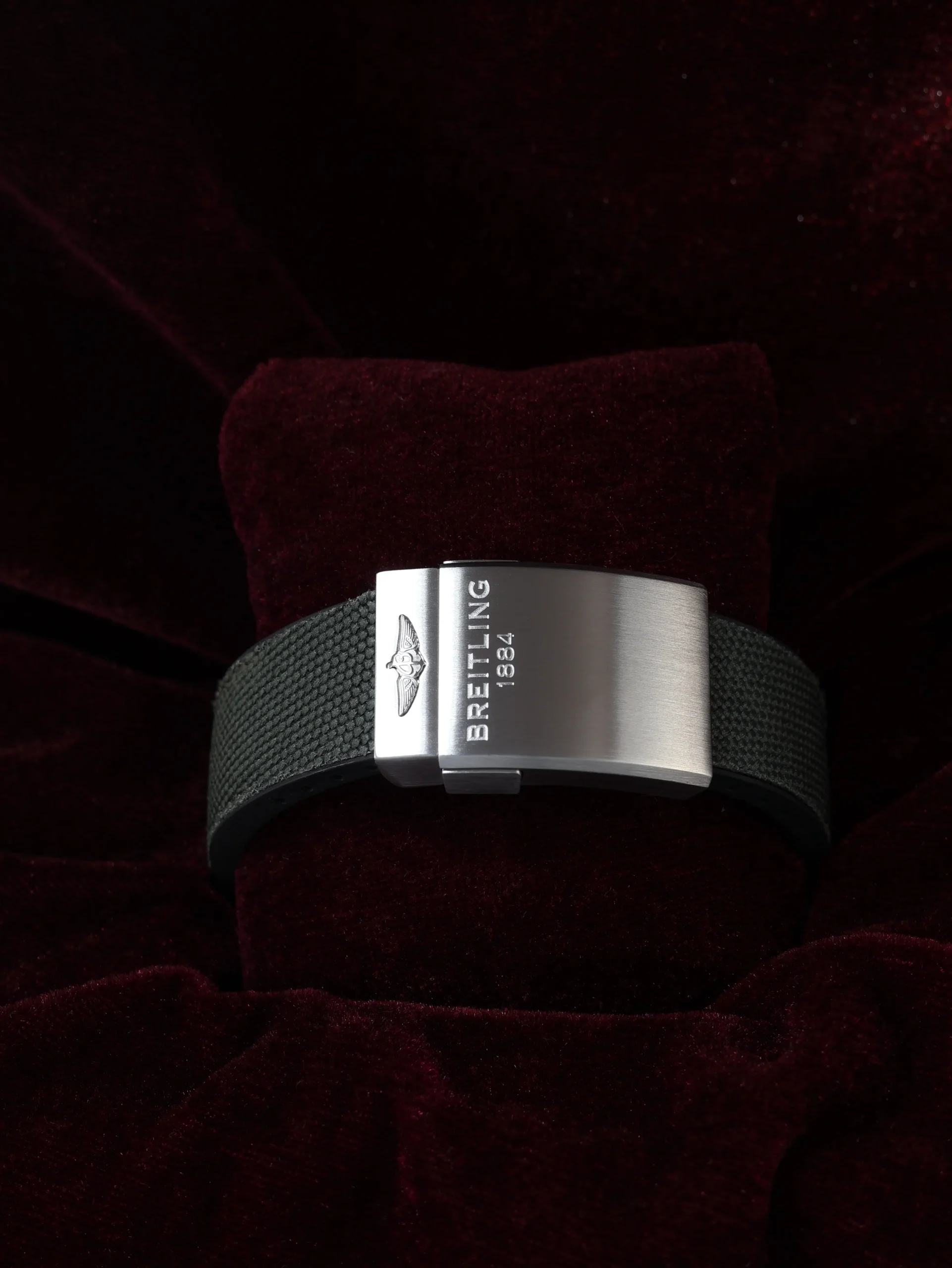 Pre-owned Breitling Avenger Bandit (E13383 ) self-winding automatic watch. This reference features a grey dial and titanium bezel, encased in a 45mm titanium case and green straps. Features seconds, minutes, hours, date, chronograph, and 60-minute countdown functions. This watch shows light use. Functions and keeps time well. Comes with original box dated 2020.