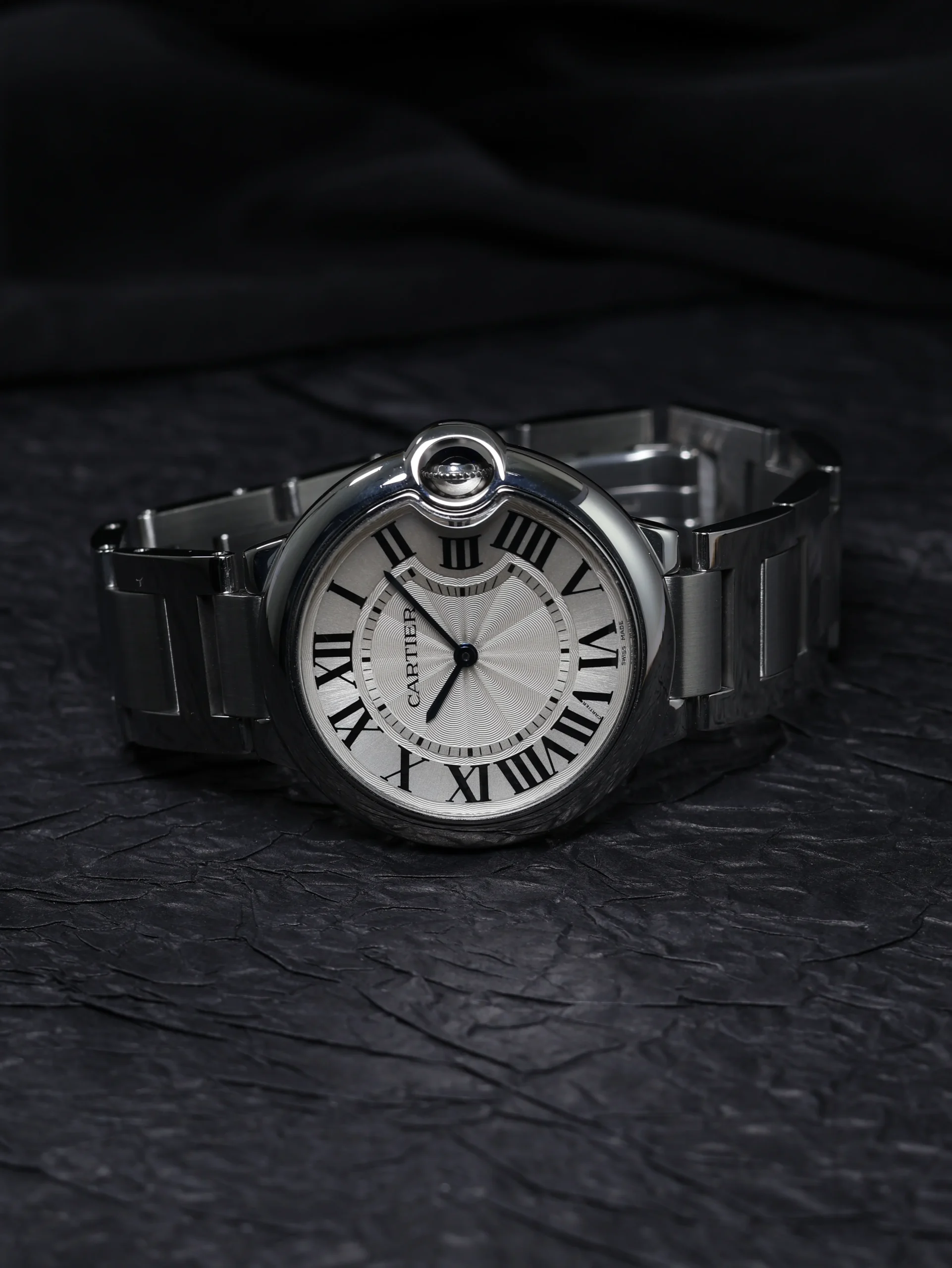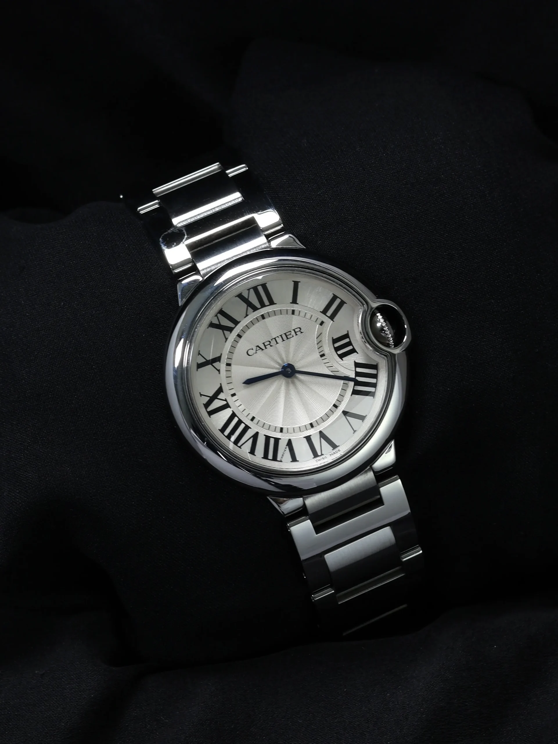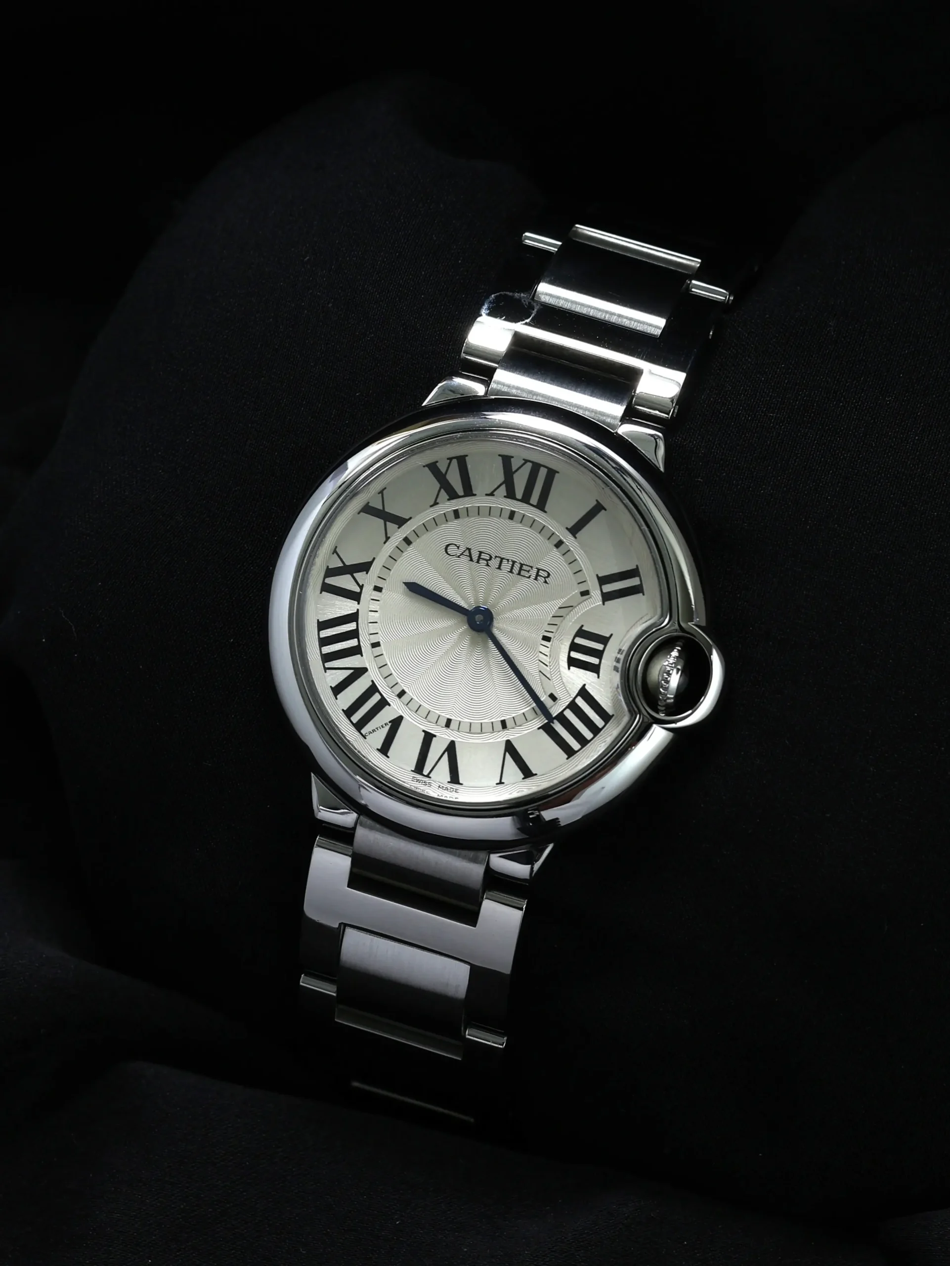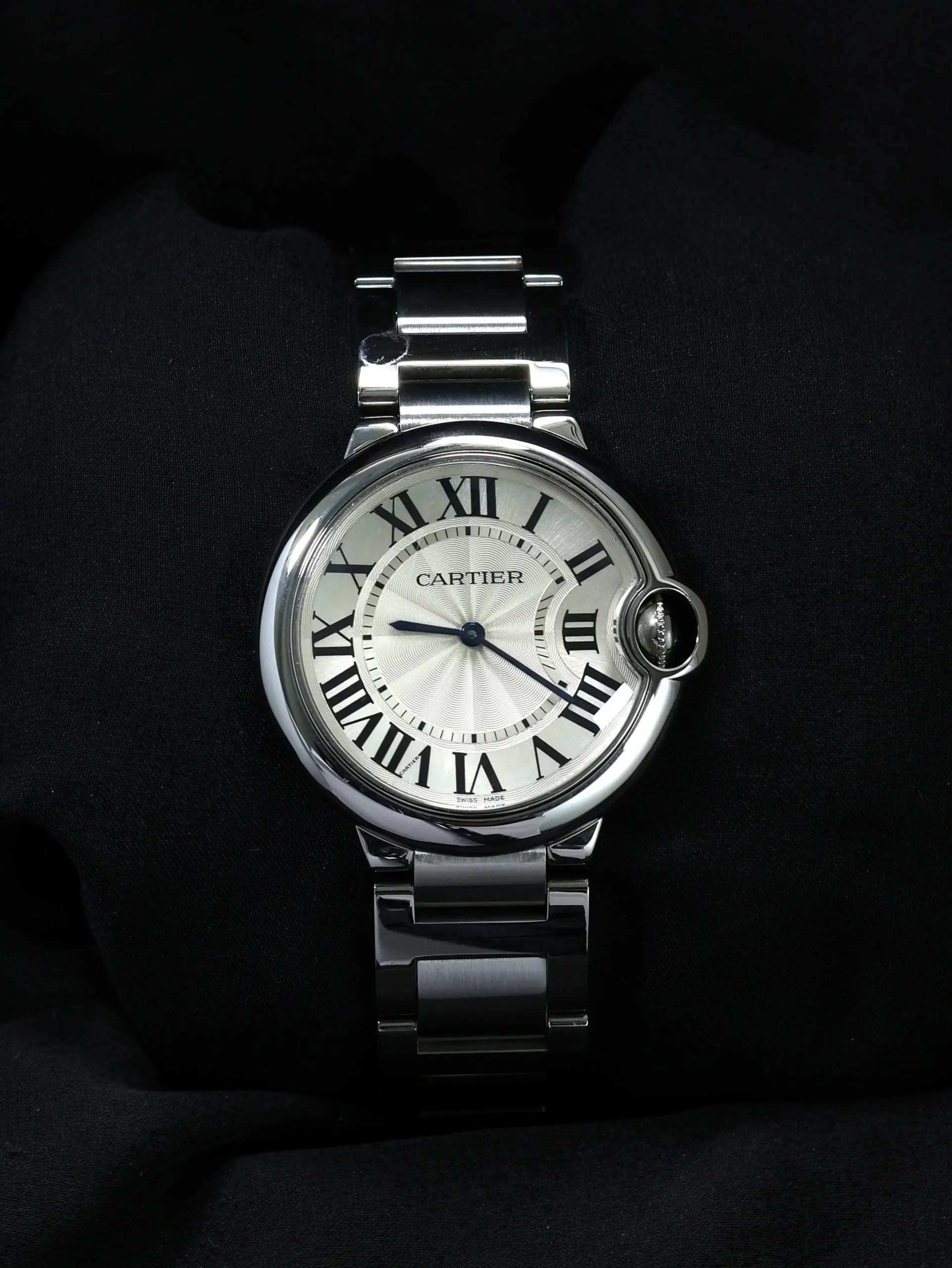 Pre-owned Cartier Ballon Bleu (W69011Z4) quartz watch. This reference features a silver dial, encased in a 36mm steel case and bracelet. Features minutes and hours functions. This watch shows light use. Functions and keeps time well. Comes with original box and warranty papers dated 2010.