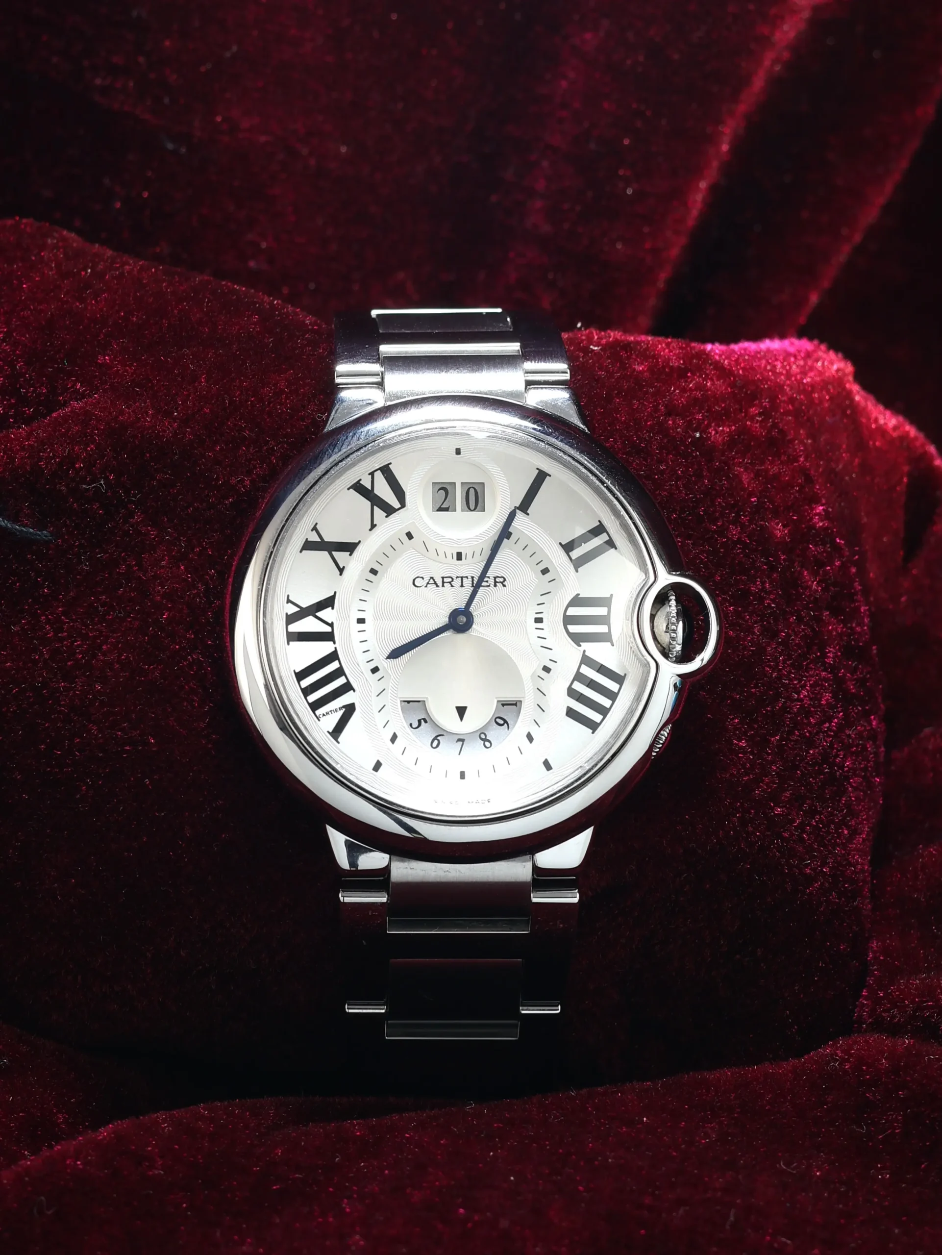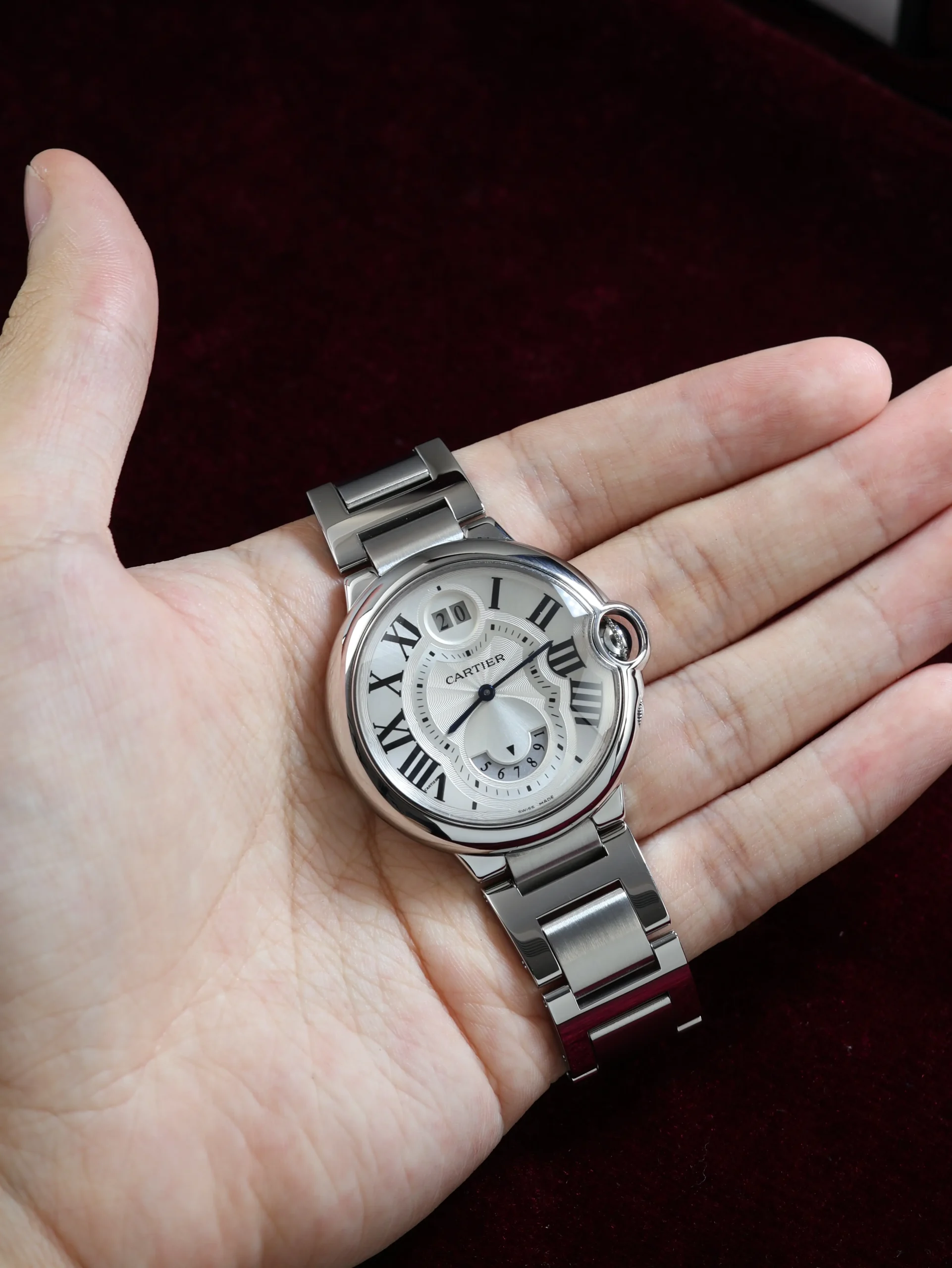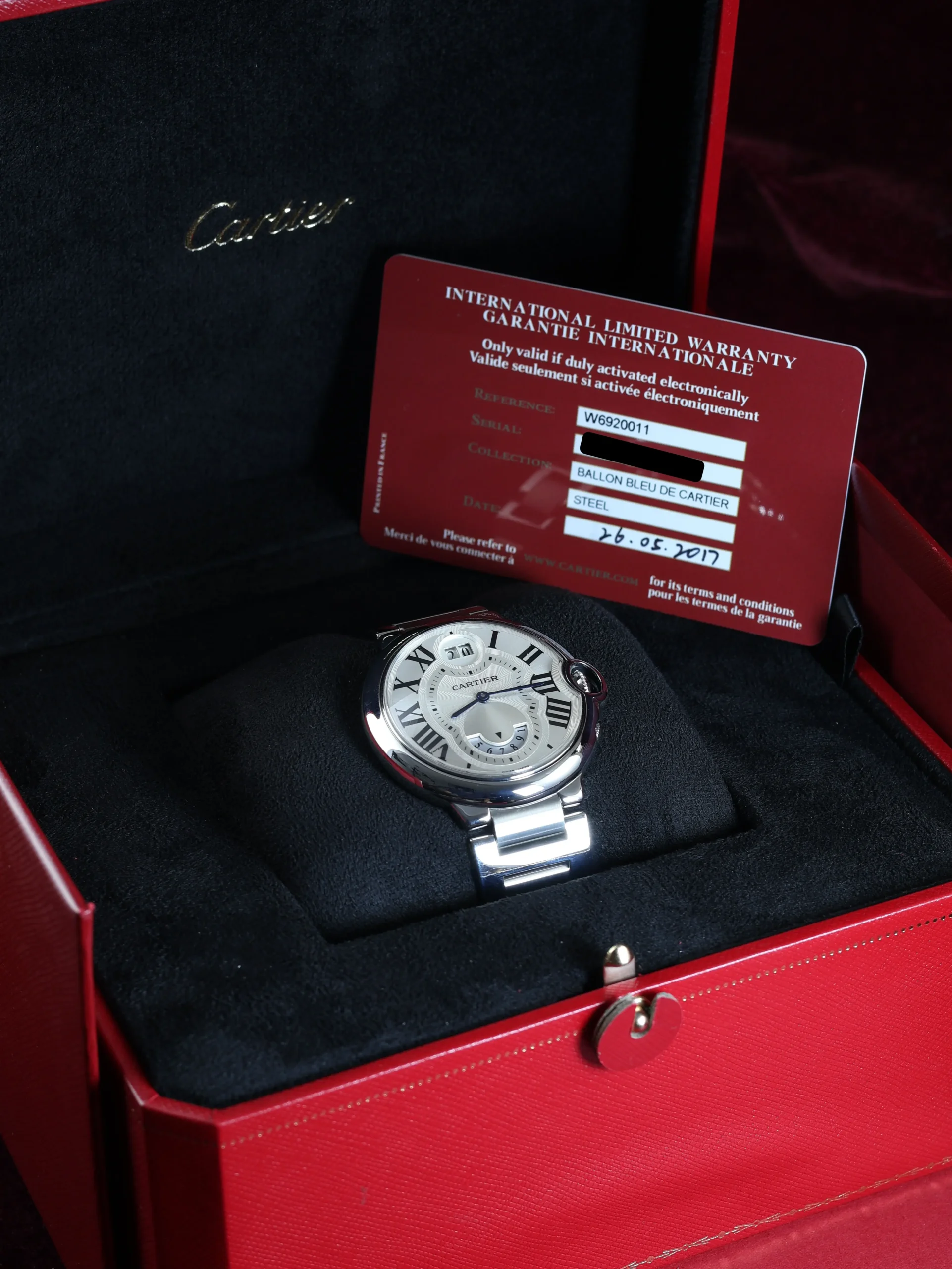 Pre-owned Cartier Ballon Bleu (W6920011) quartz watch. This reference features a silver dial, encased in a 38mm steel case and bracelet. Features seconds, minutes, hours, date, and GMT dual-time functions. This watch shows light use. Functions and keeps time well. Comes with box and warranty papers dated 2017.