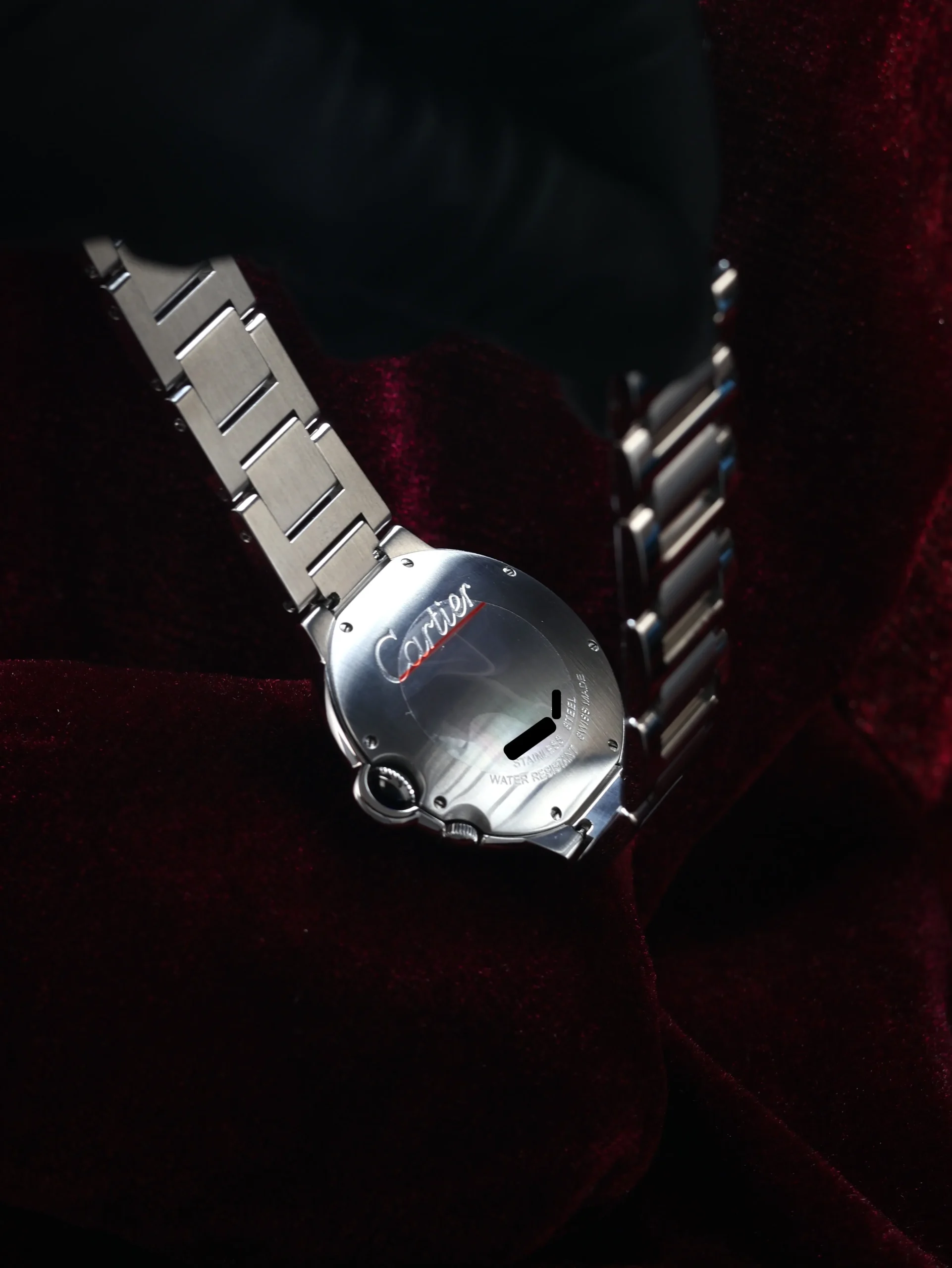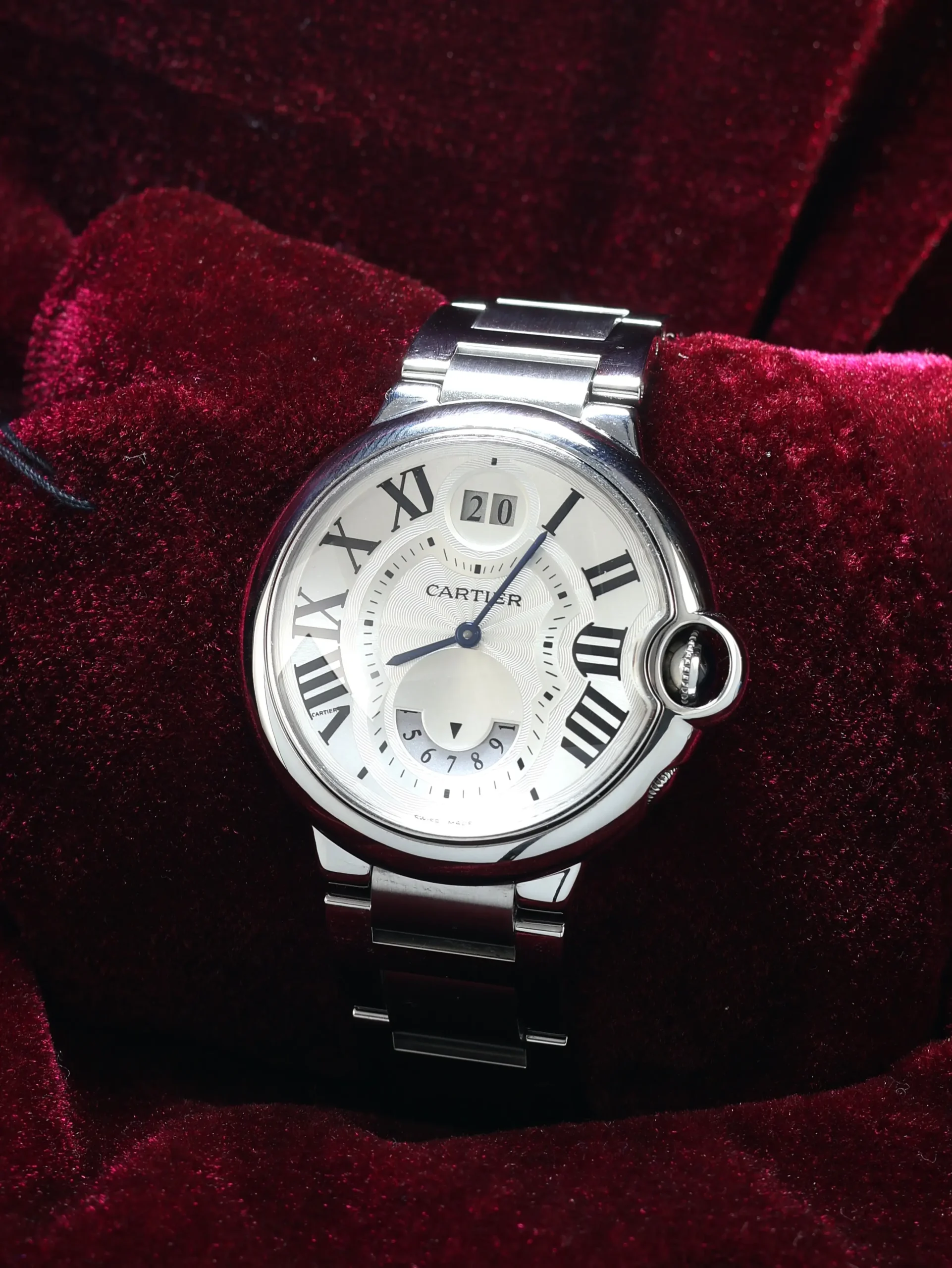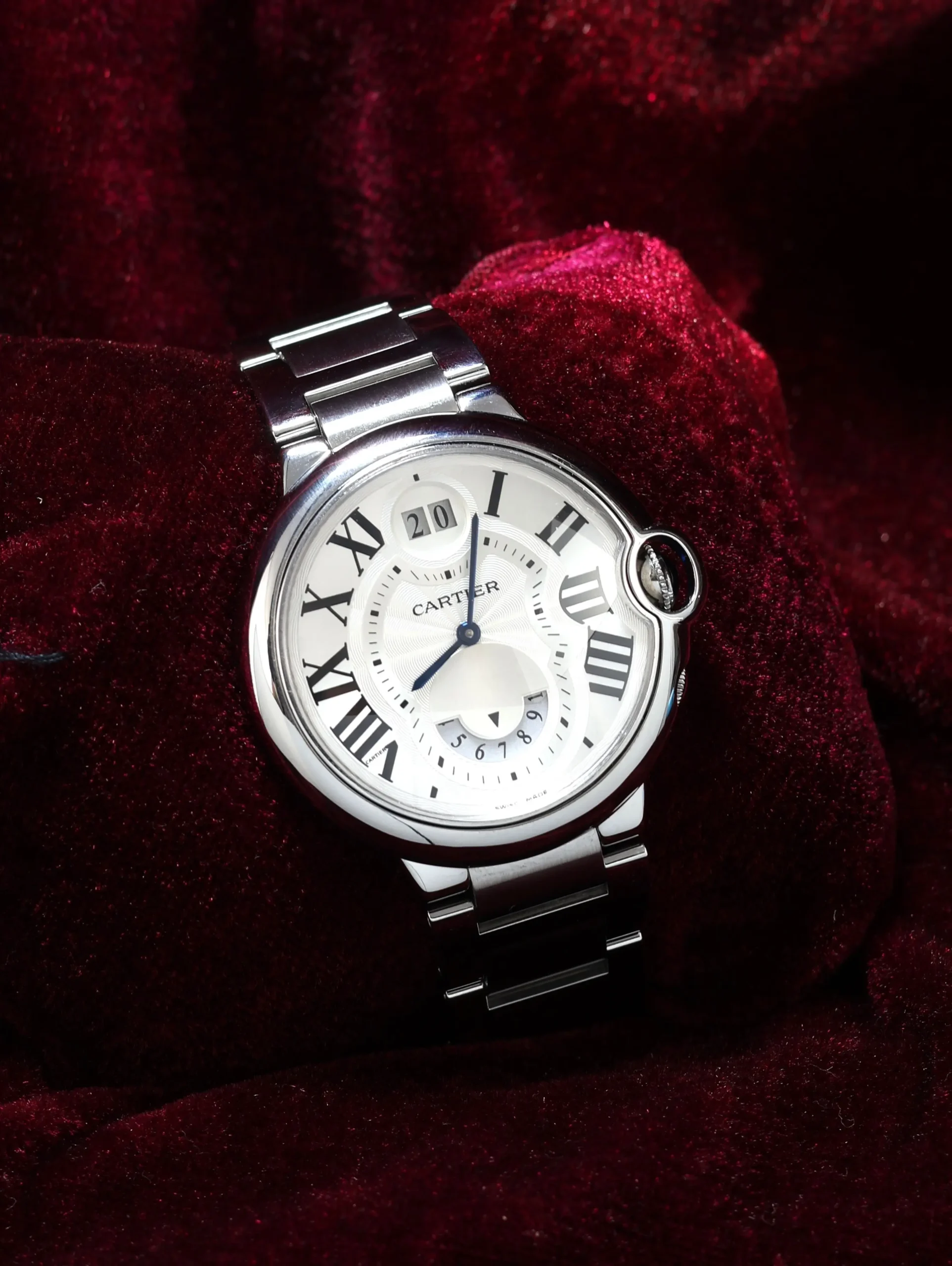Pre-owned Cartier Ballon Bleu (W6920011) quartz watch. This reference features a silver dial, encased in a 38mm steel case and bracelet. Features seconds, minutes, hours, date, and GMT dual-time functions. This watch shows light use. Functions and keeps time well. Comes with box and warranty papers dated 2017.