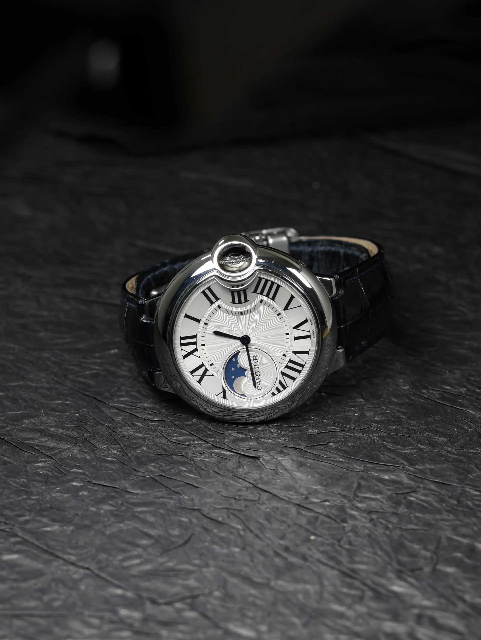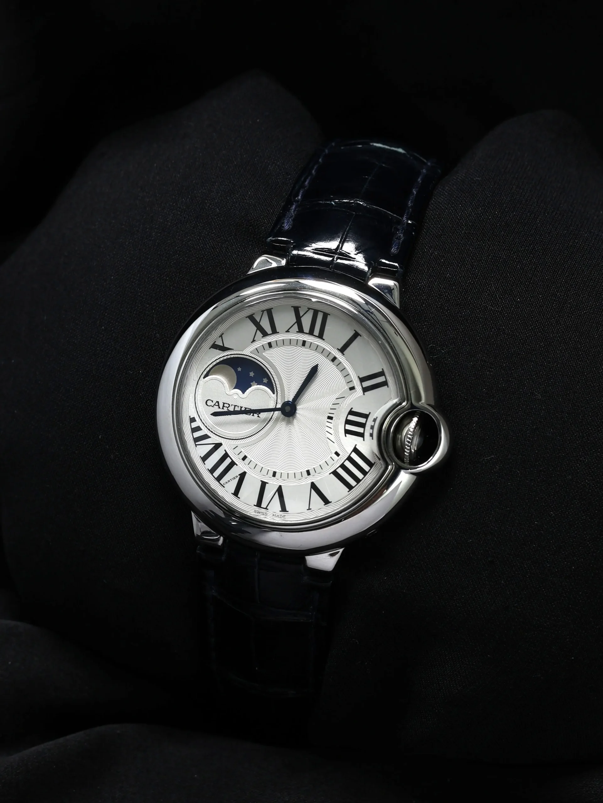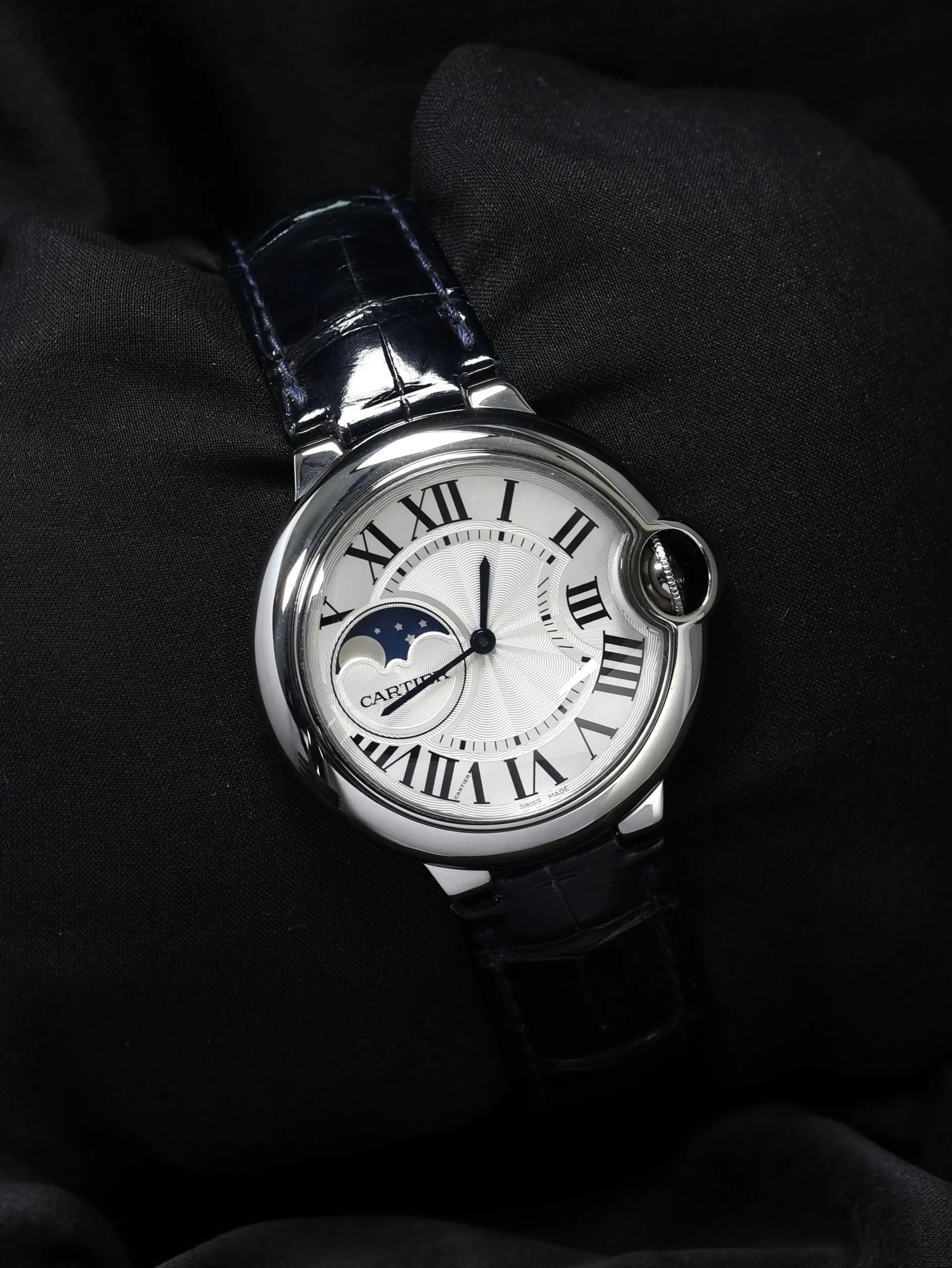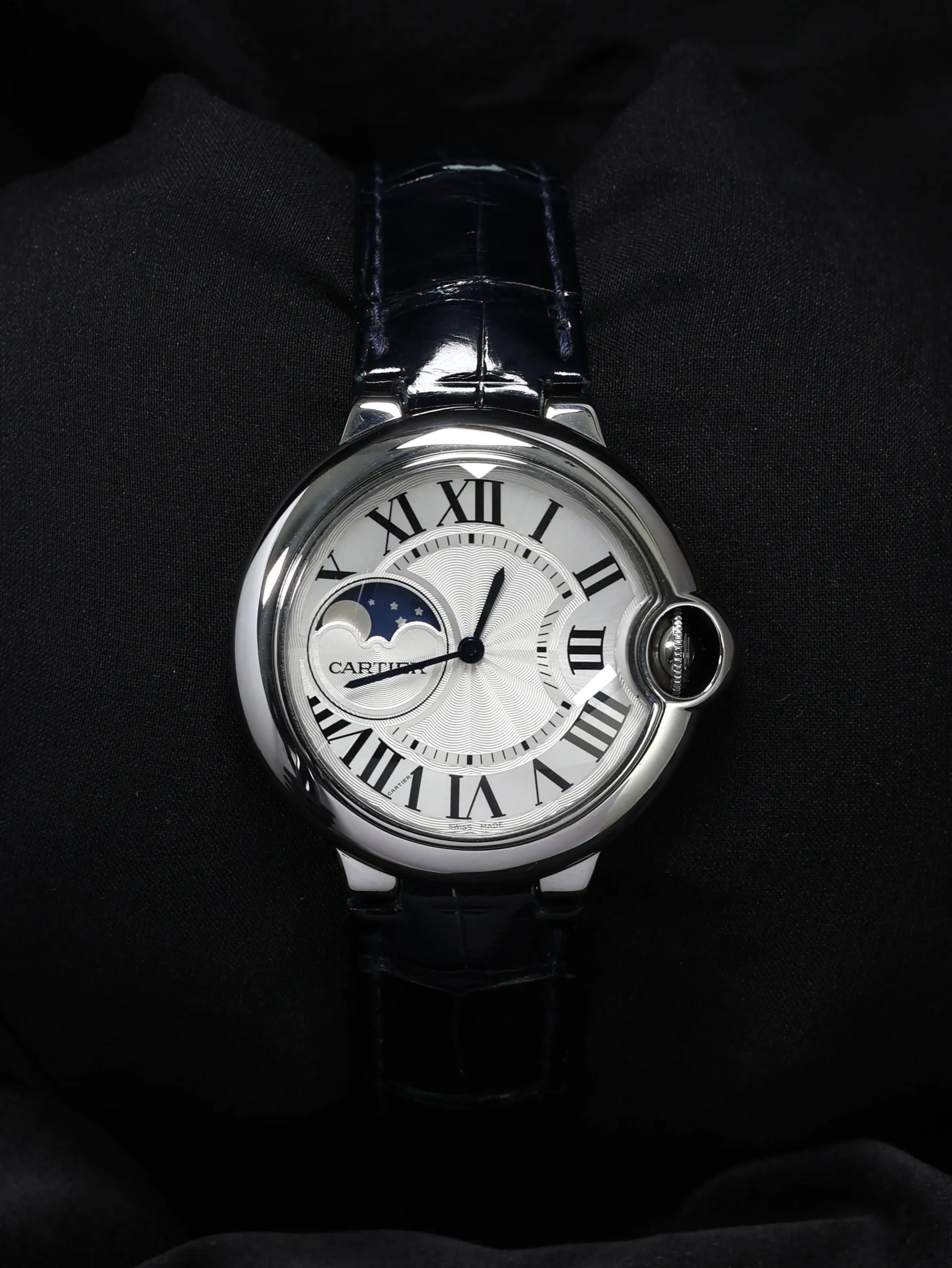 Pre-owned Cartier Ballon Bleu Moonphase (WSBB0020) self-winding automatic watch. This reference features a silver dial, encased in a 37mm steel case and blue straps. Features minutes, hours, and moon phase functions. This watch shows light use. Functions and keeps time well. Comes with original box and warranty papers dated 2018.