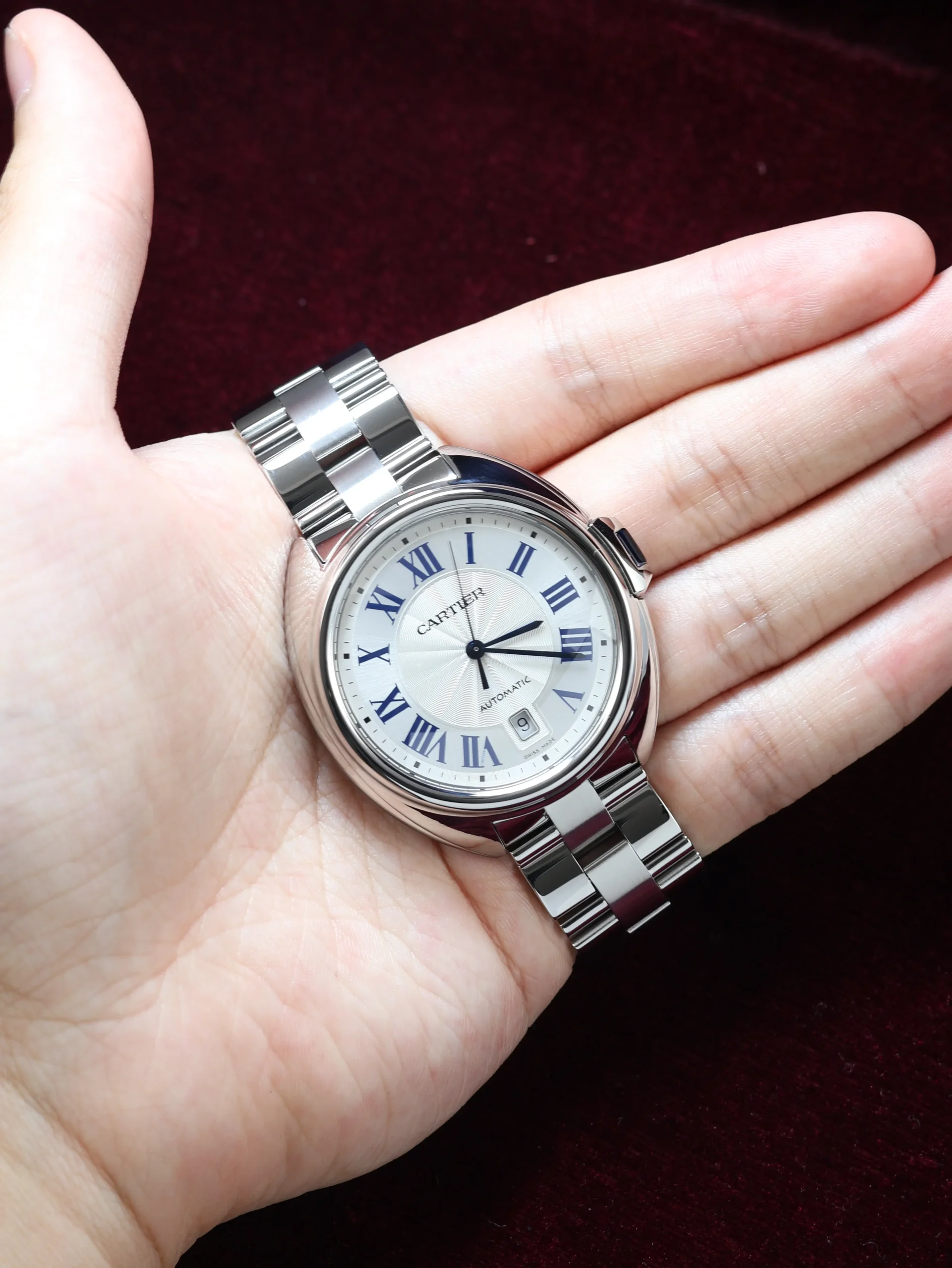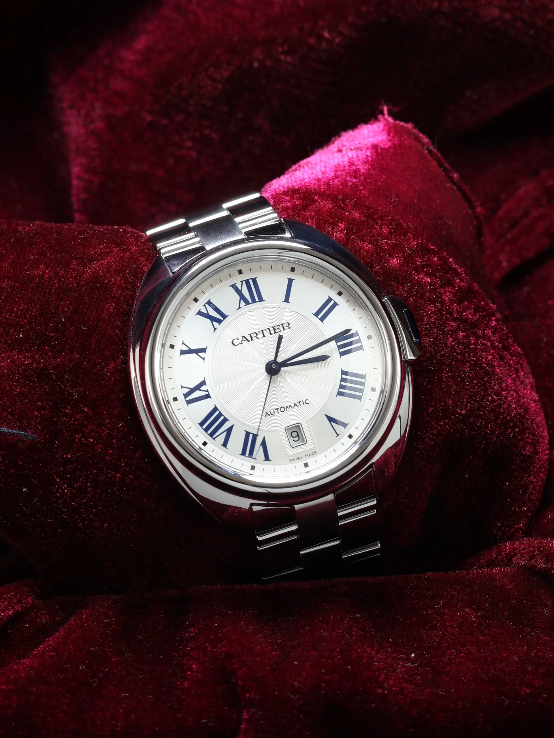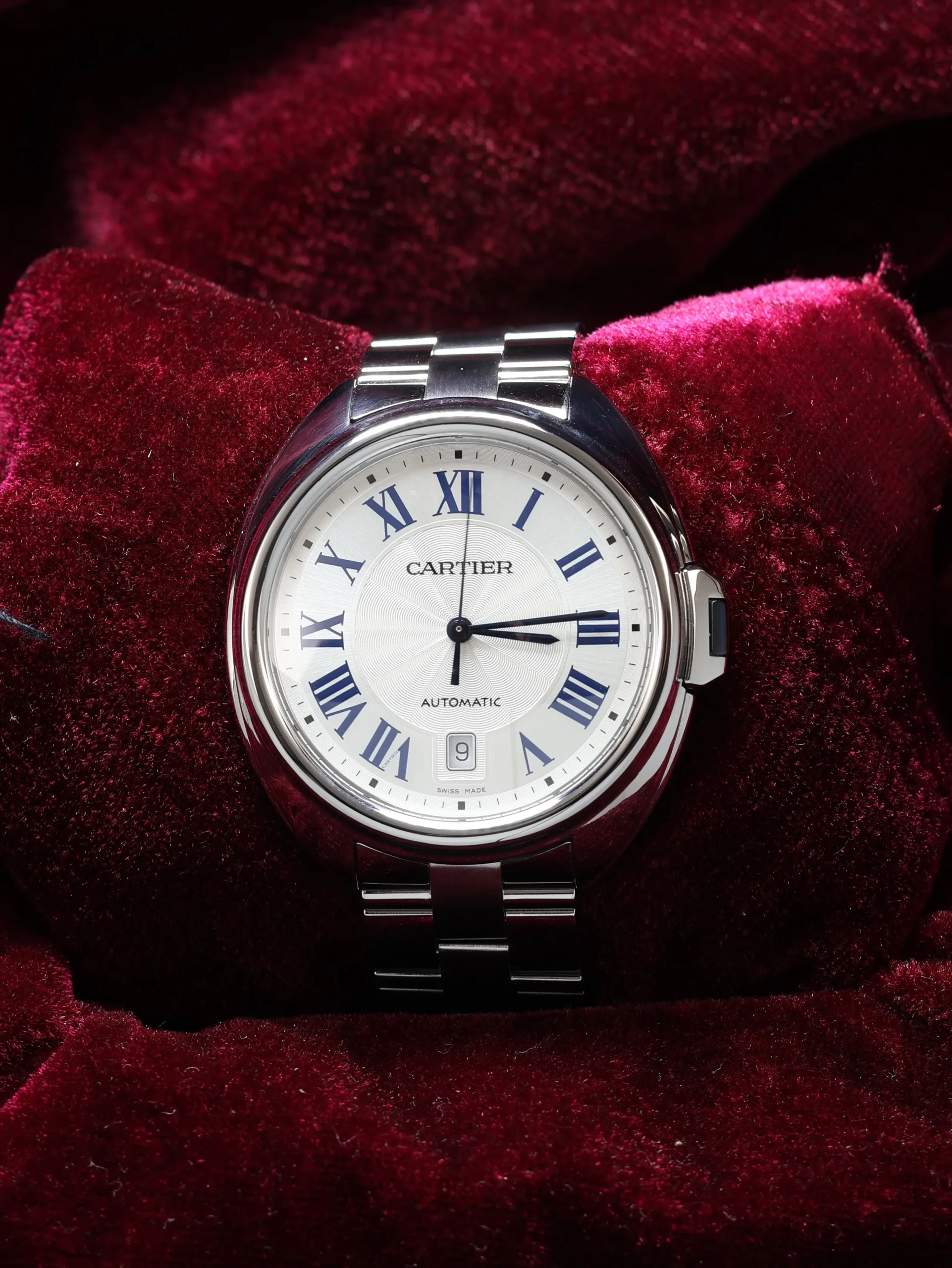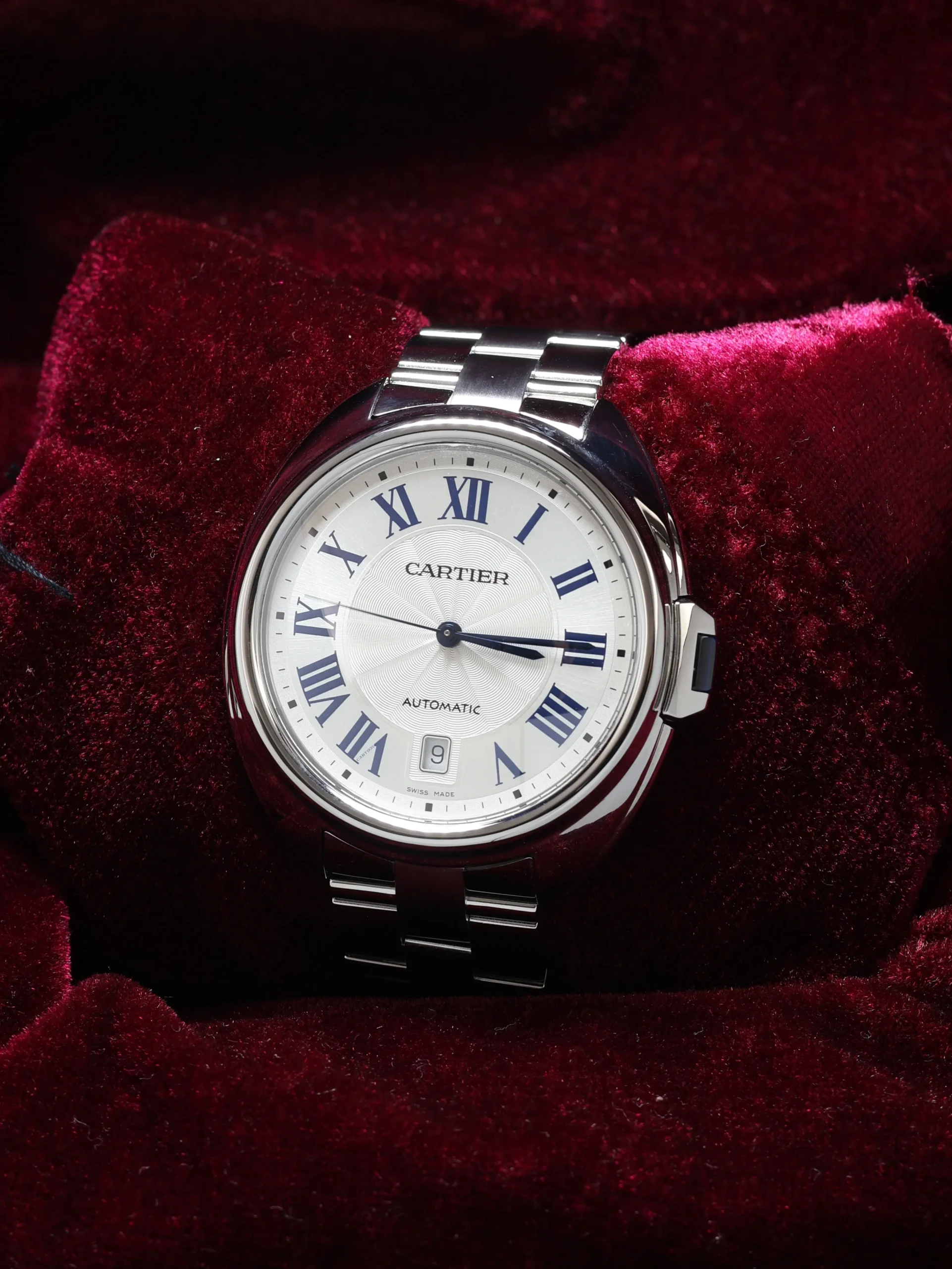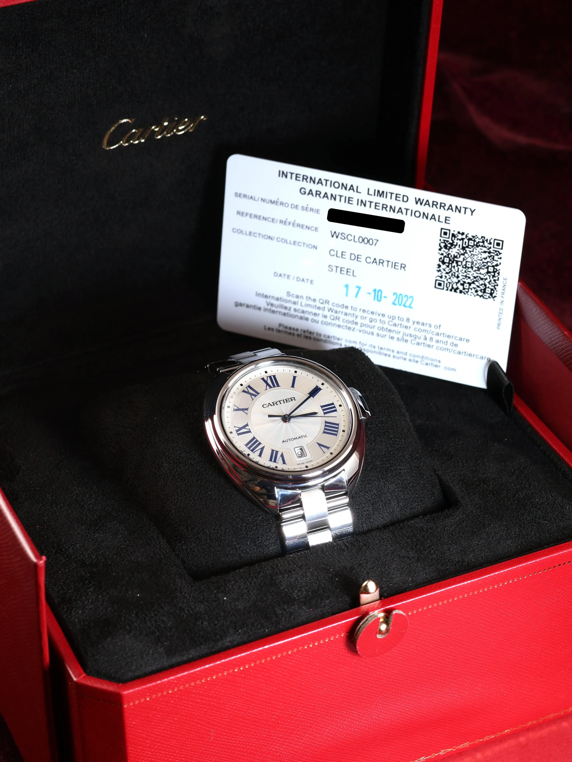 Pre-owned Cartier Clé de Cartier (WSCL0007) self-winding automatic watch. This reference features a silver dial, encased in a 40mm steel case and bracelet. Features seconds, minutes, hours, and date functions. This watch shows light use. Functions and keeps time well. Comes with original box and warranty papers dated 2022.