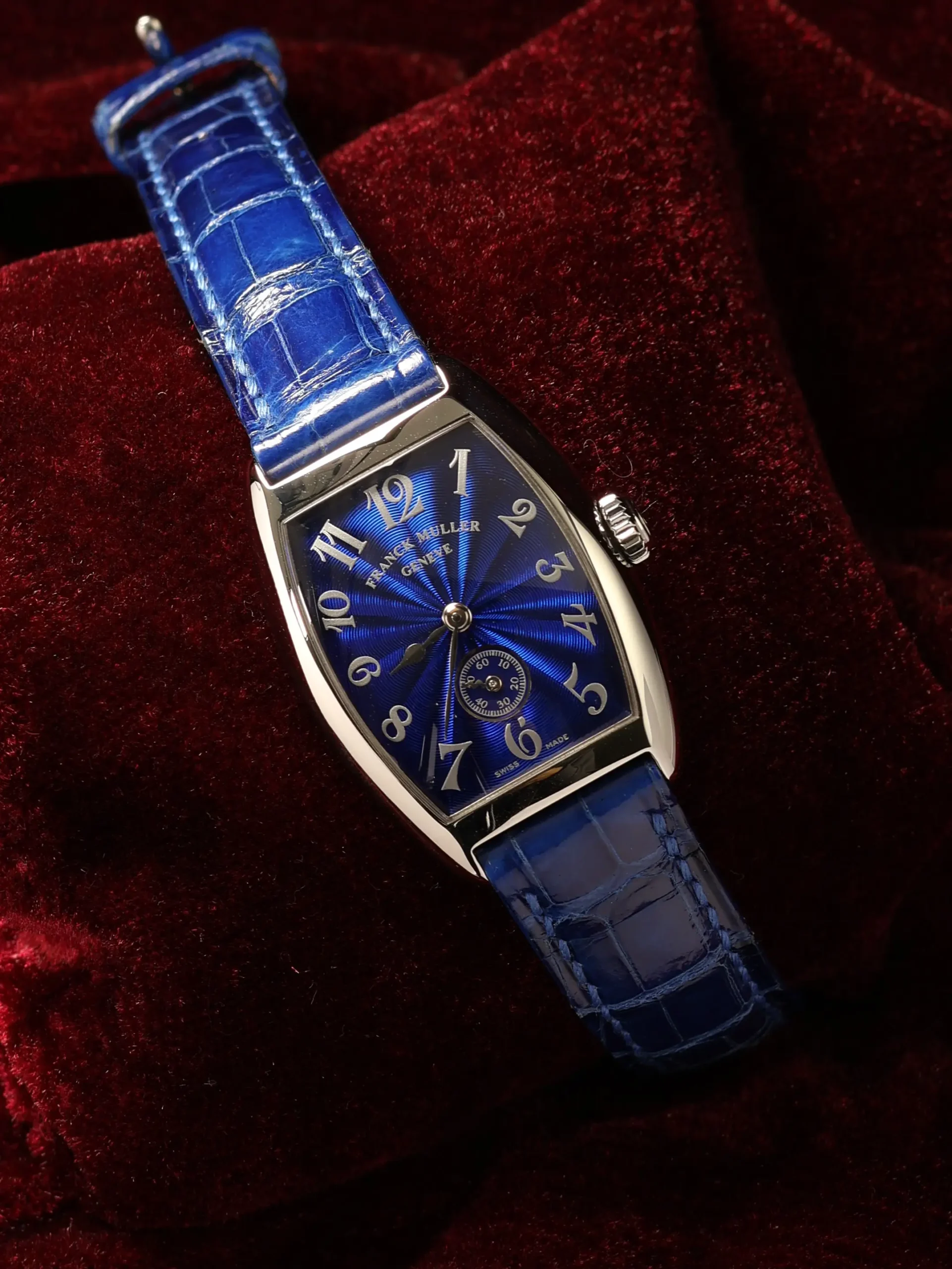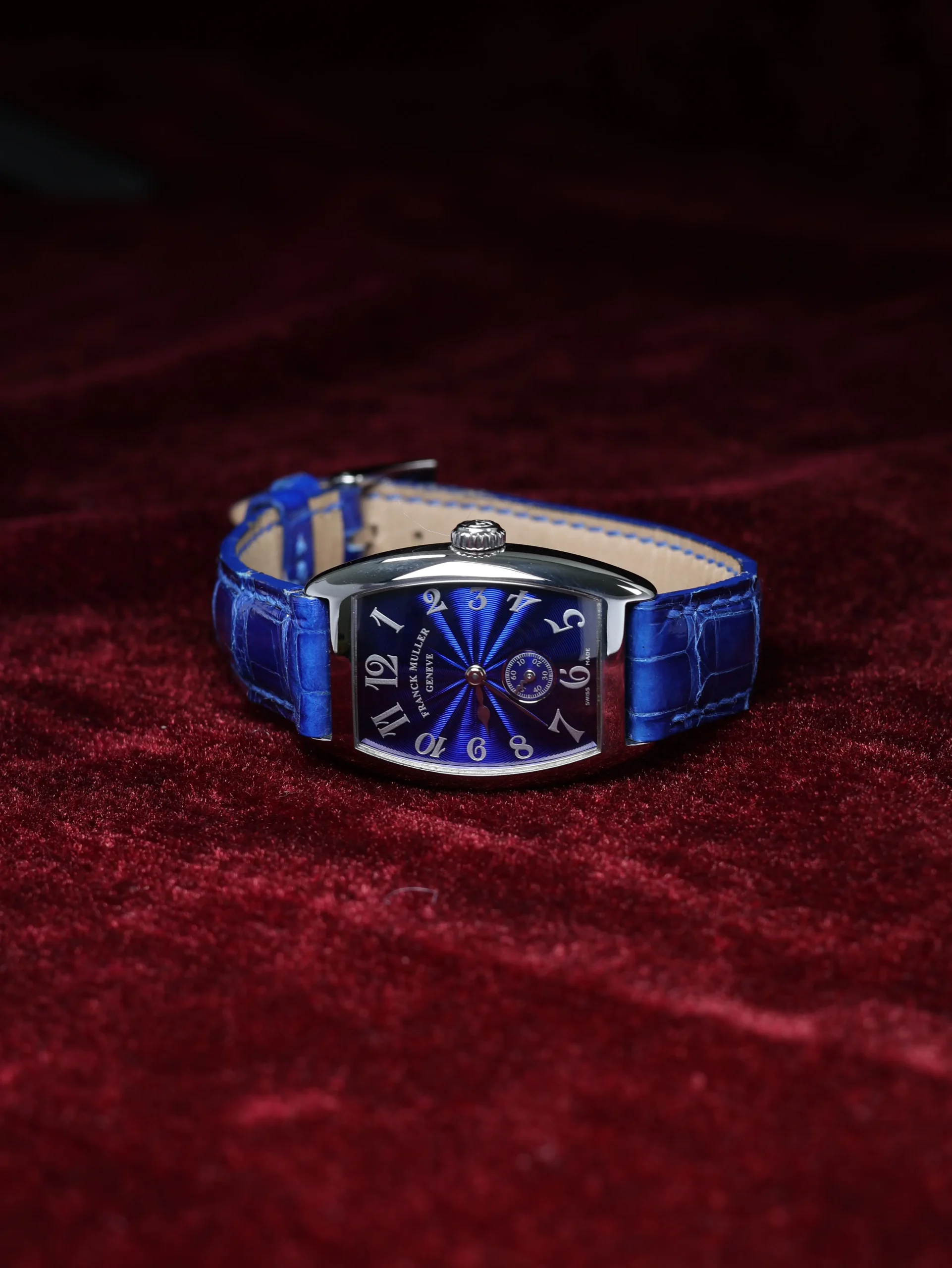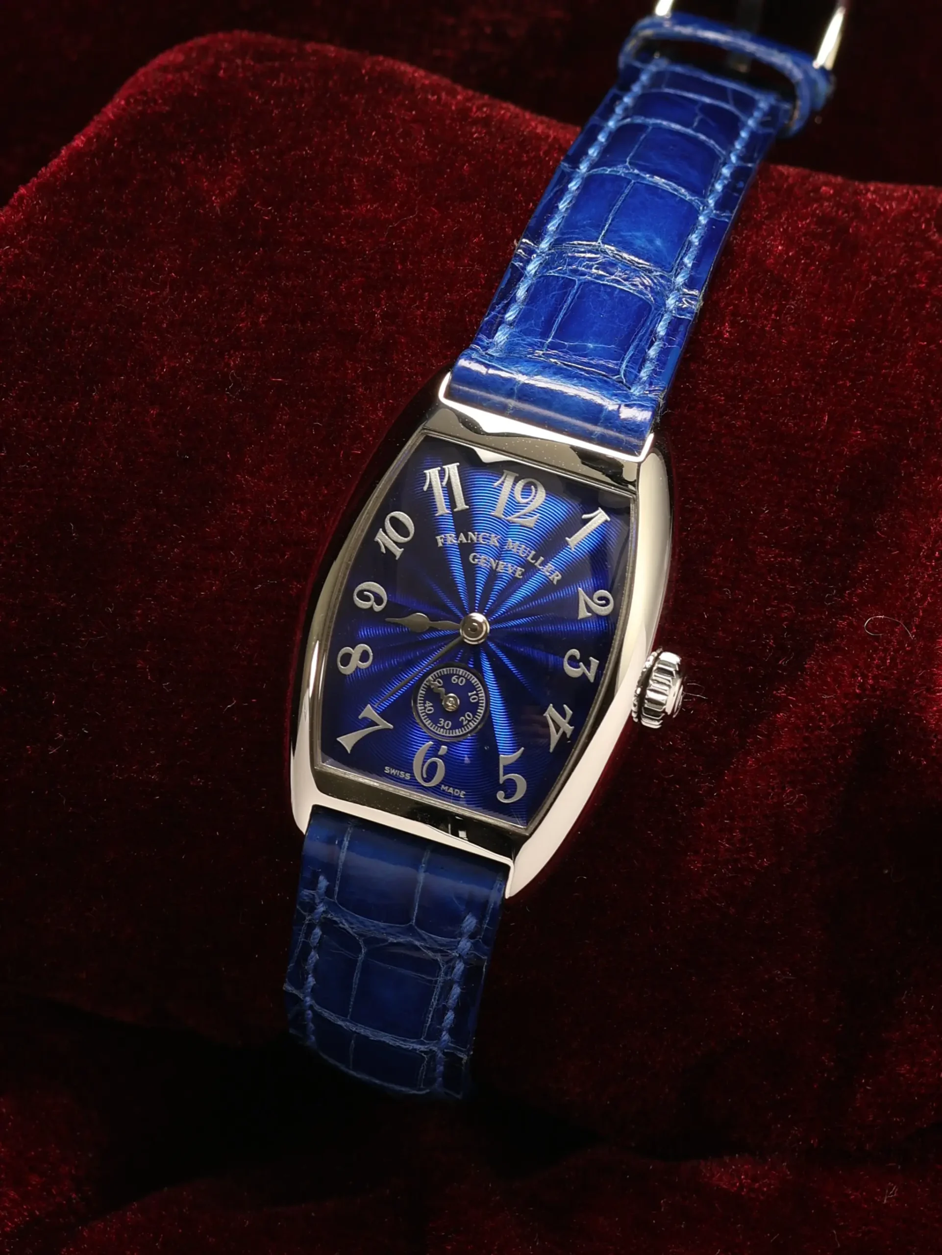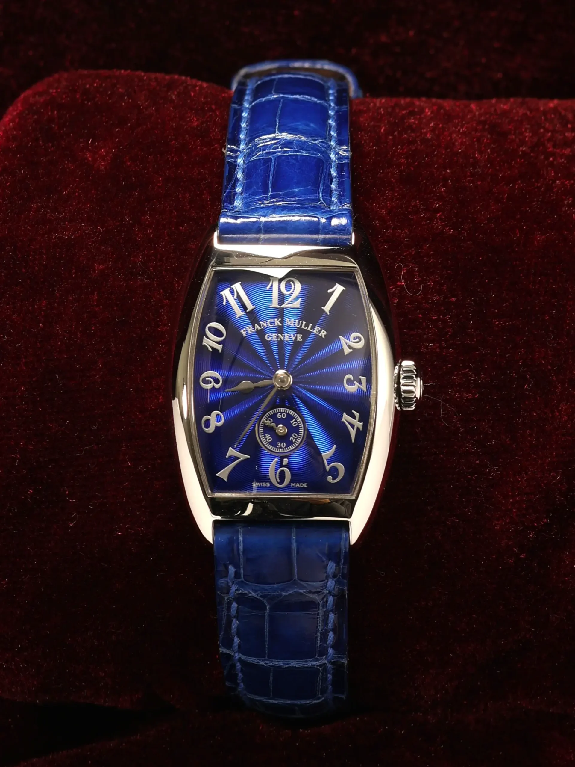 Pre-owned limited to 28 pieces Franck Muller Cintree Curvex (1750 S6) manual-winding watch. This reference features a blue sunburst guilloché dial, encased in a 35mm steel case and blue leather straps. Features seconds, minutes, and hours functions. This watch shows light use. Functions and keeps time well. Comes with box and warranty papers dated 2000.