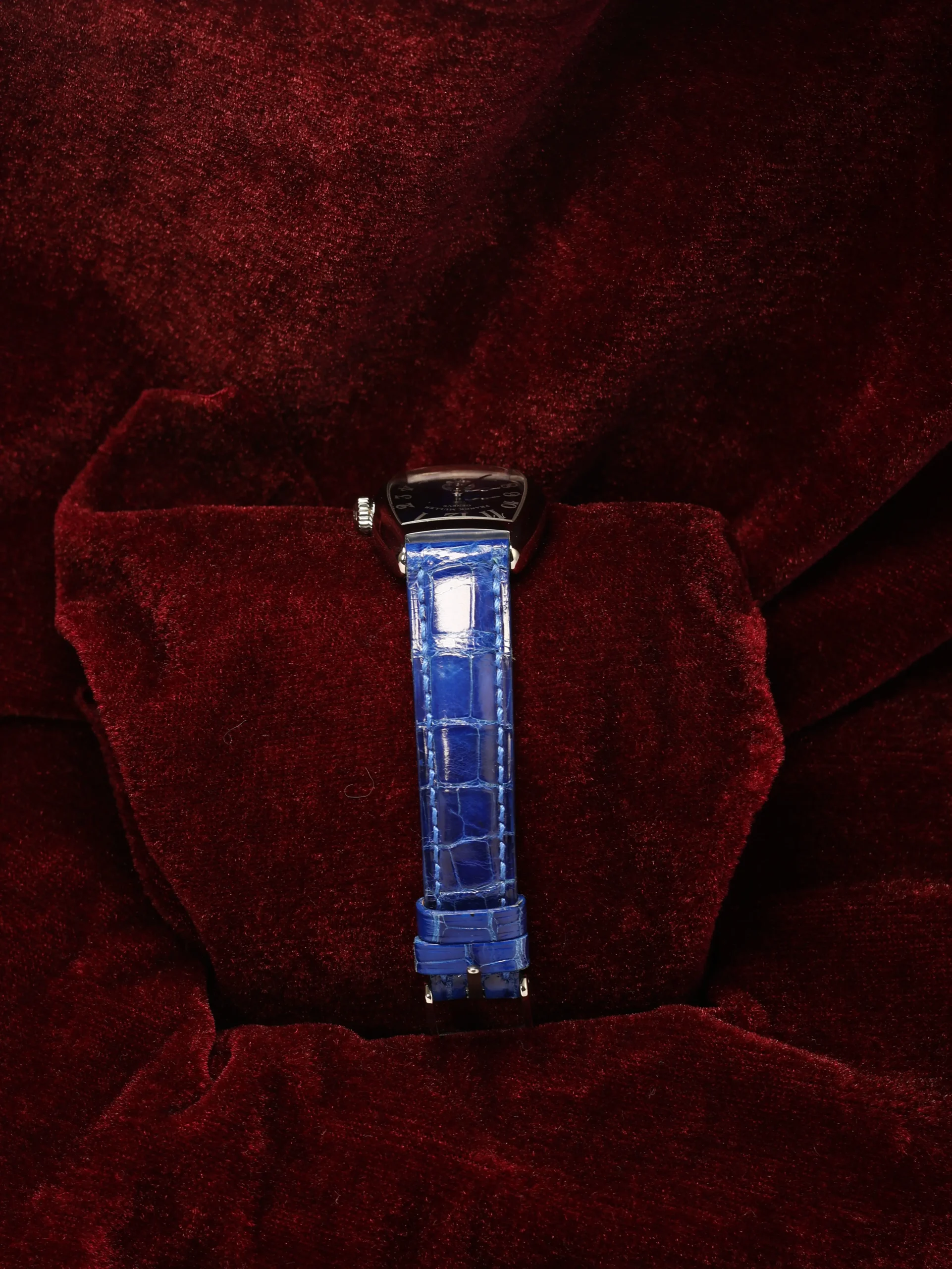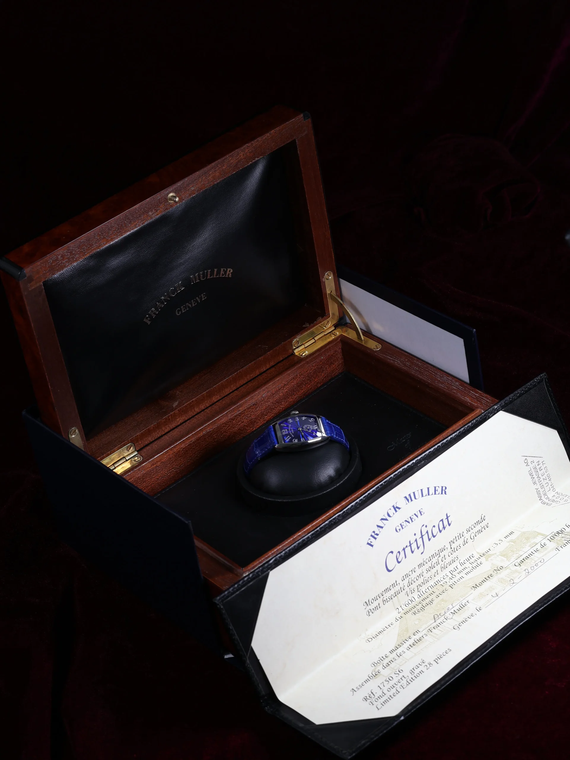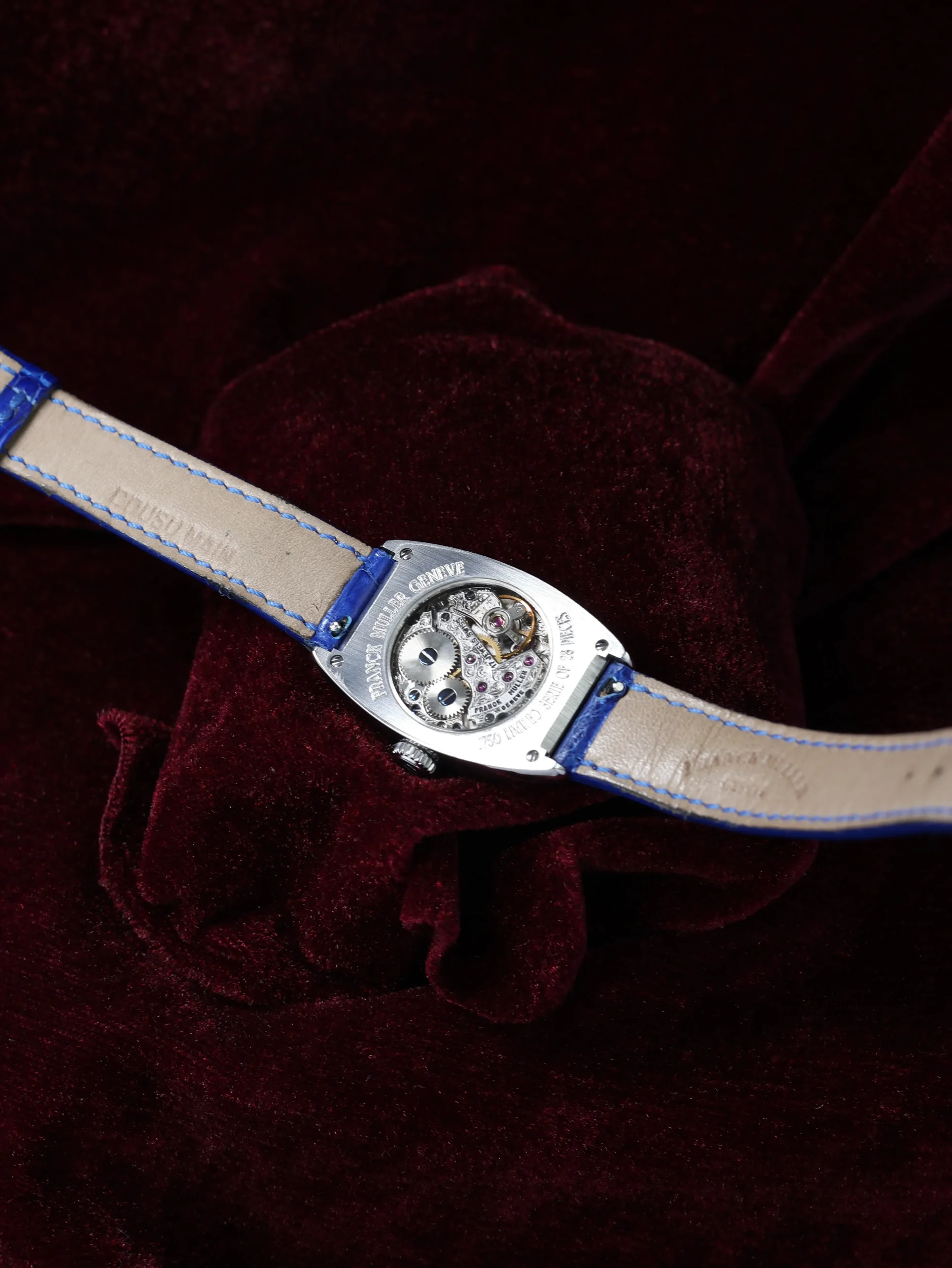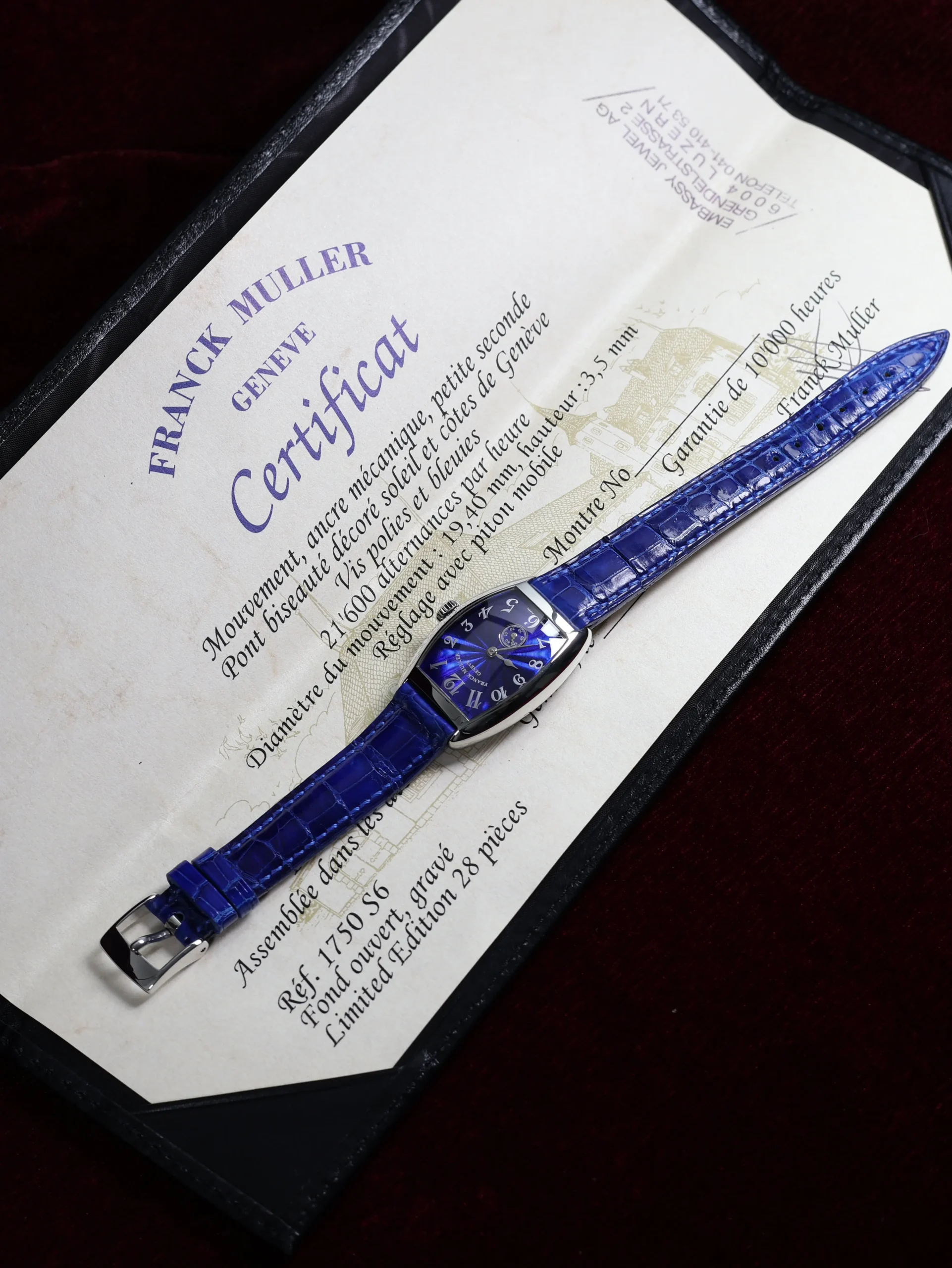 Pre-owned limited to 28 pieces Franck Muller Cintree Curvex (1750 S6) manual-winding watch. This reference features a blue sunburst guilloché dial, encased in a 35mm steel case and blue leather straps. Features seconds, minutes, and hours functions. This watch shows light use. Functions and keeps time well. Comes with box and warranty papers dated 2000.
