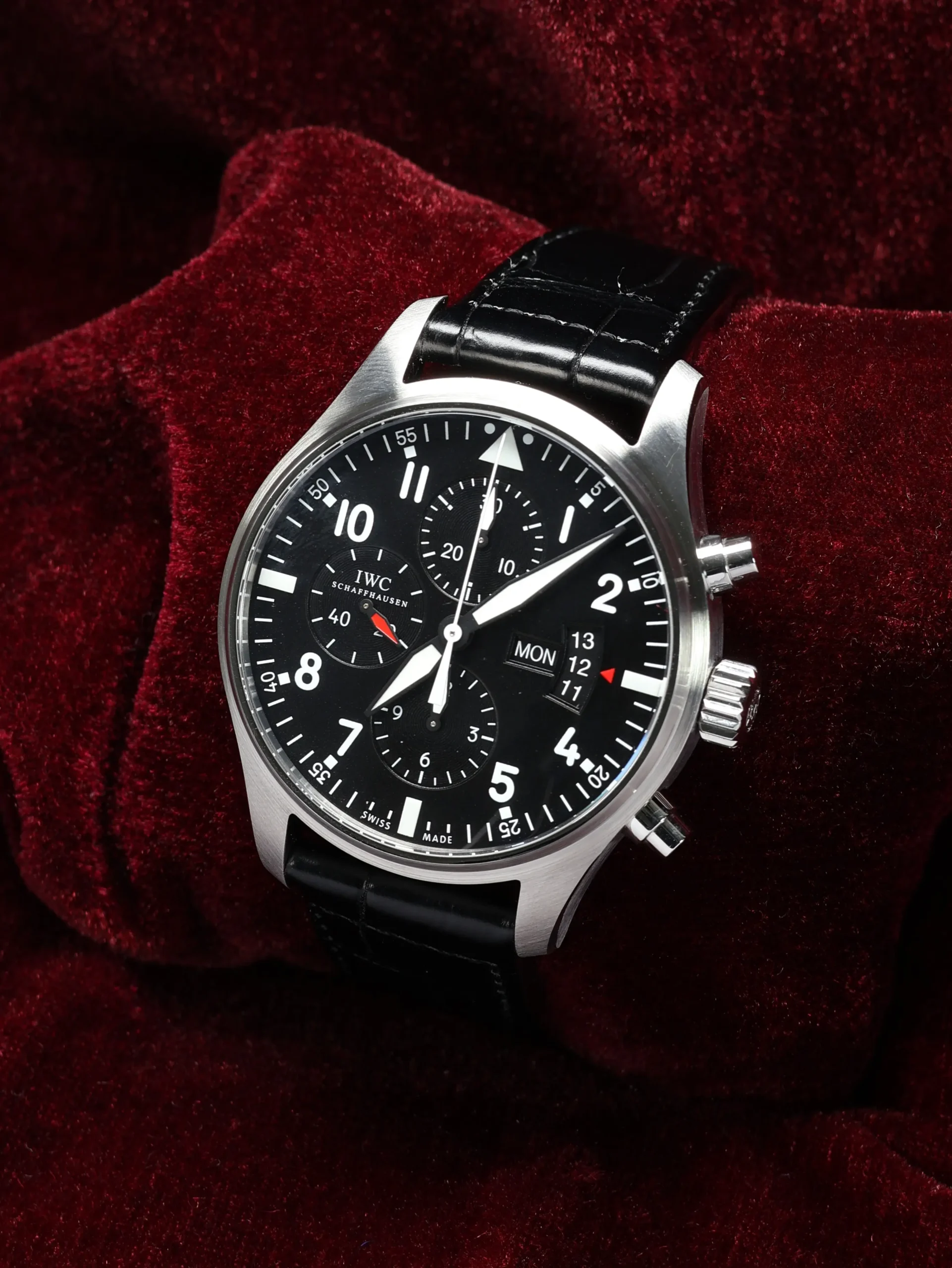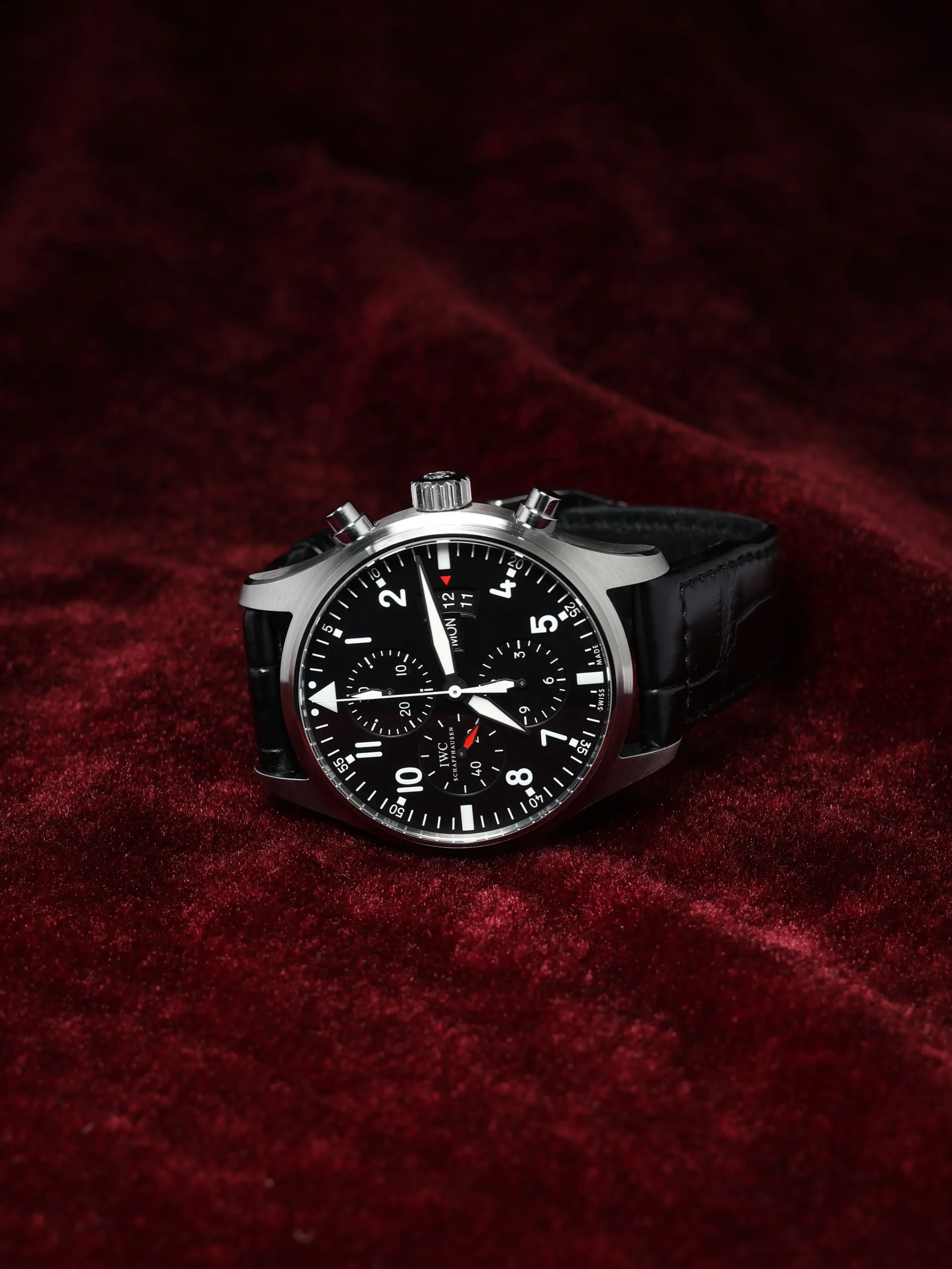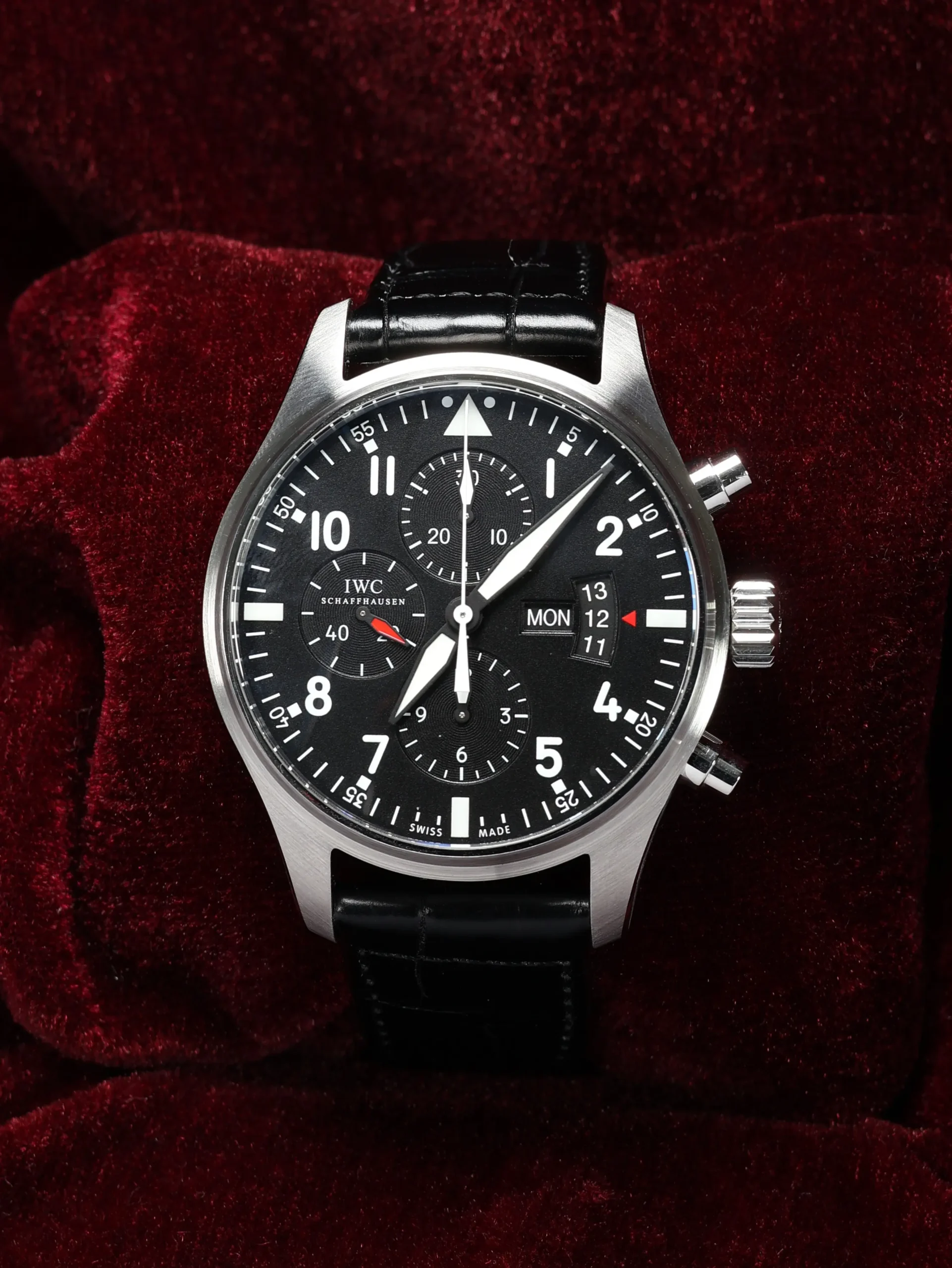 Pre-owned IWC Pilot’s Watch Mark XVIII (IW3270-11) self-winding automatic watch. This reference features a black dial, encased in a 40mm steel case and black straps. Features seconds, minutes, hours, and date functions. This watch shows light use. Functions and keeps time well. Comes with warranty papers dated 2018.