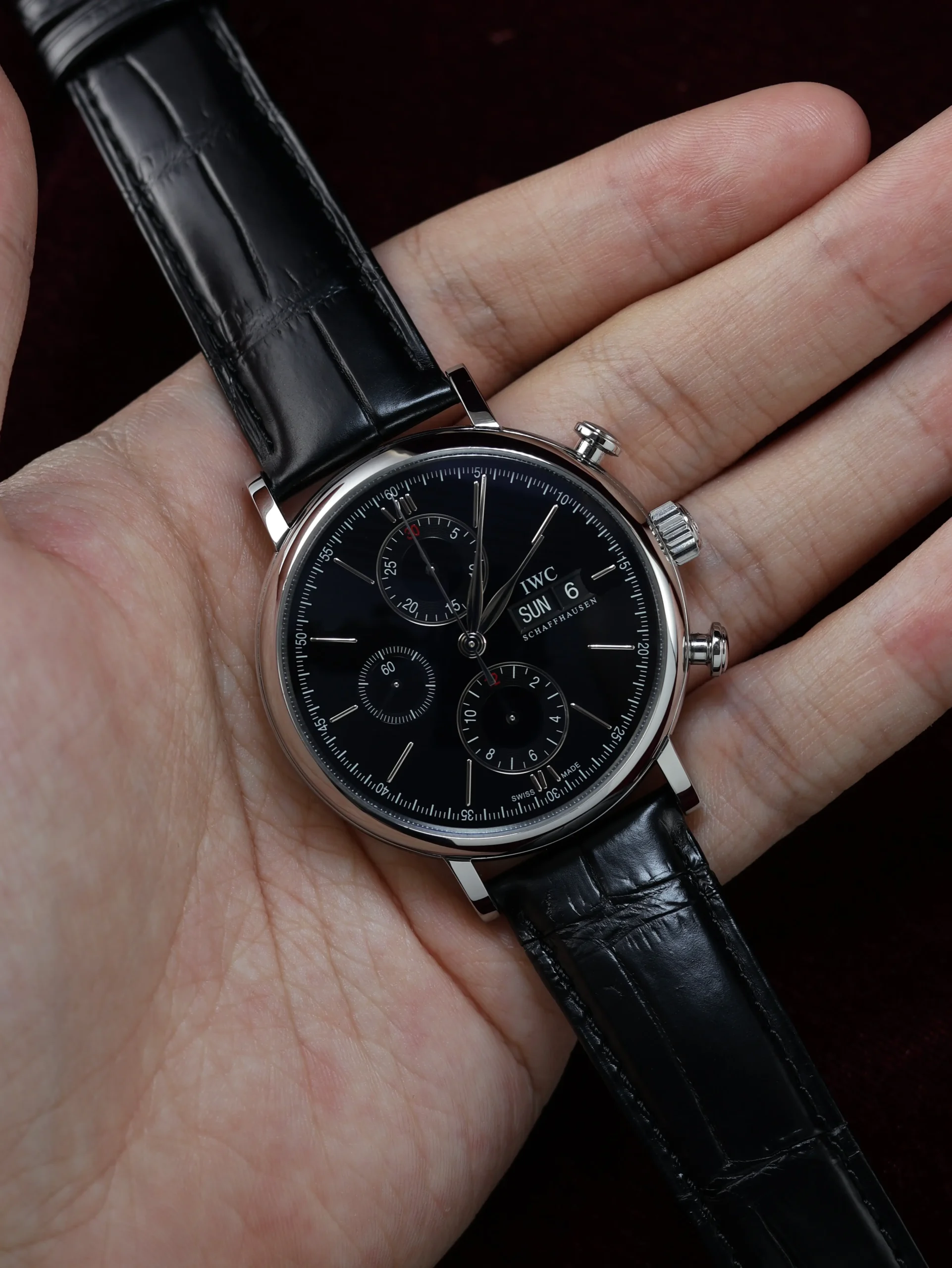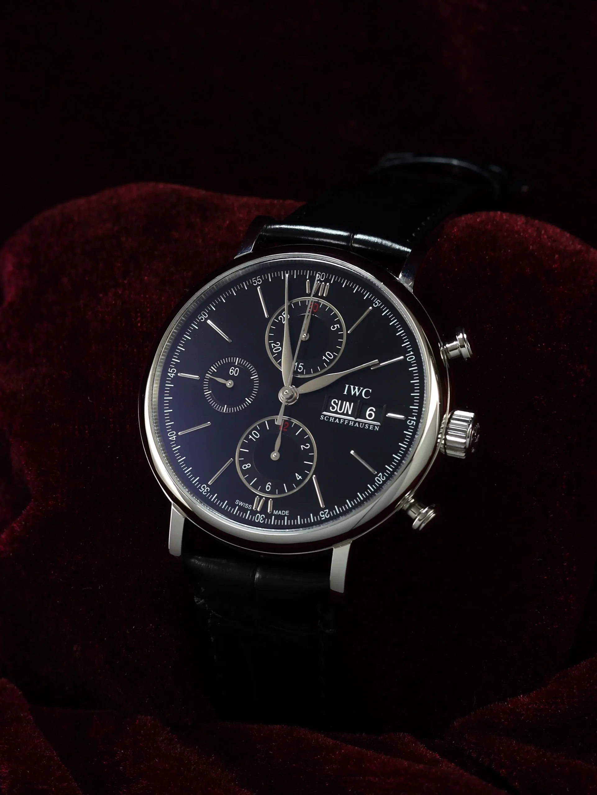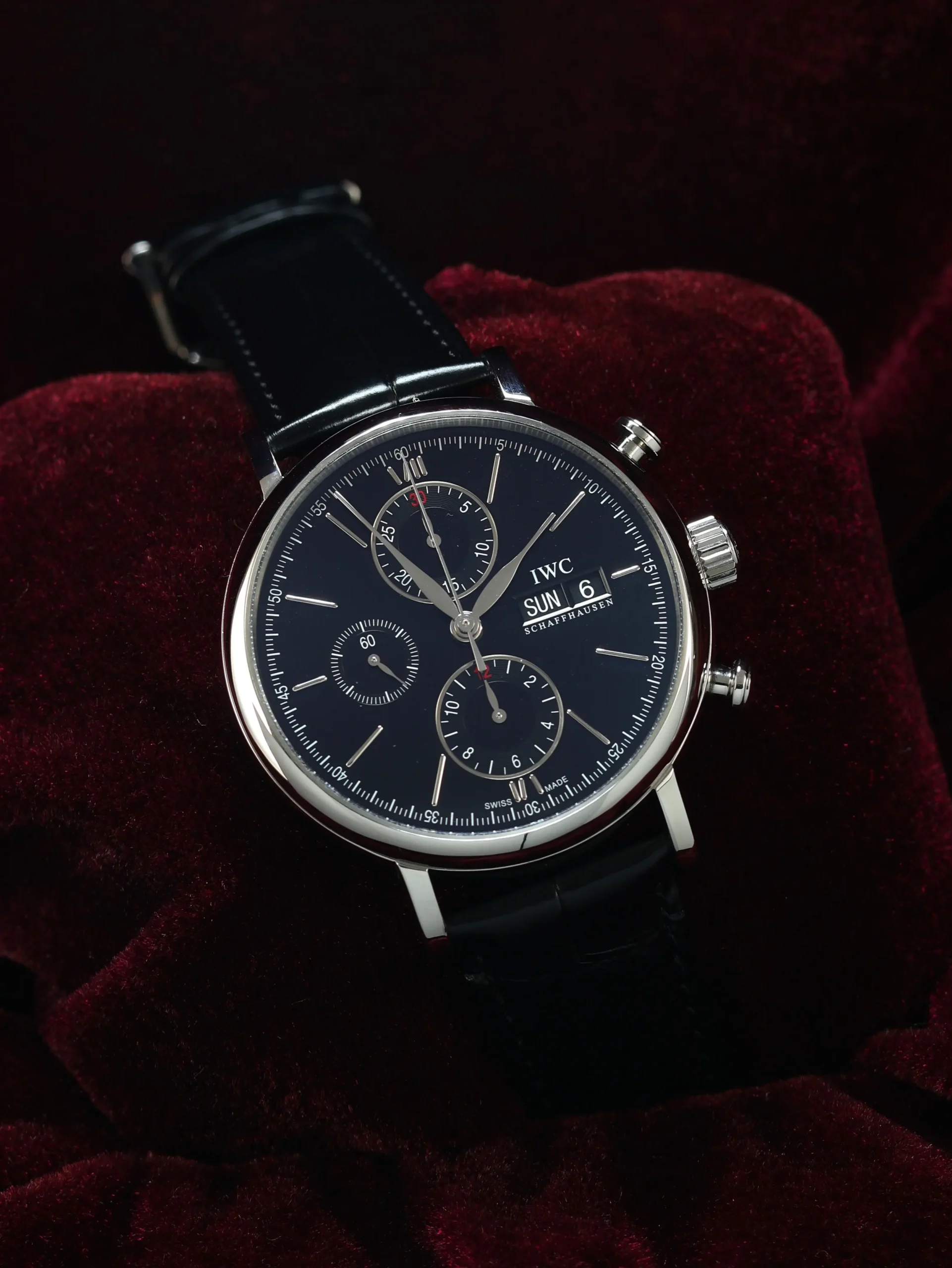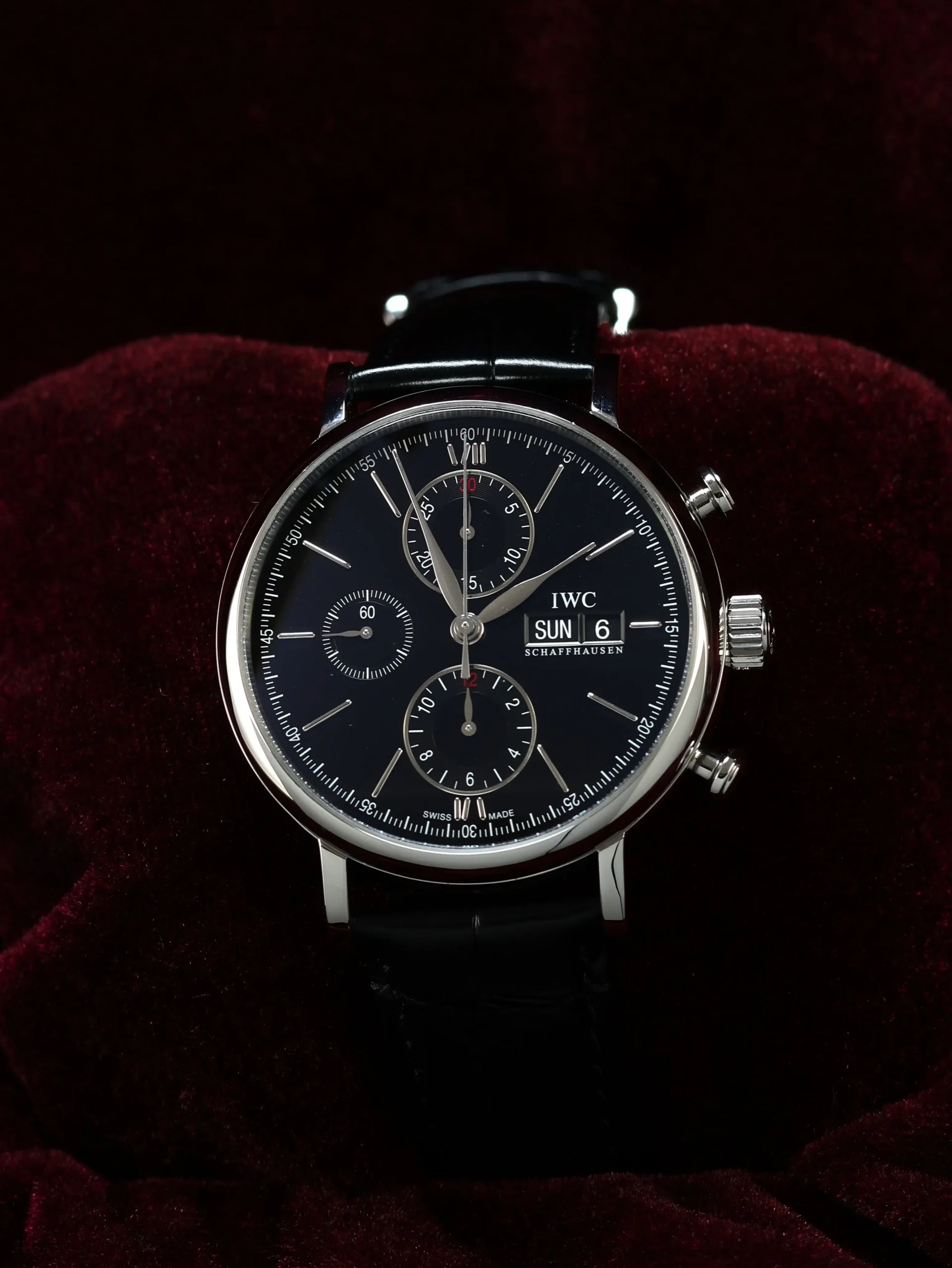 Pre-owned IWC Portofino Chronograph (IW3910-02) self-winding automatic watch. This reference features a black dial, encased in a 42mm steel case and black straps. Features seconds, minutes, hours, day, date, and chronograph functions. This watch shows light use. Functions and keeps time well. Comes with box and warranty papers dated 2016.