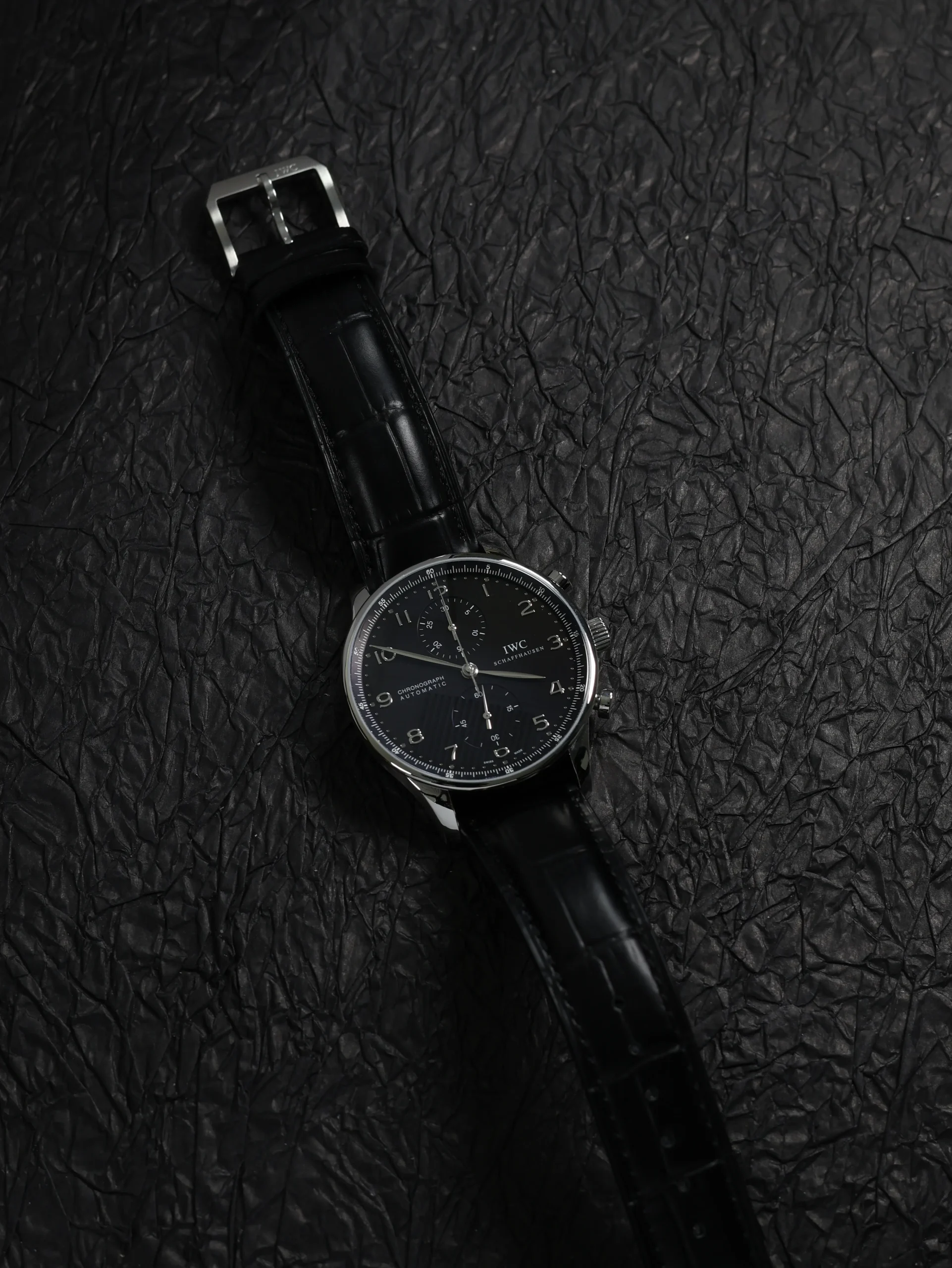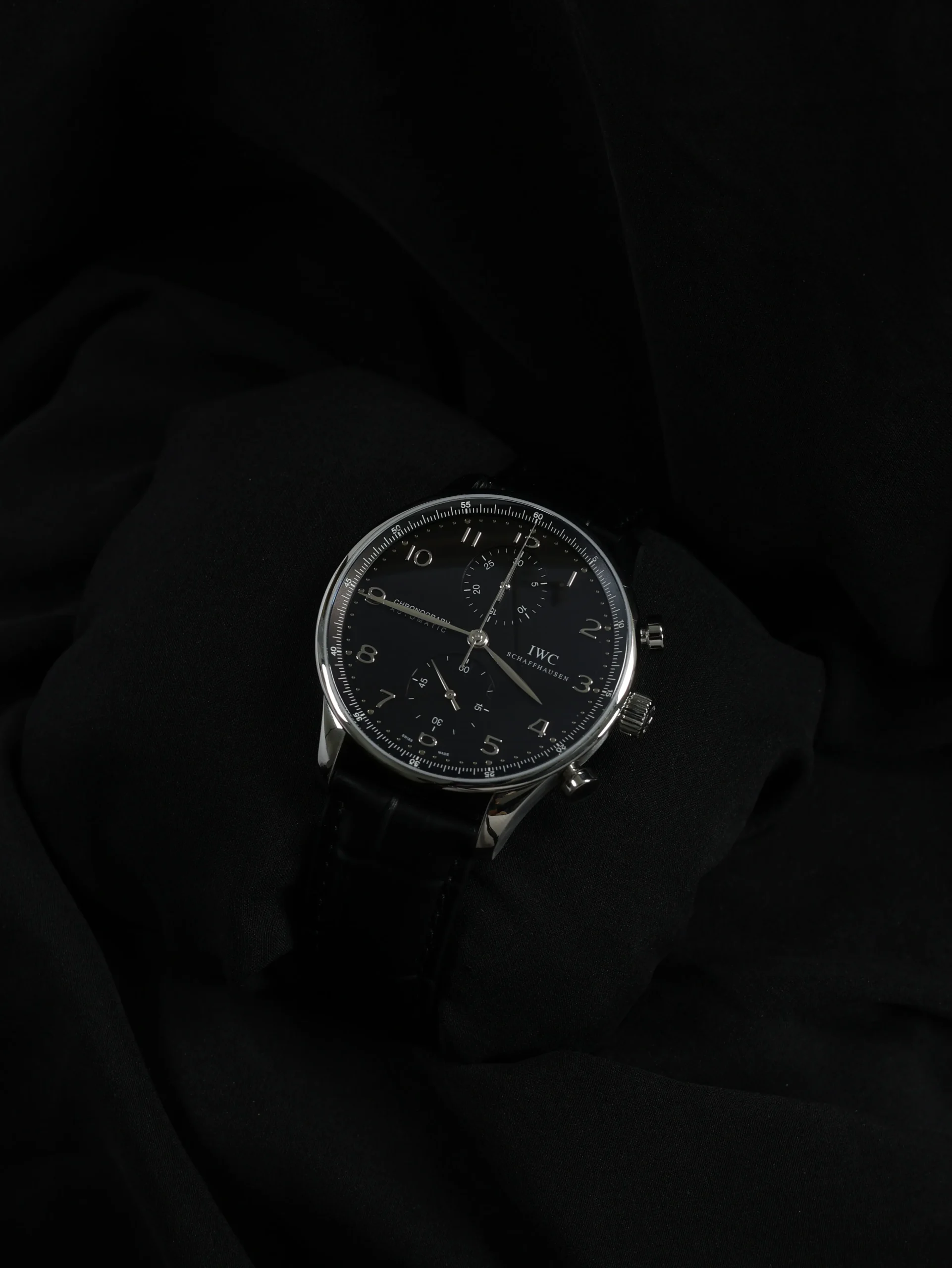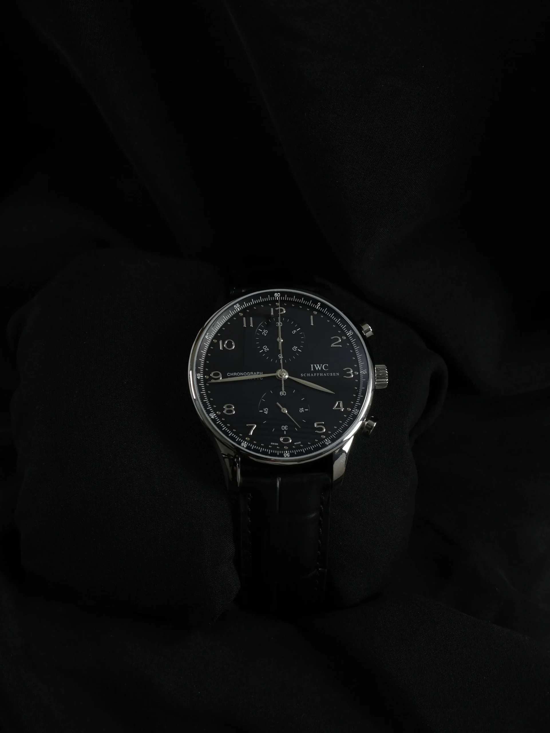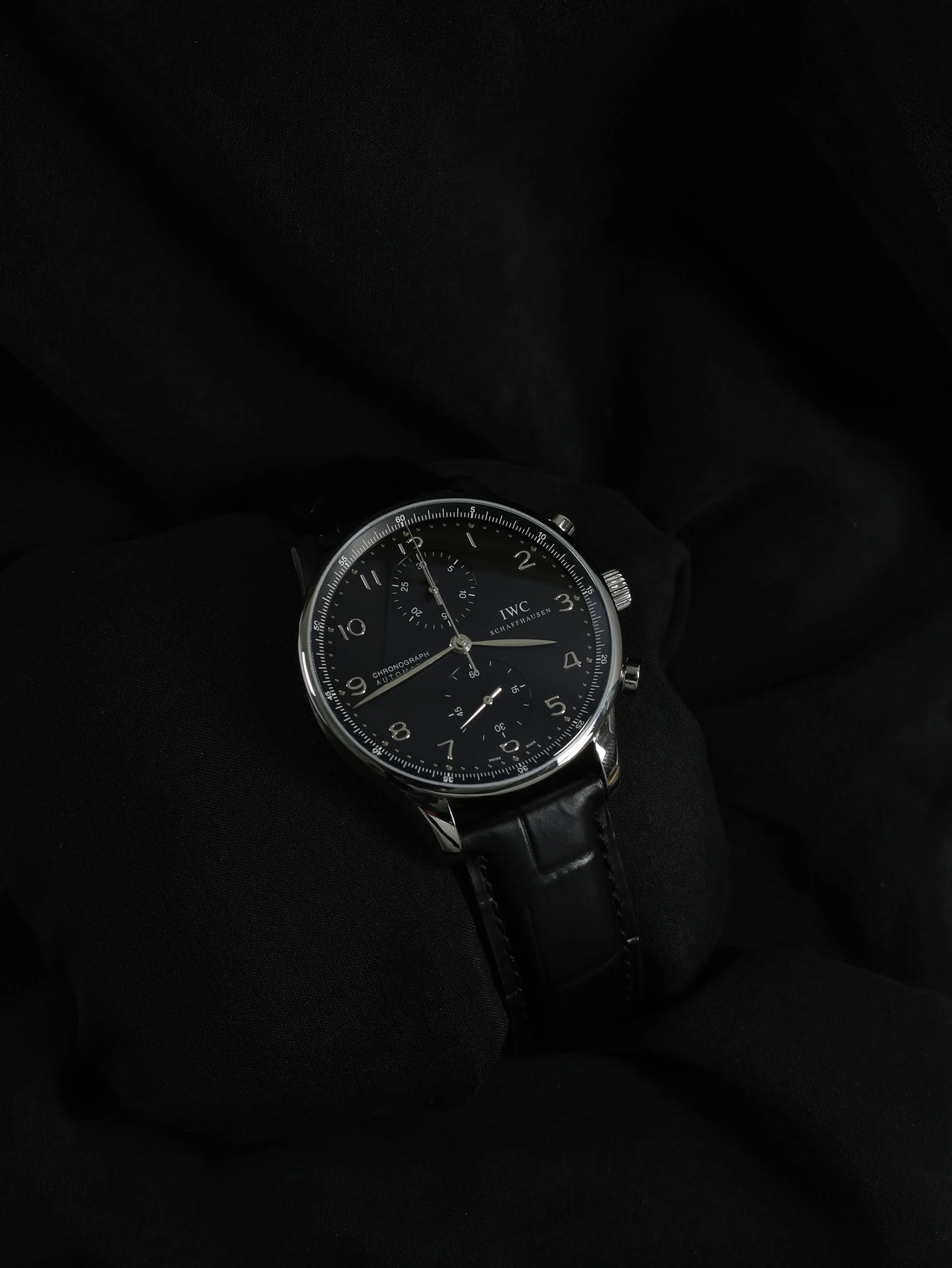 Pre-owned IWC Portugieser Chronograph (IW371438) self-winding automatic watch. This reference features a black dial, encased in a 41mm steel case and black straps. Features seconds, minutes, hours and chronograph functions. This watch shows light use. Functions and keeps time well. Comes with original box and warranty papers dated 2014.
