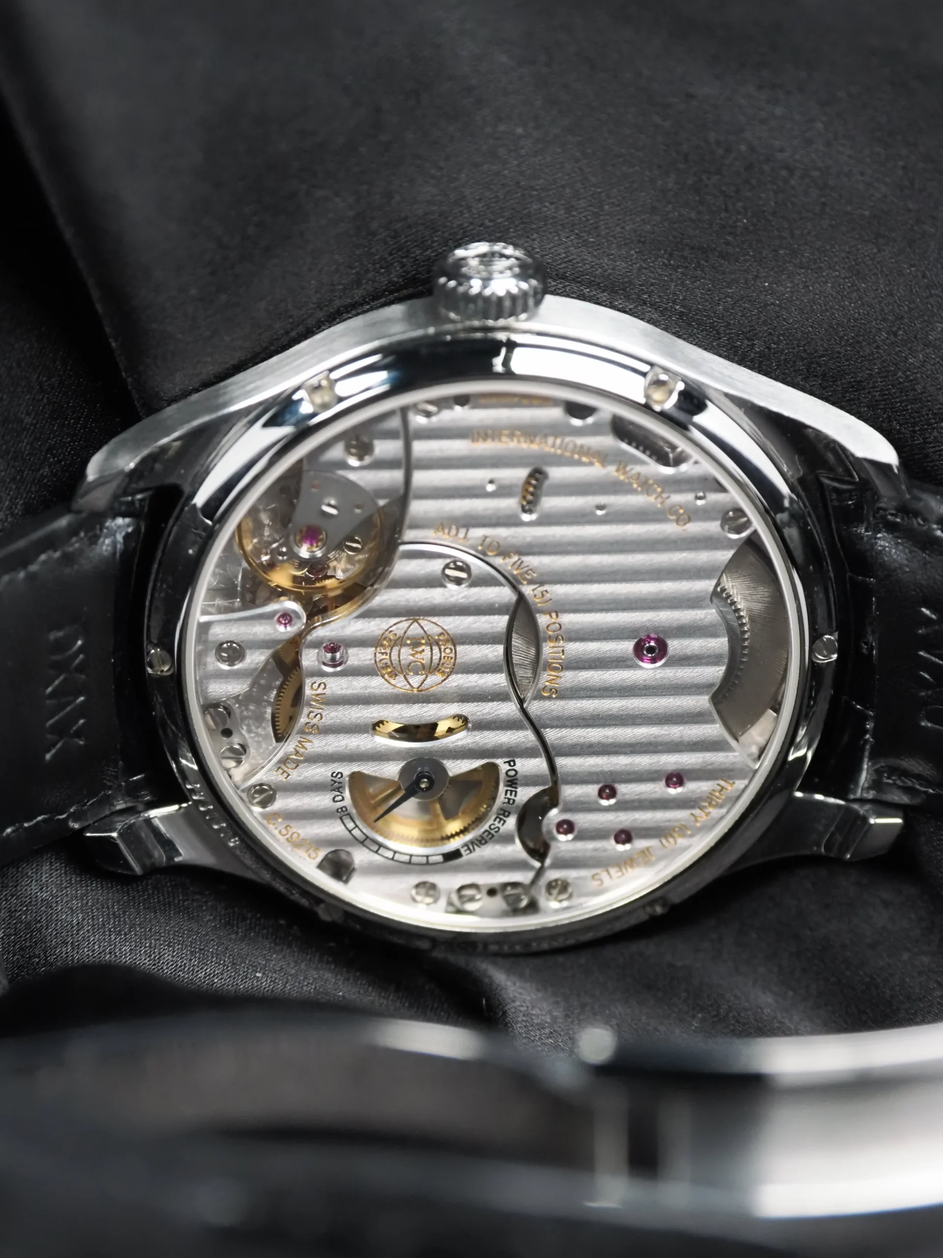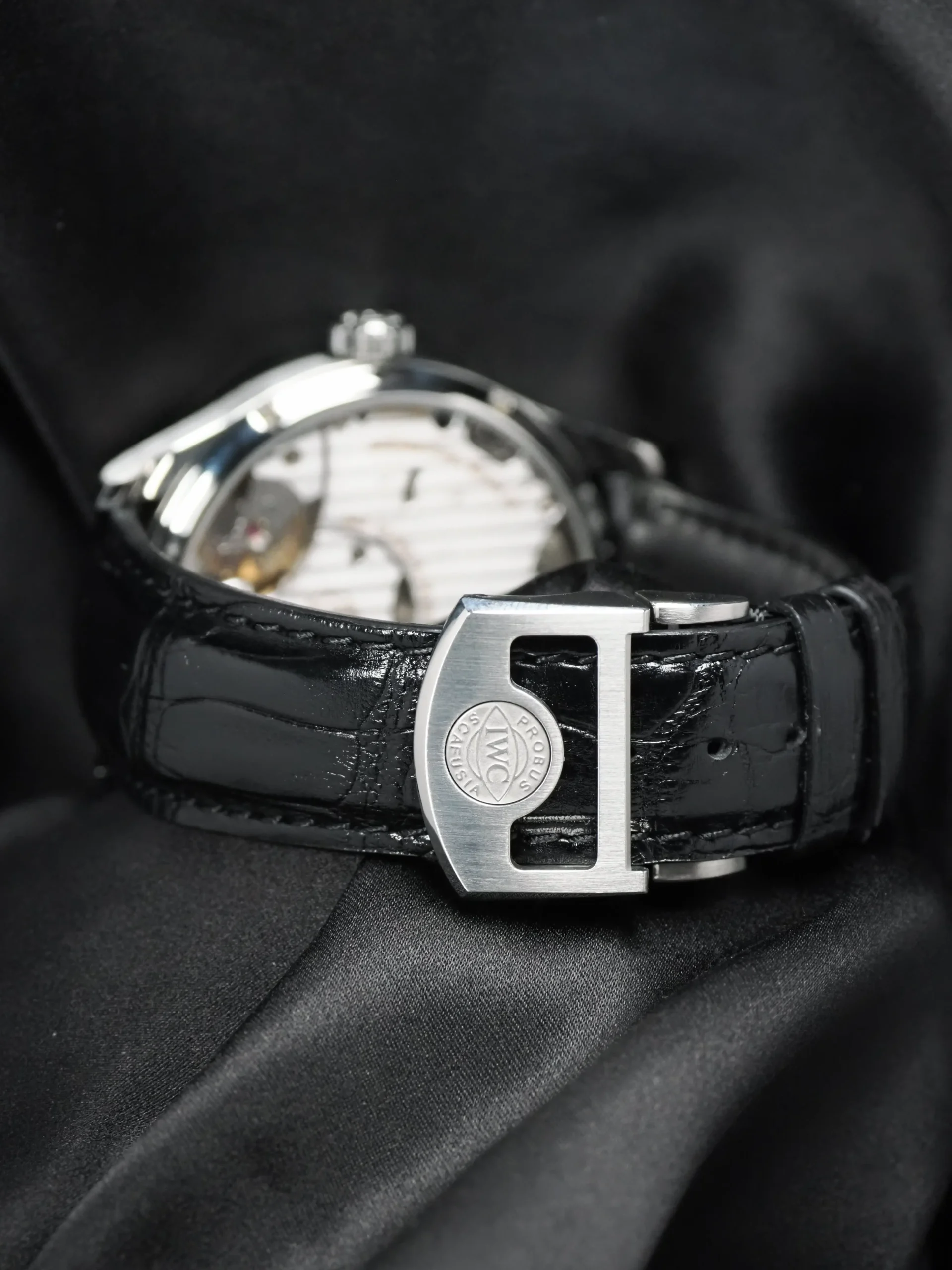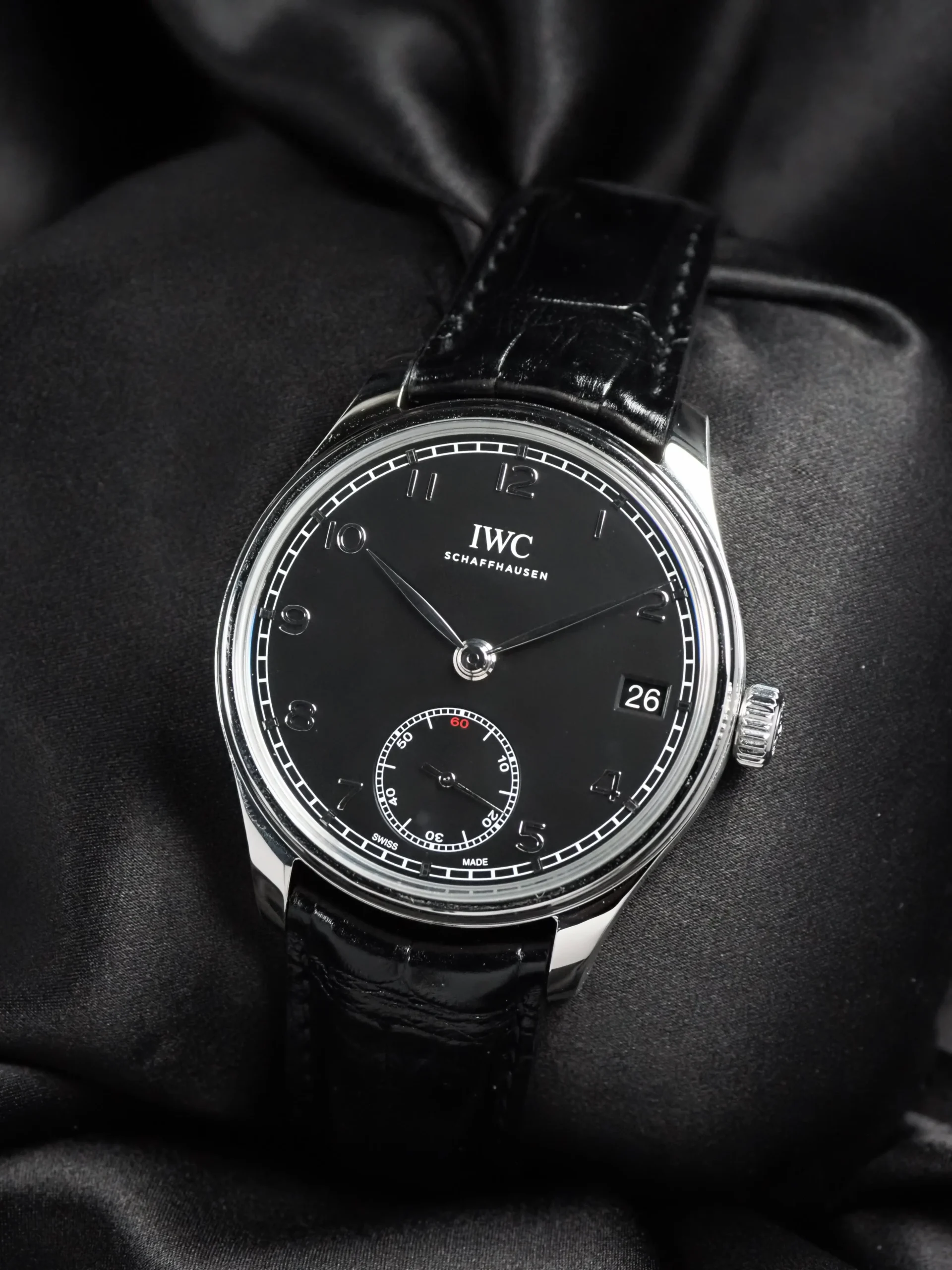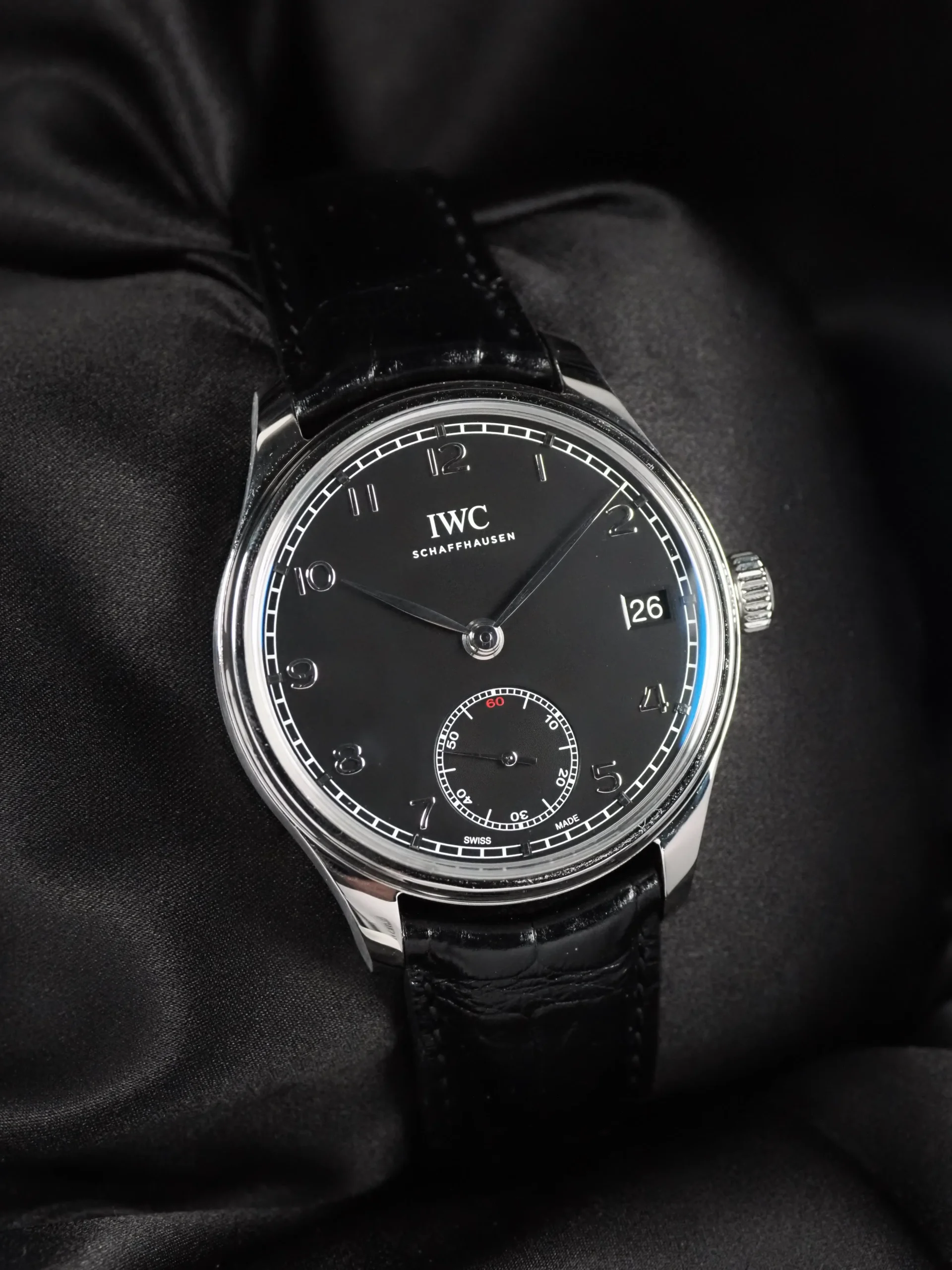 Pre-owned IWC Portugieser Hand-Wound Eight Days (IW510202) manual-winding watch. This reference features a black dial, encased in a 43mm steel case and black straps. Features seconds, minutes, hours, date, and power reserve display functions. This watch shows light use. Functions and keeps time well. Comes with original box and warranty papers dated 2016.