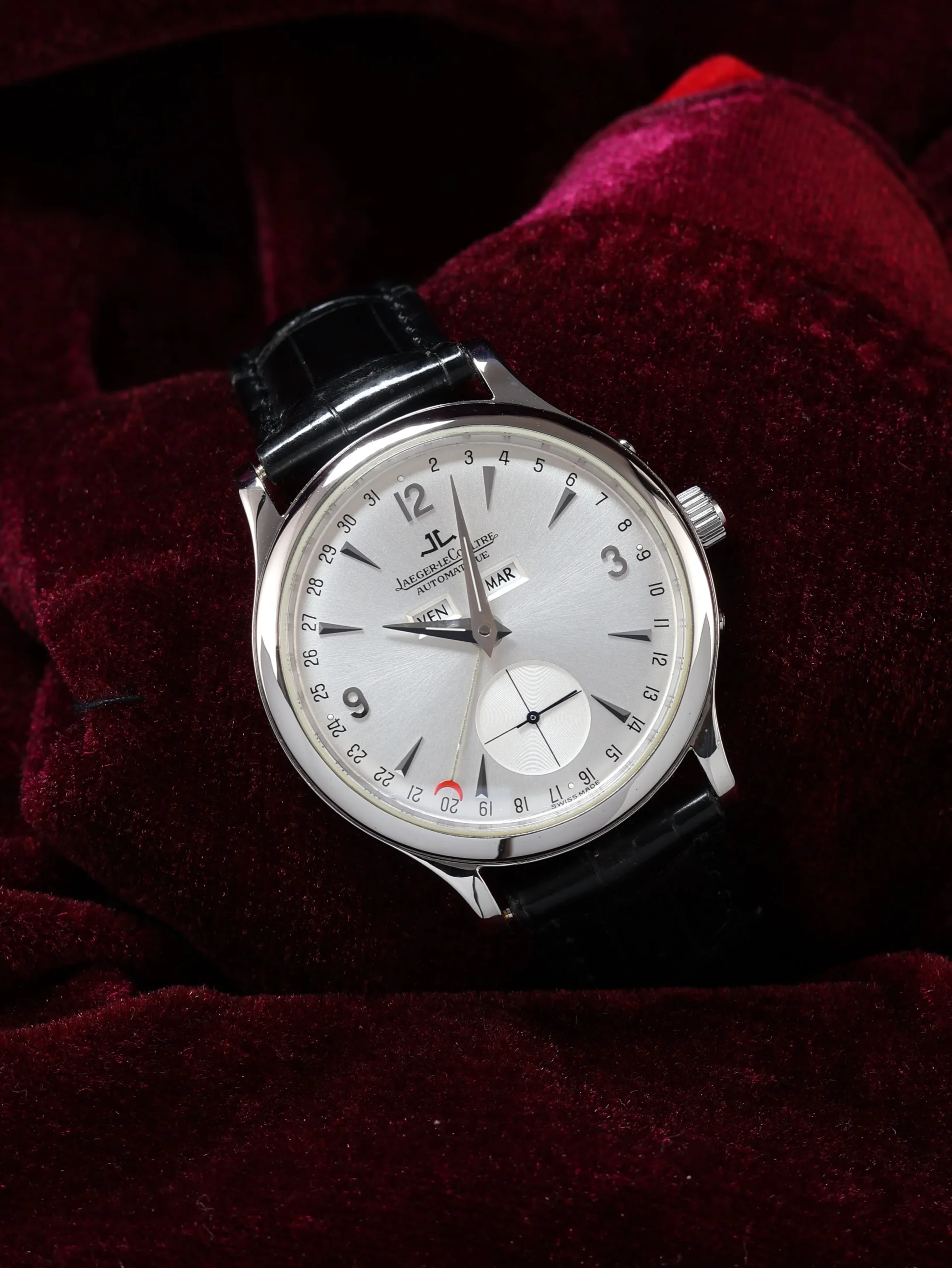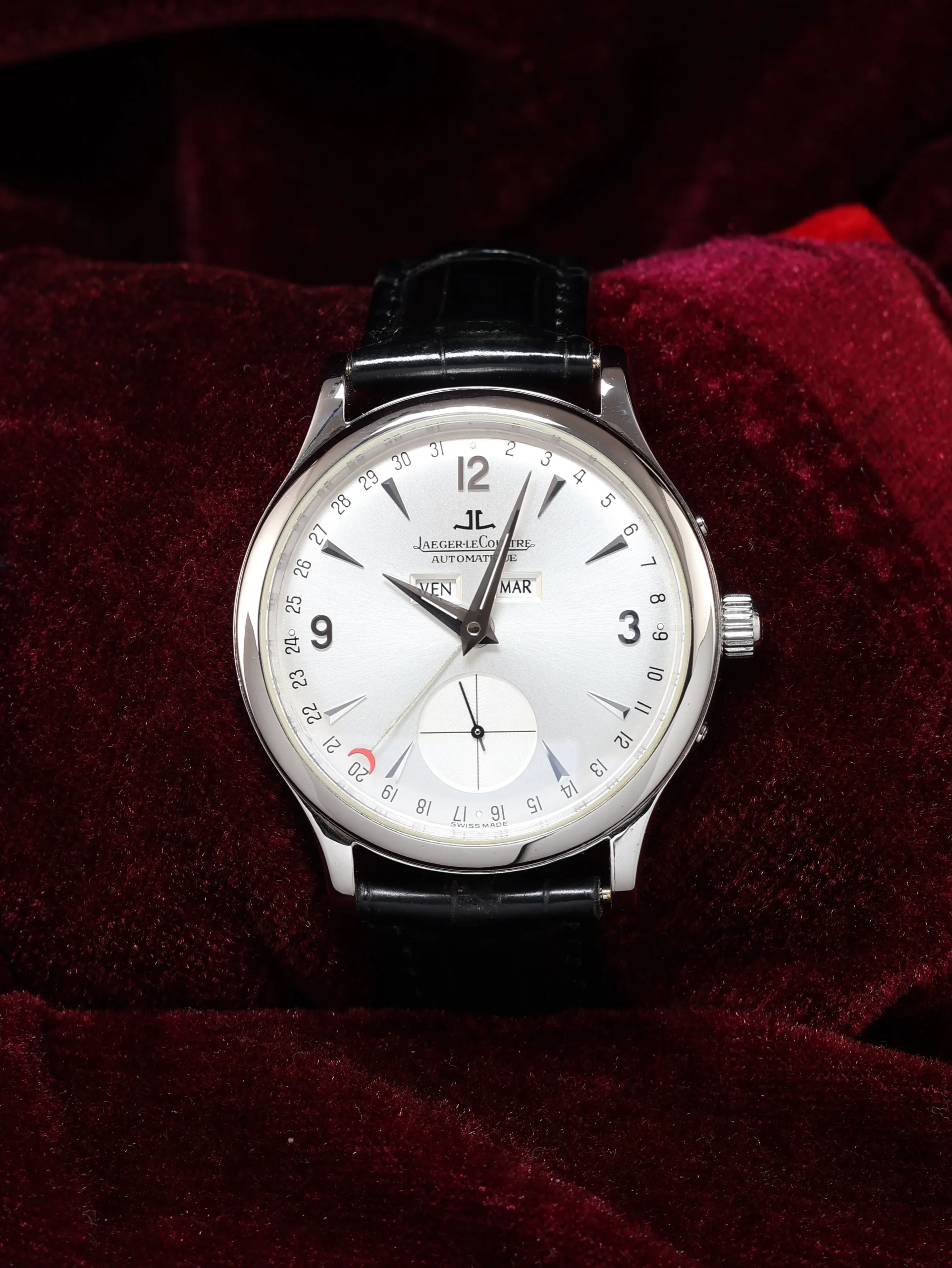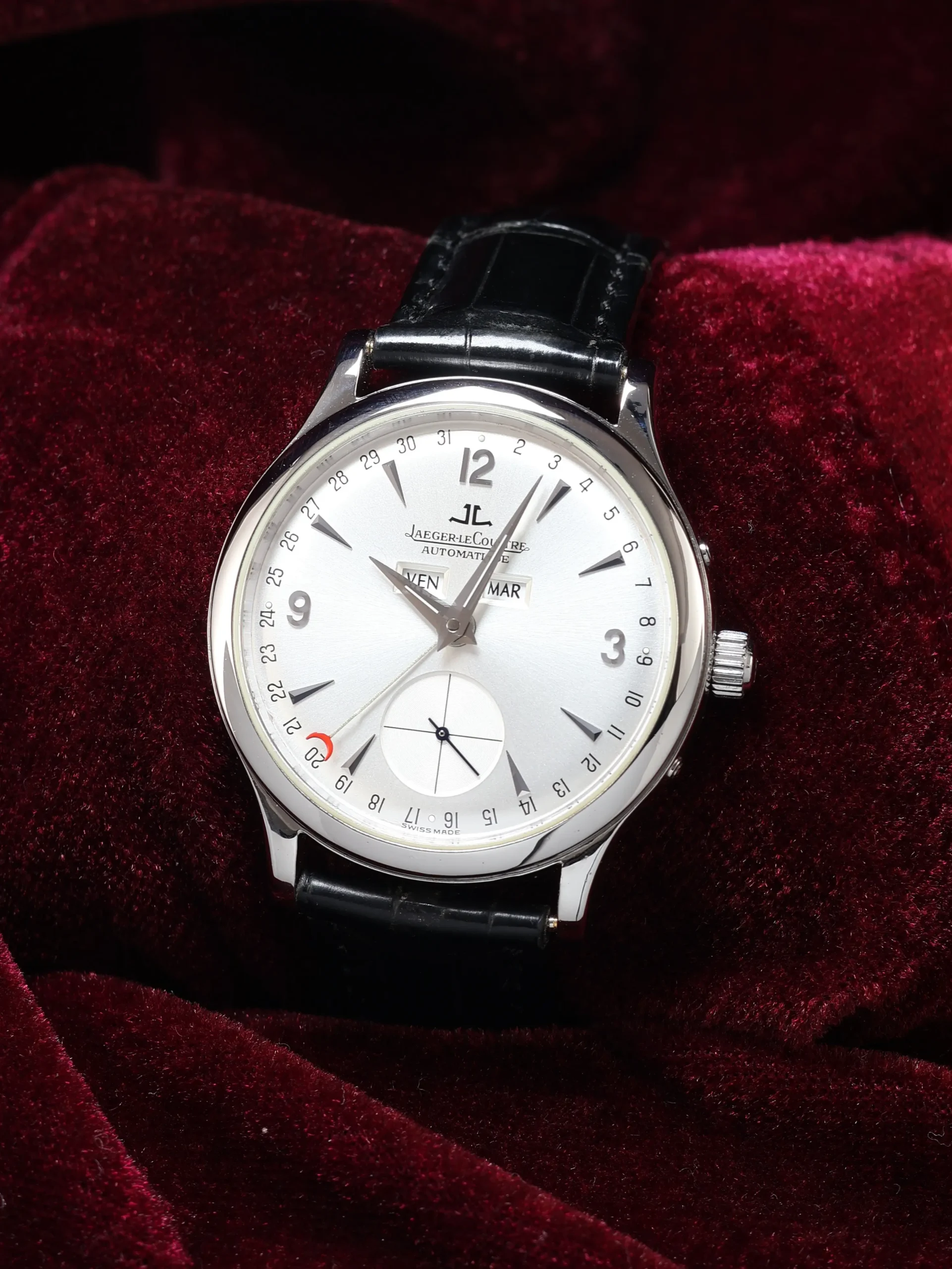 Pre-owned Jaeger-LeCoultre Master Control Calendar (Q147842A / 140.8.87) self-winding automatic watch. This reference features a silver dial, encased in a 37mm steel case and black straps. Features seconds, minutes, hours, day, date, and month functions. This watch shows light use. Functions and keeps time well. Comes with box and warranty papers dated 2012.