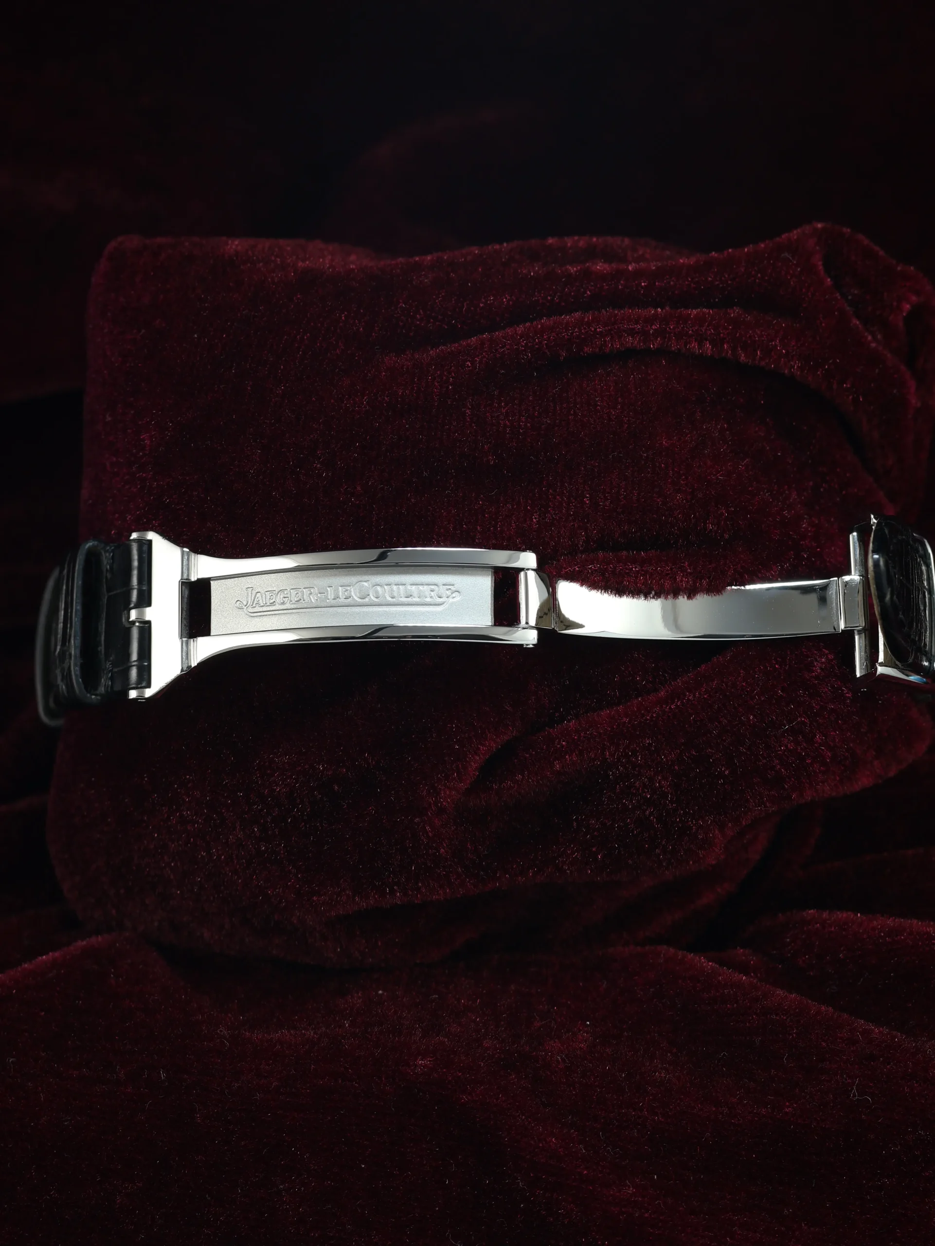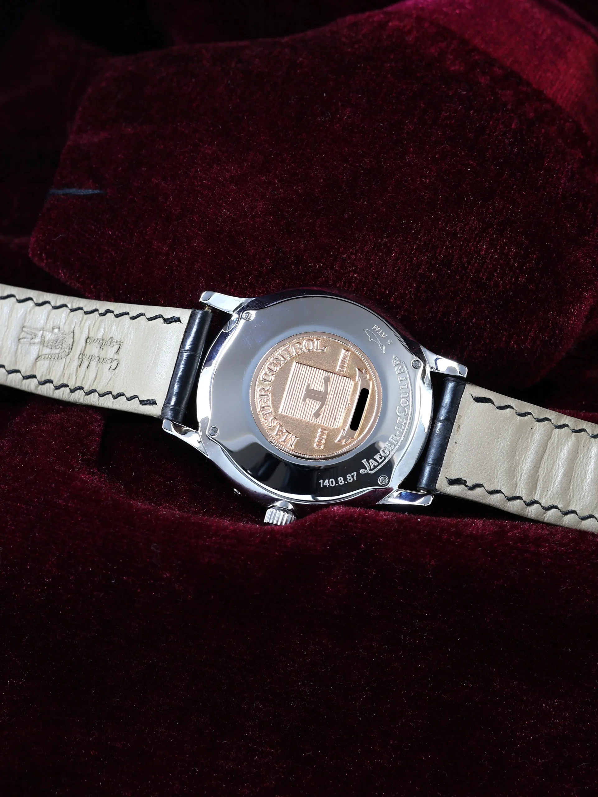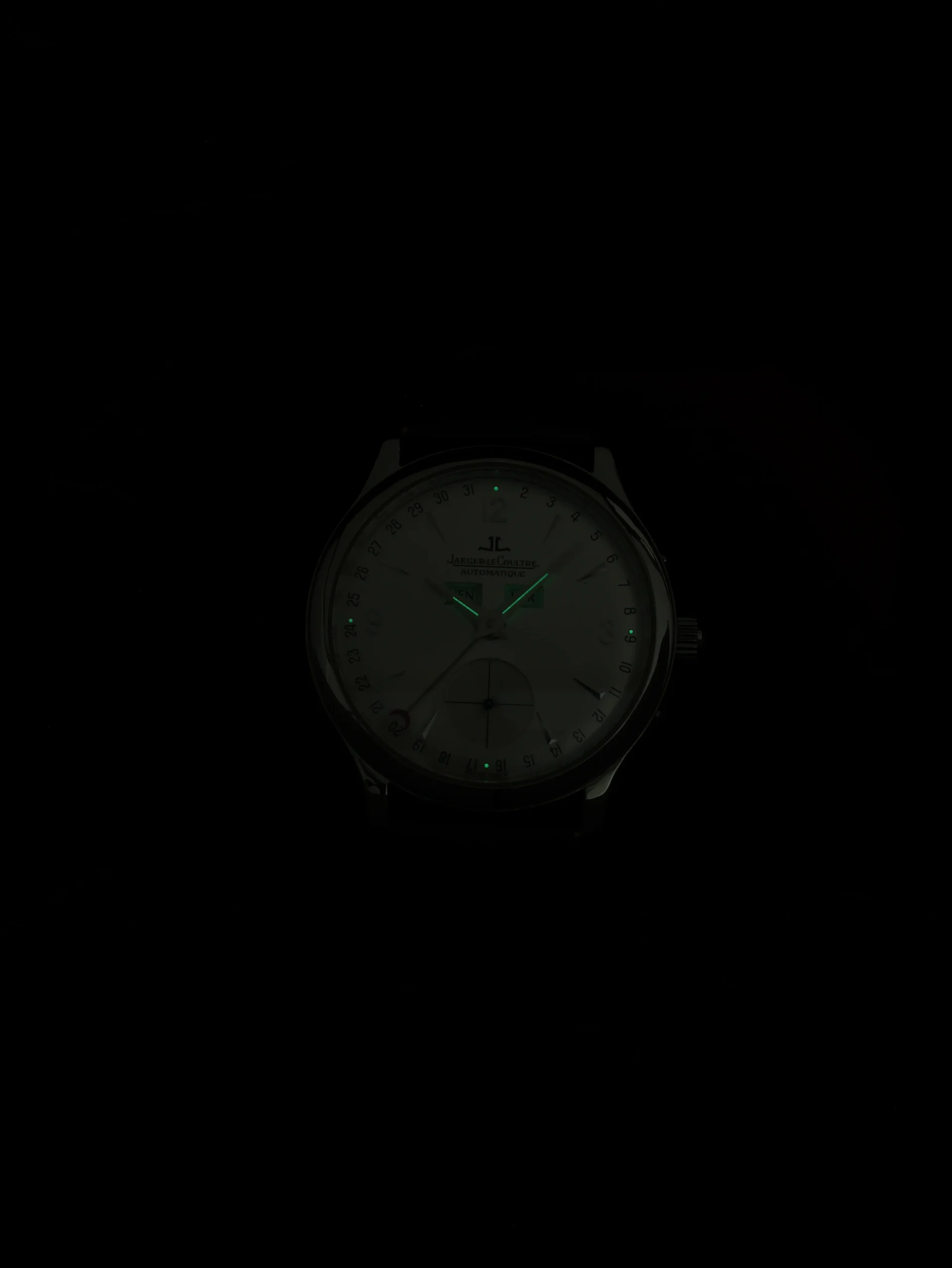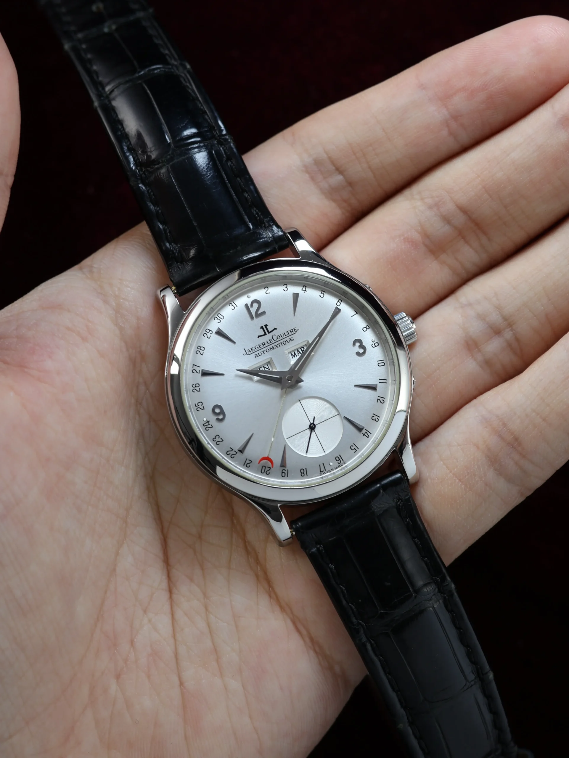 Pre-owned Jaeger-LeCoultre Master Control Calendar (Q147842A / 140.8.87) self-winding automatic watch. This reference features a silver dial, encased in a 37mm steel case and black straps. Features seconds, minutes, hours, day, date, and month functions. This watch shows light use. Functions and keeps time well. Comes with box and warranty papers dated 2012.