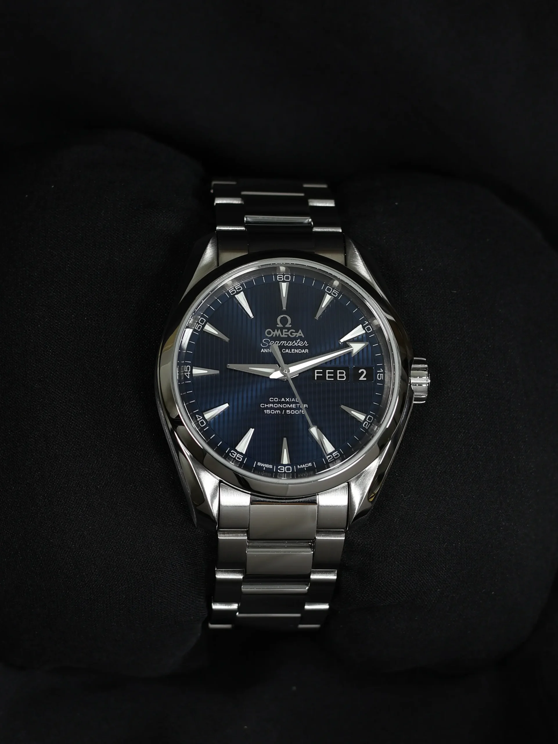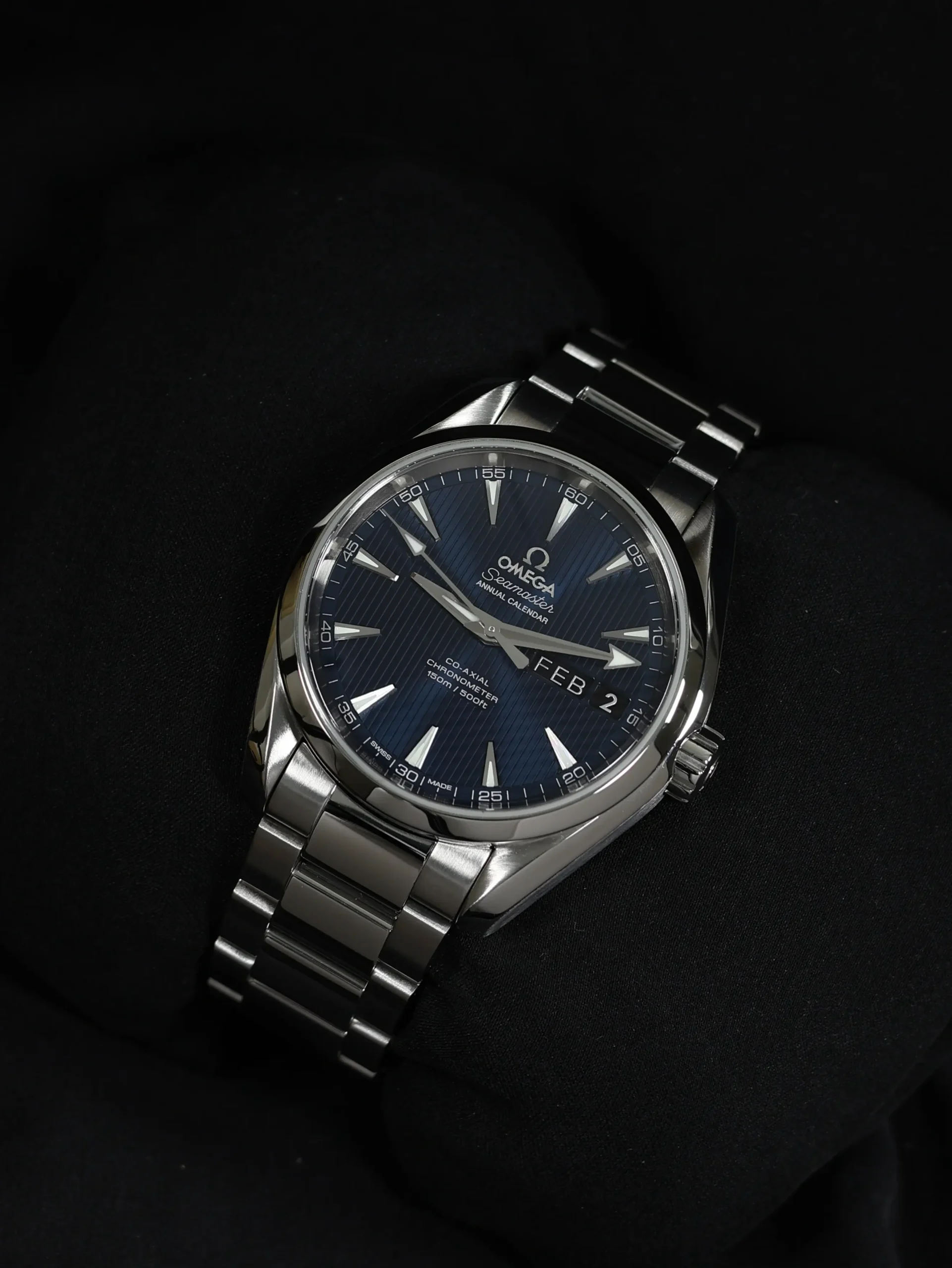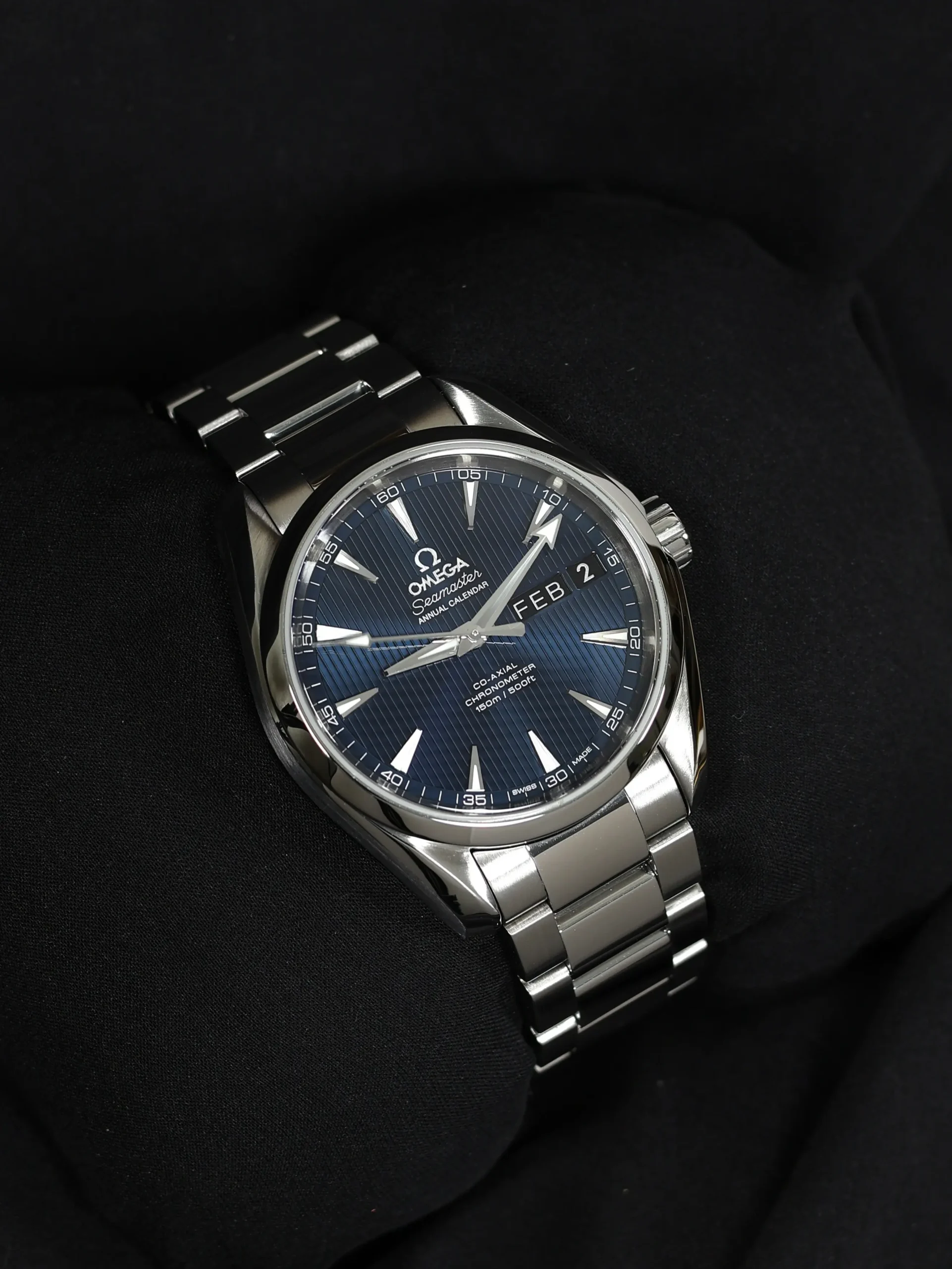 Pre-owned Omega Seamaster Aqua Terra Annual Calendar (231.10.39.22.03.001) self-winding automatic watch. This reference features a blue dial, encased in a 39mm steel case and bracelet. Features seconds, minutes, hours, date, month and annual calendar functions. This watch shows light use. Functions and keeps time well. Comes with original warranty papers dated 2020.