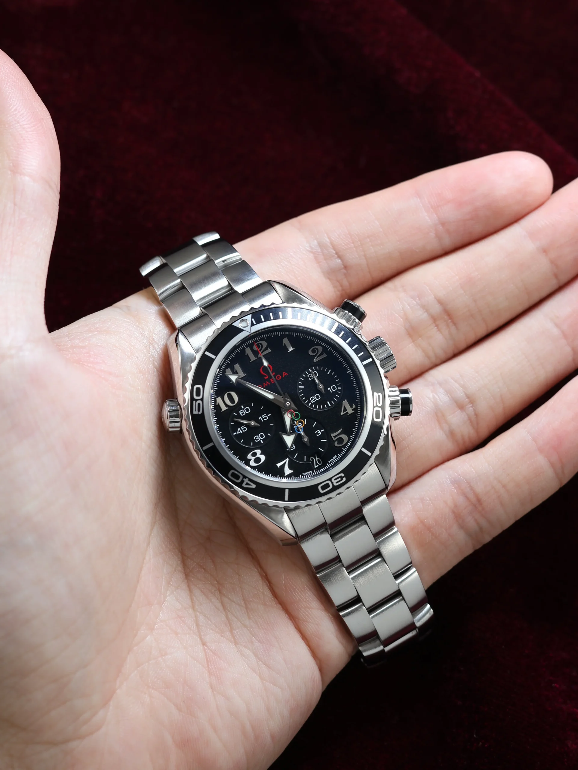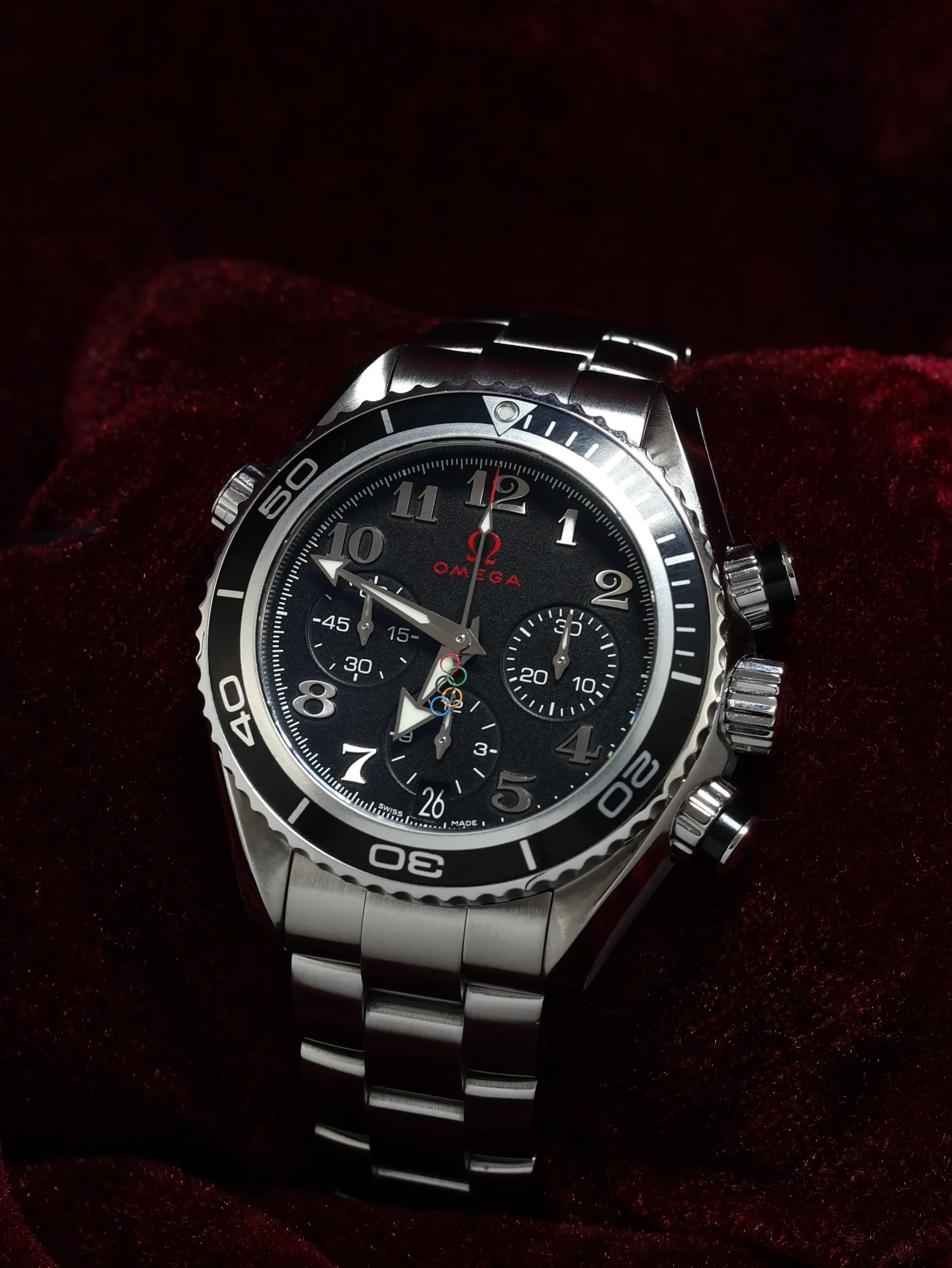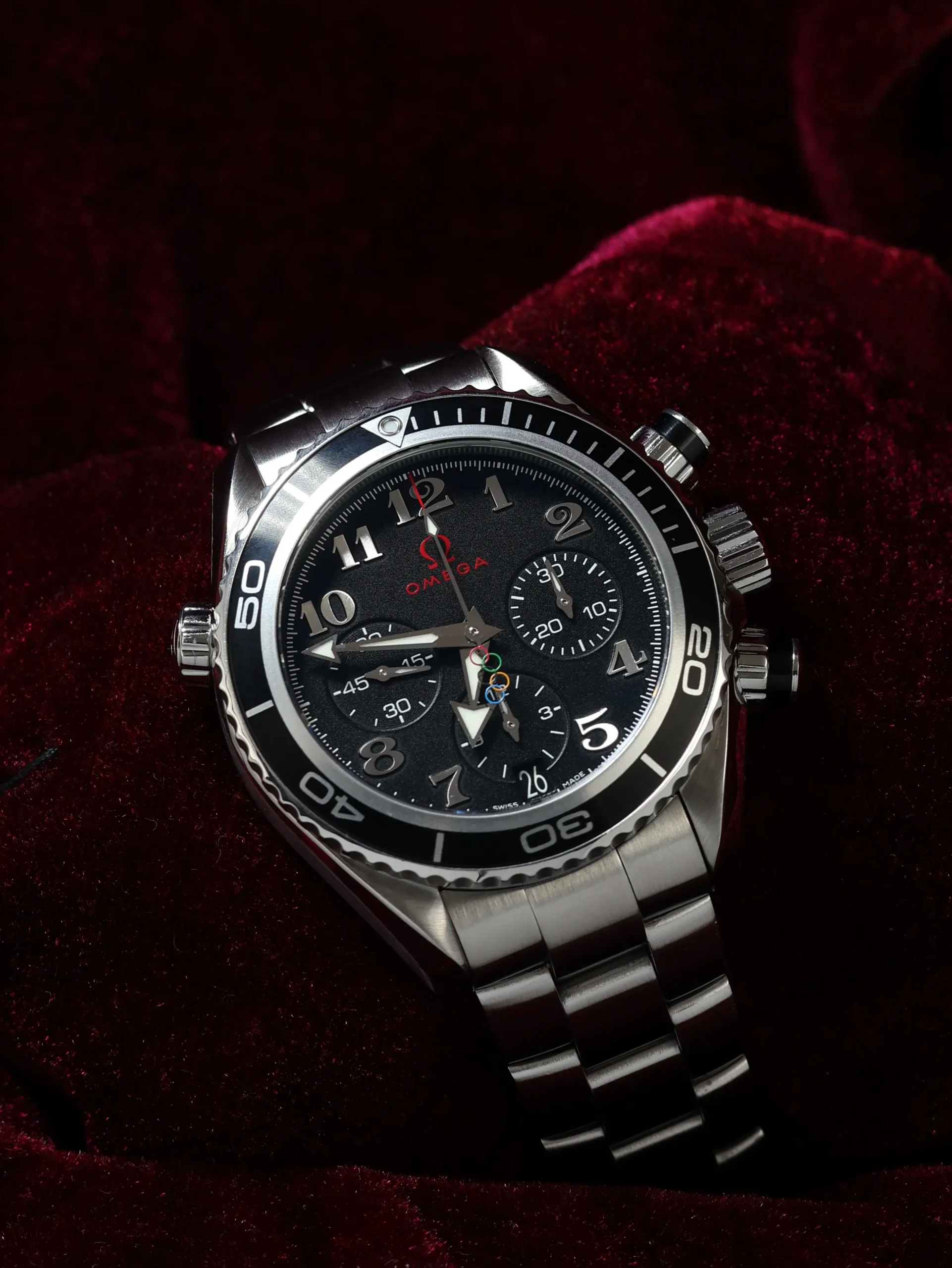 Pre-owned Omega Seamaster Planet Ocean Specialities Olympic Games Collection (222.30.38.50.01.003) self-winding automatic watch. This reference features a black dial and bezel, encased in a 37.5mm steel case and bracelet. Features seconds, minutes, hours, date, chronograph, and 60-minute countdown functions. This watch shows light use. Functions and keeps time well. Comes with box and warranty papers dated 2018.