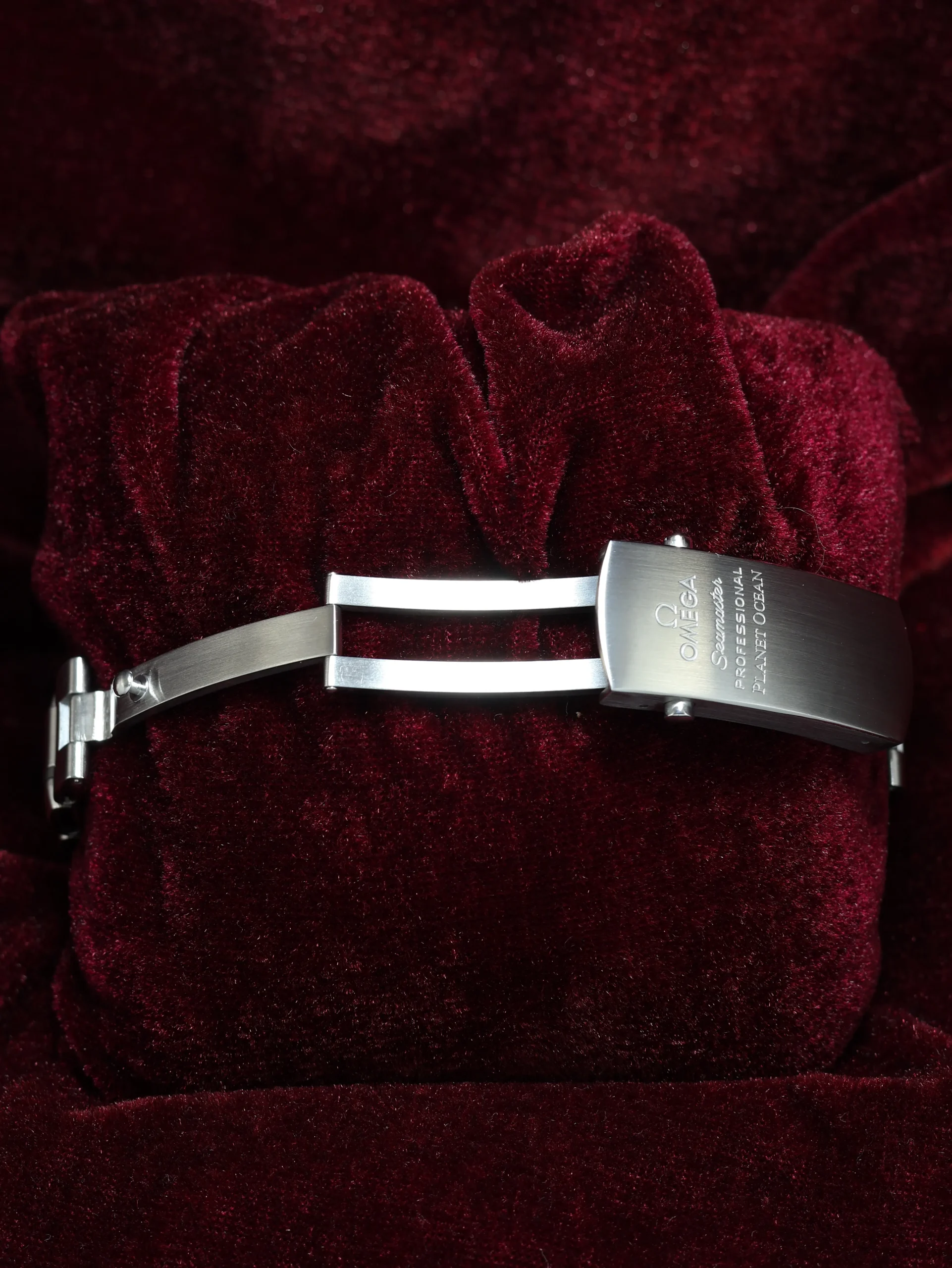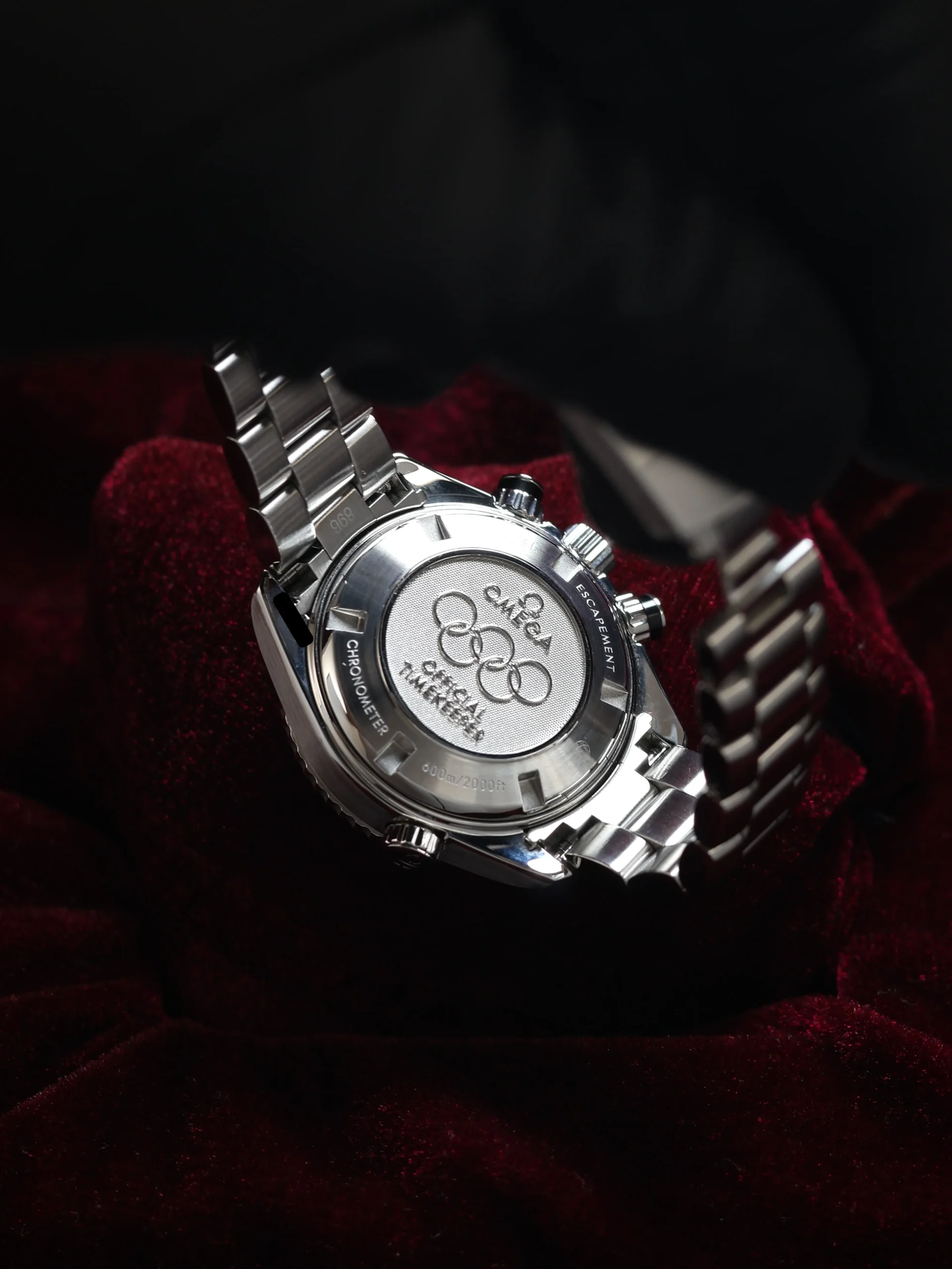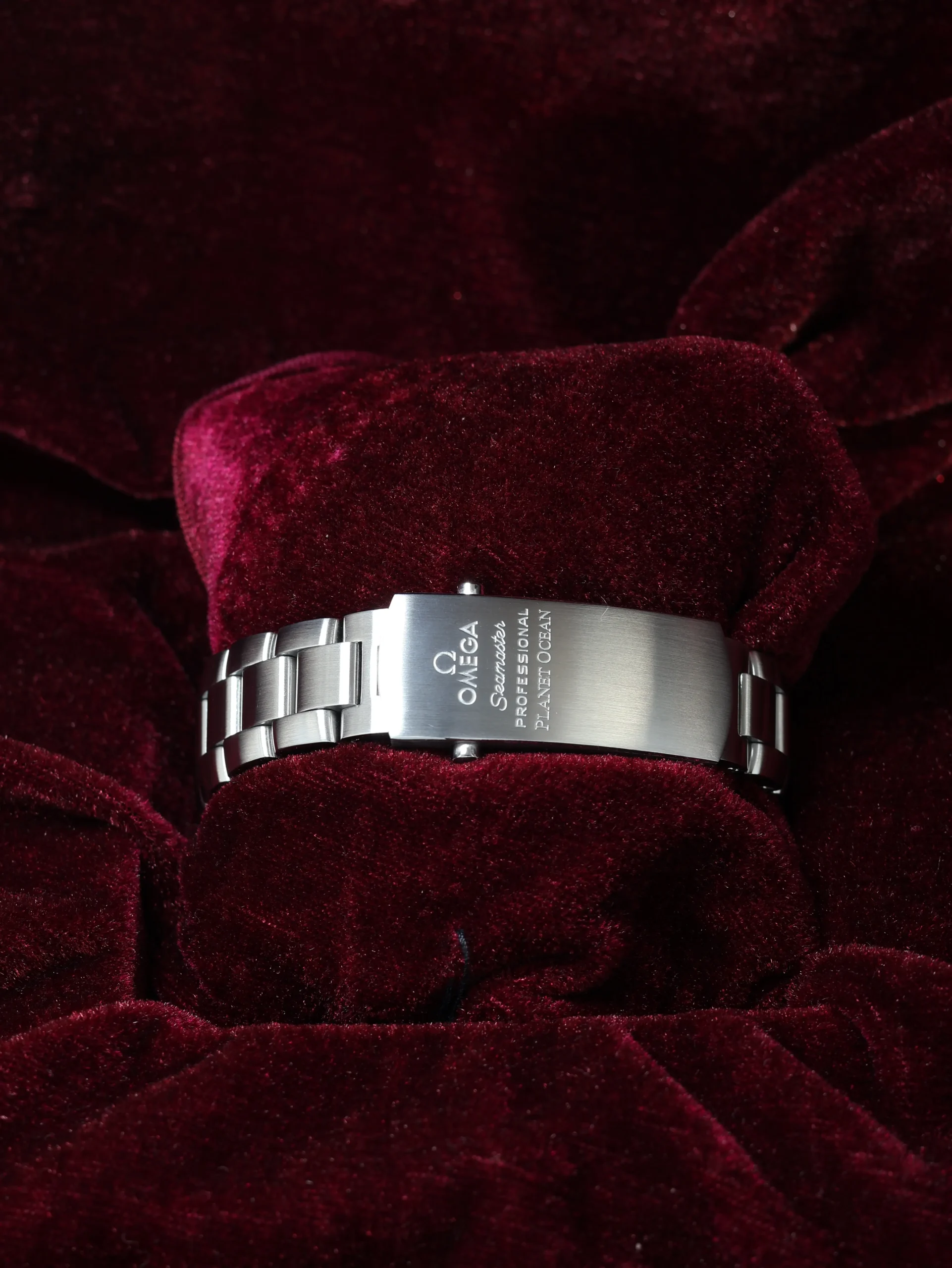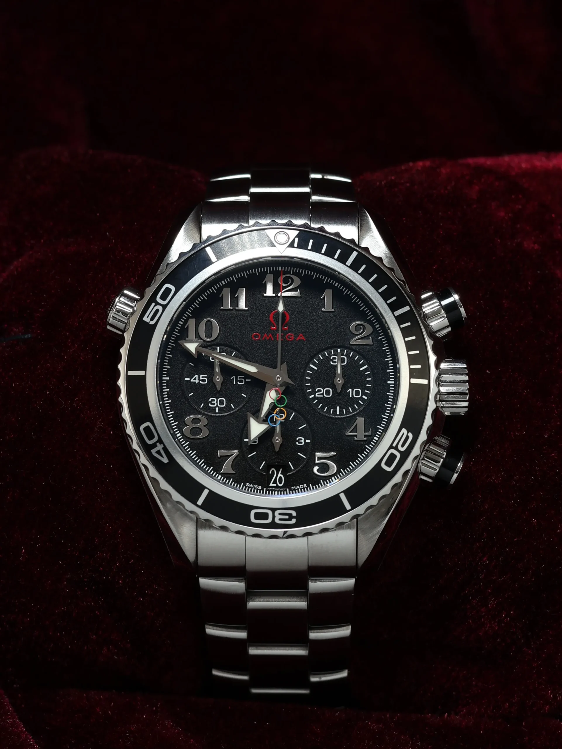 Pre-owned Omega Seamaster Planet Ocean Specialities Olympic Games Collection (222.30.38.50.01.003) self-winding automatic watch. This reference features a black dial and bezel, encased in a 37.5mm steel case and bracelet. Features seconds, minutes, hours, date, chronograph, and 60-minute countdown functions. This watch shows light use. Functions and keeps time well. Comes with box and warranty papers dated 2018.