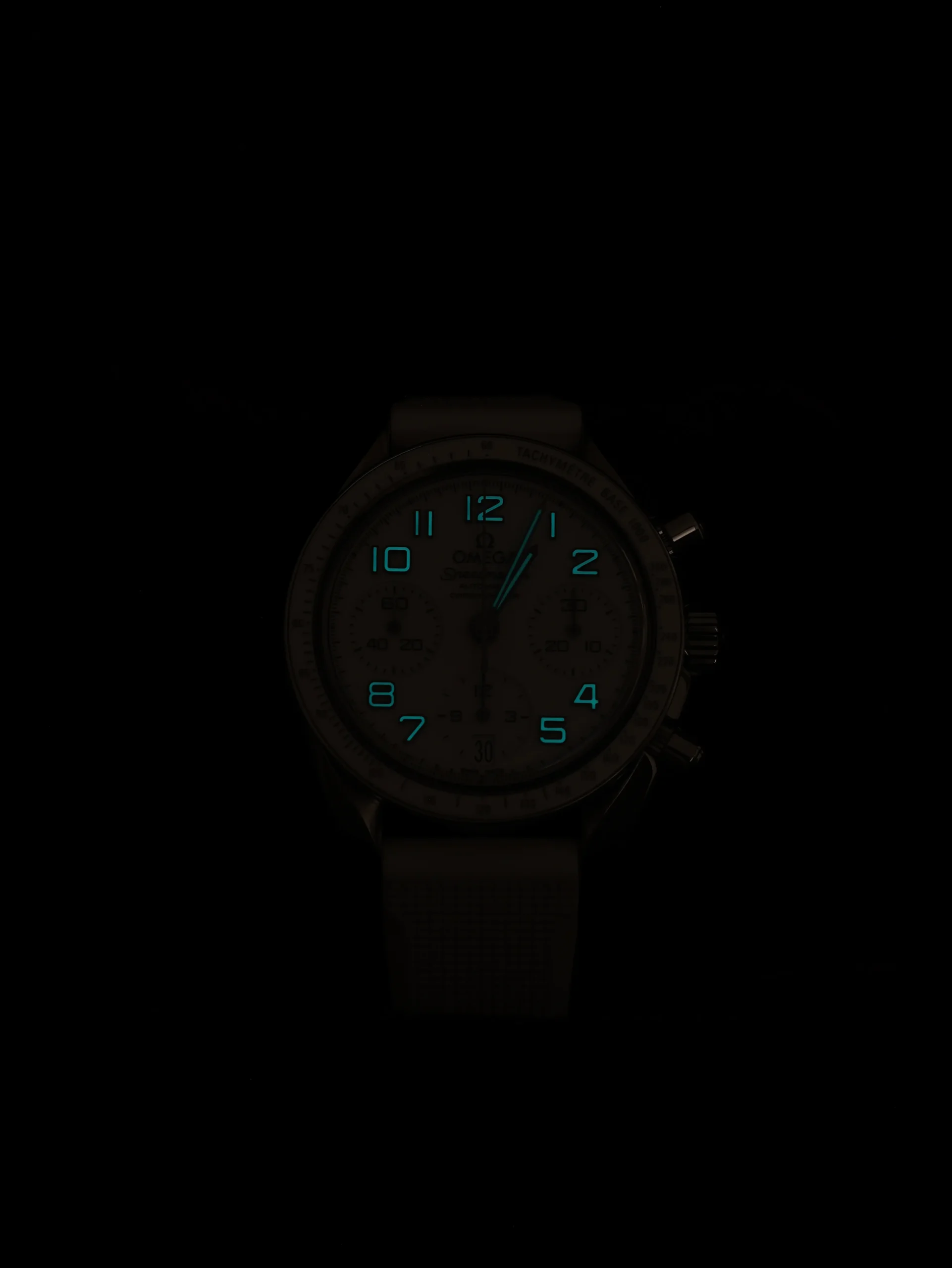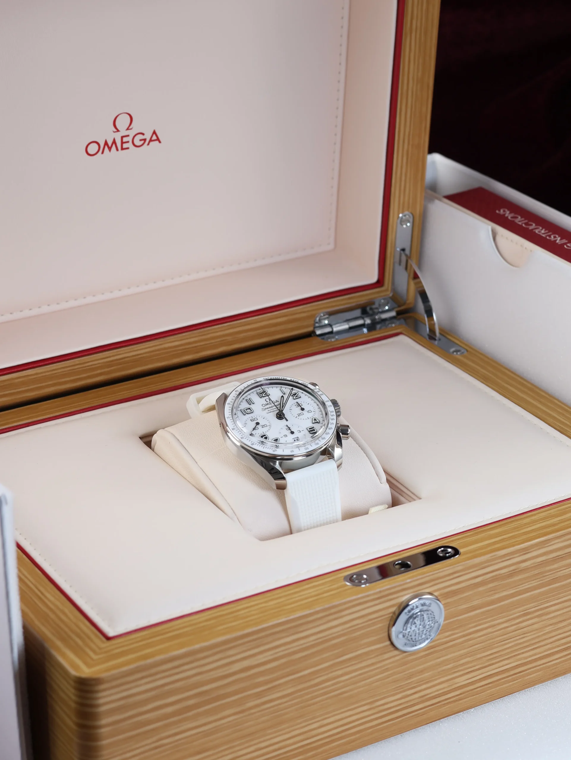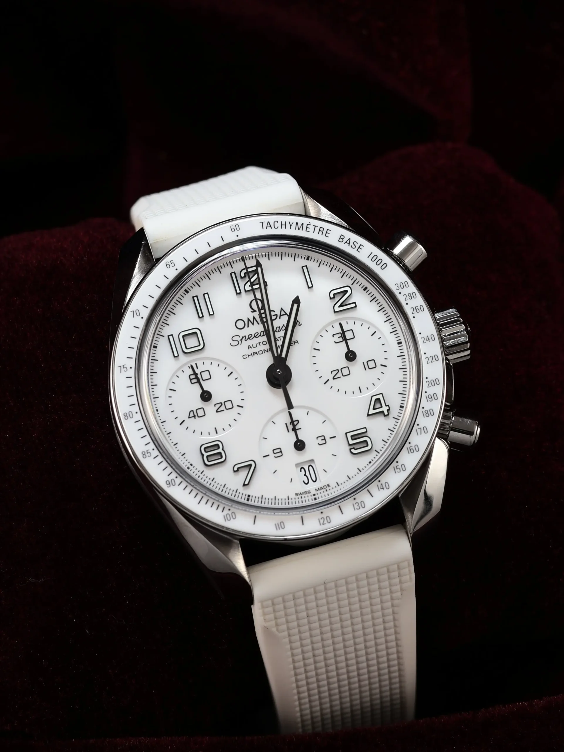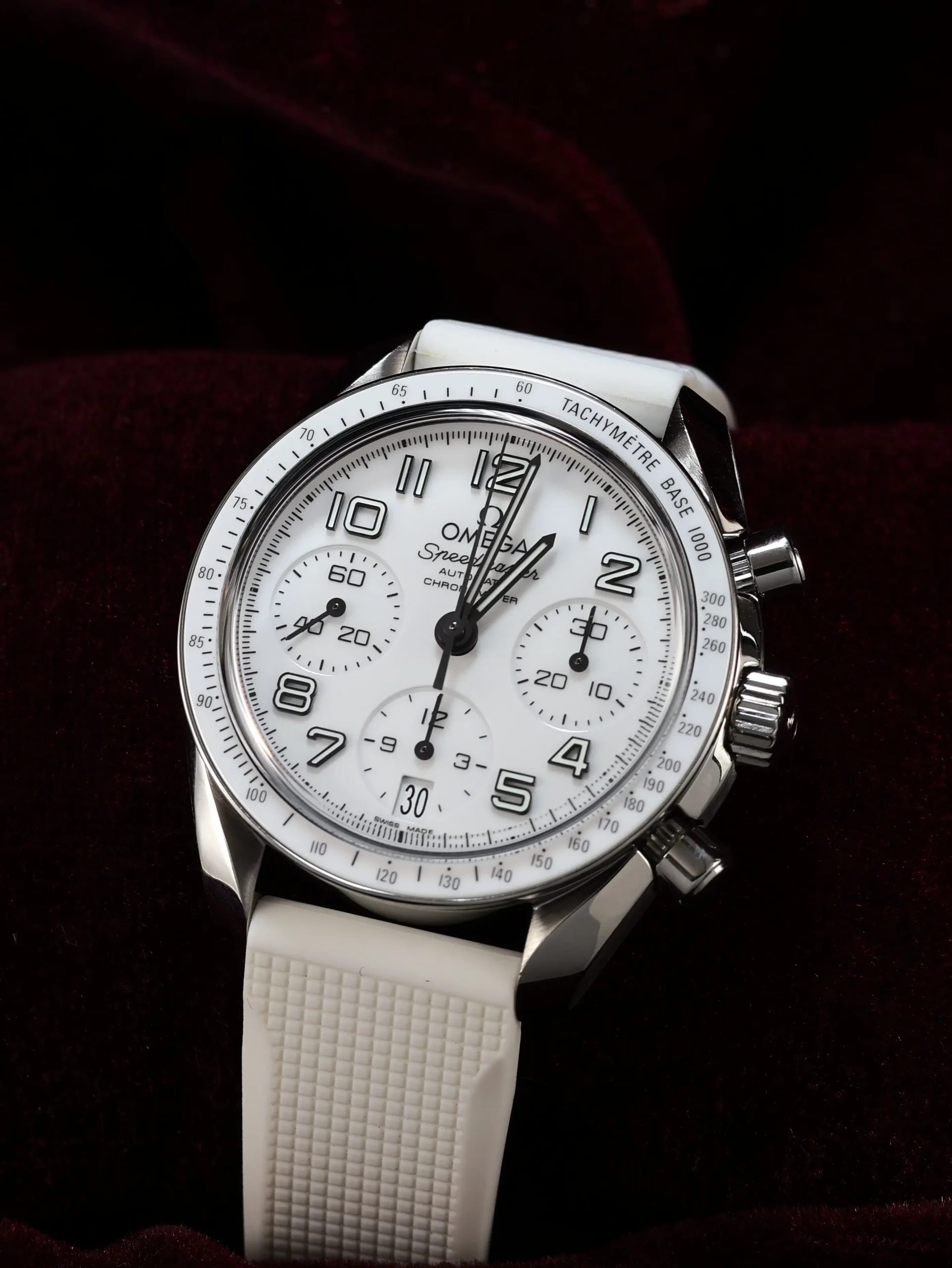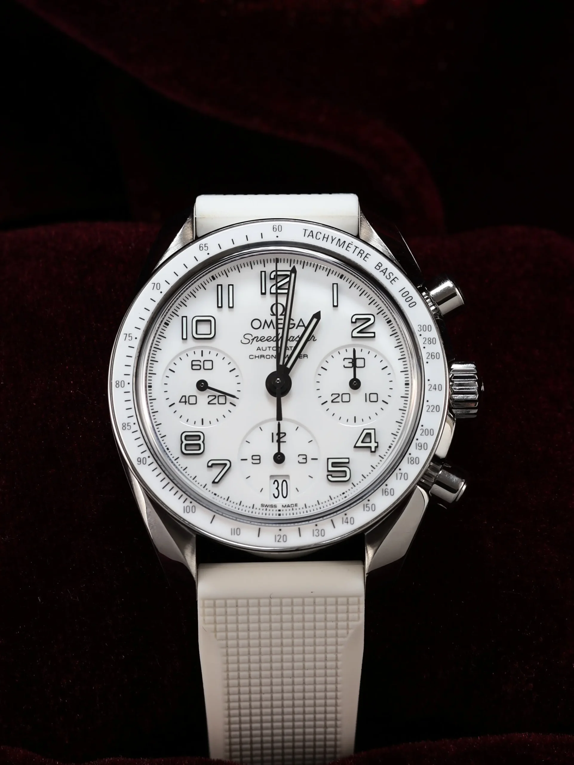 Pre-owned Omega Speedmaster (324.33.38.40.04.001) self-winding automatic watch. This reference features a white dial and bezel, encased in a 38mm steel case and white straps. Features seconds, minutes, hours, date, and chronograph functions. This watch shows light use. Functions and keeps time well. Comes with box and warranty papers dated 2018.