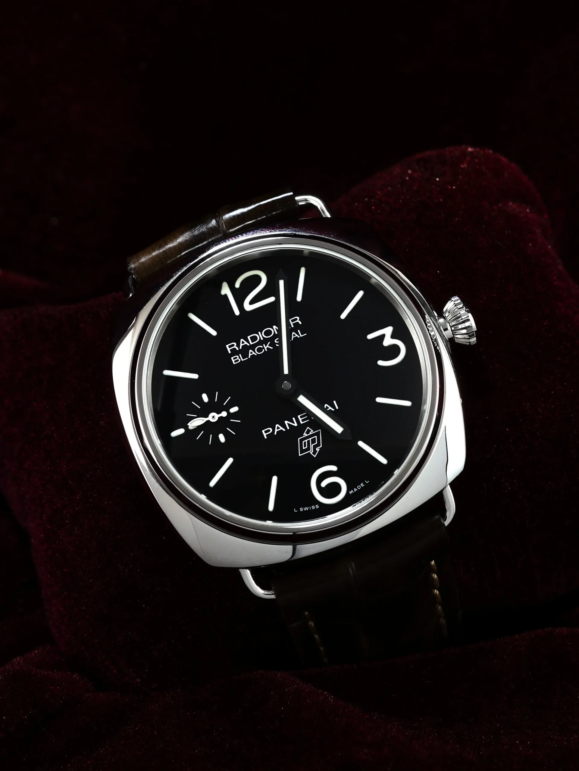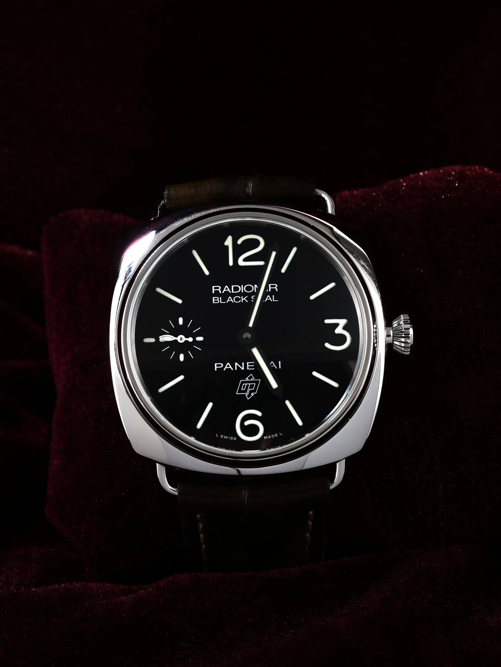 Pre-owned Panerai Radiomir Black Seal Logo (PAM00380) manual-winding watch. This reference features a black dial, encased in a 45mm steel case and brown straps. Features seconds, minutes, and hours functions. This watch shows light use. Functions and keeps time well. Comes with box and warranty papers dated 2011.