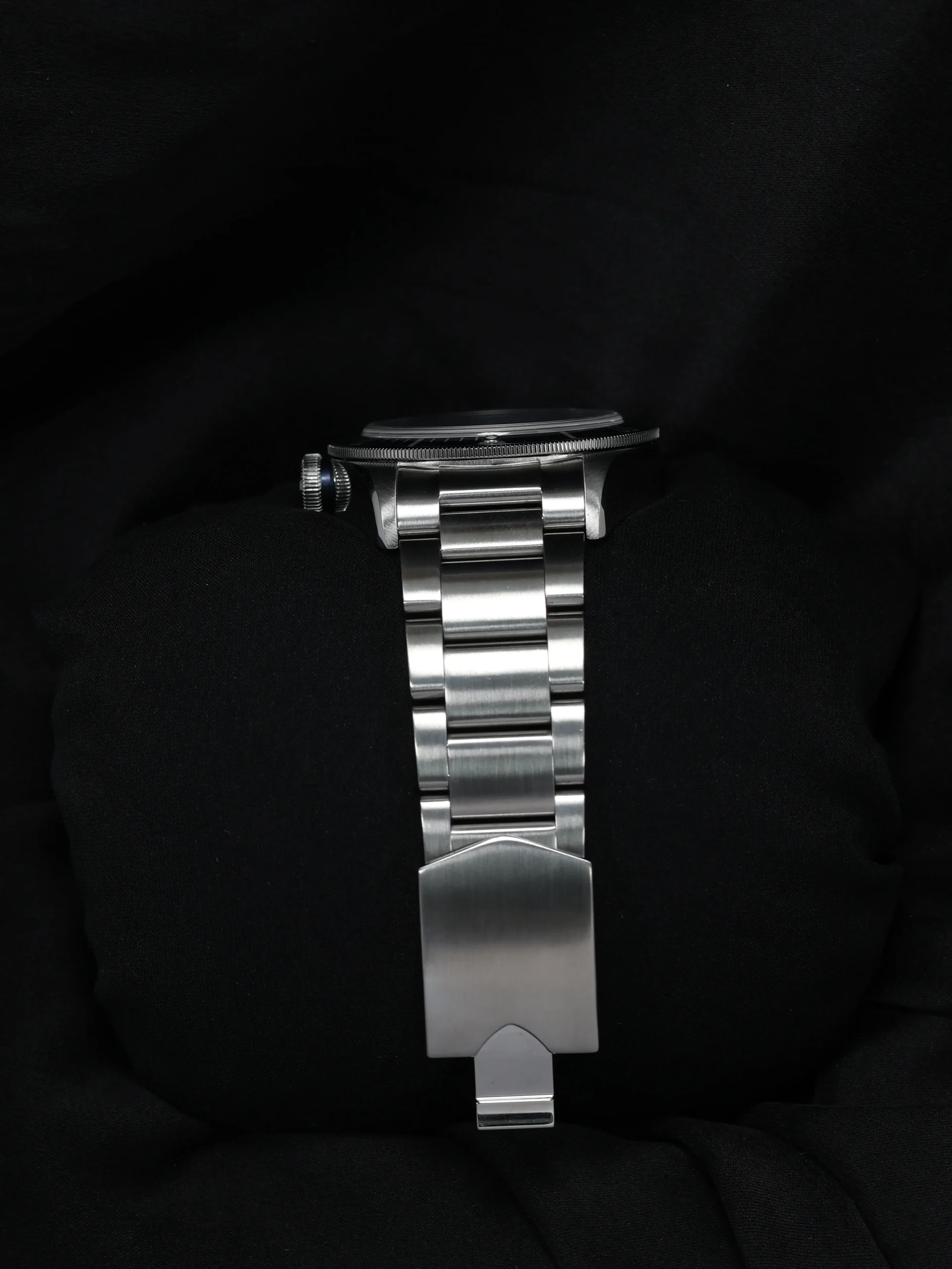 • Black dial and blue bezel