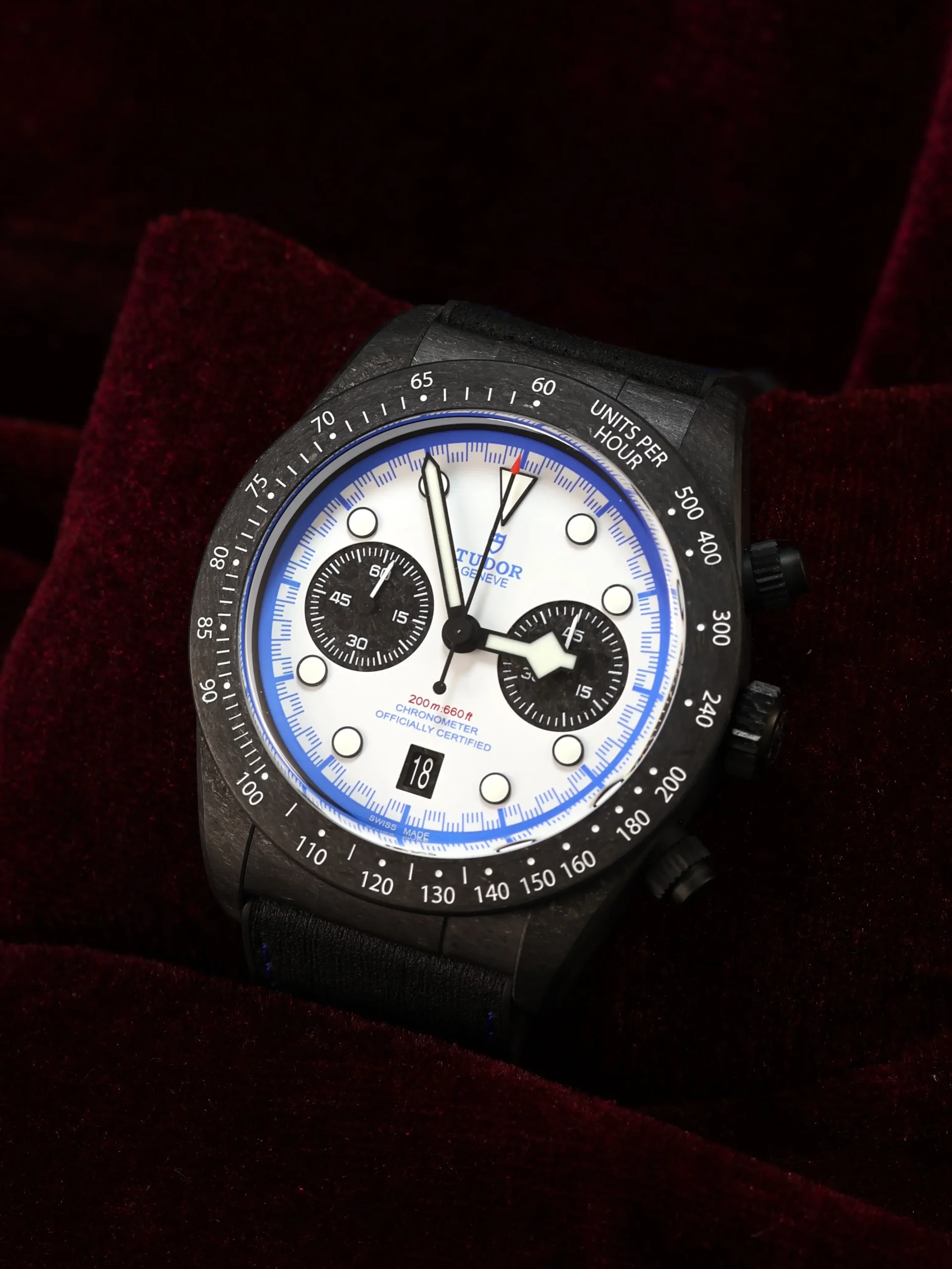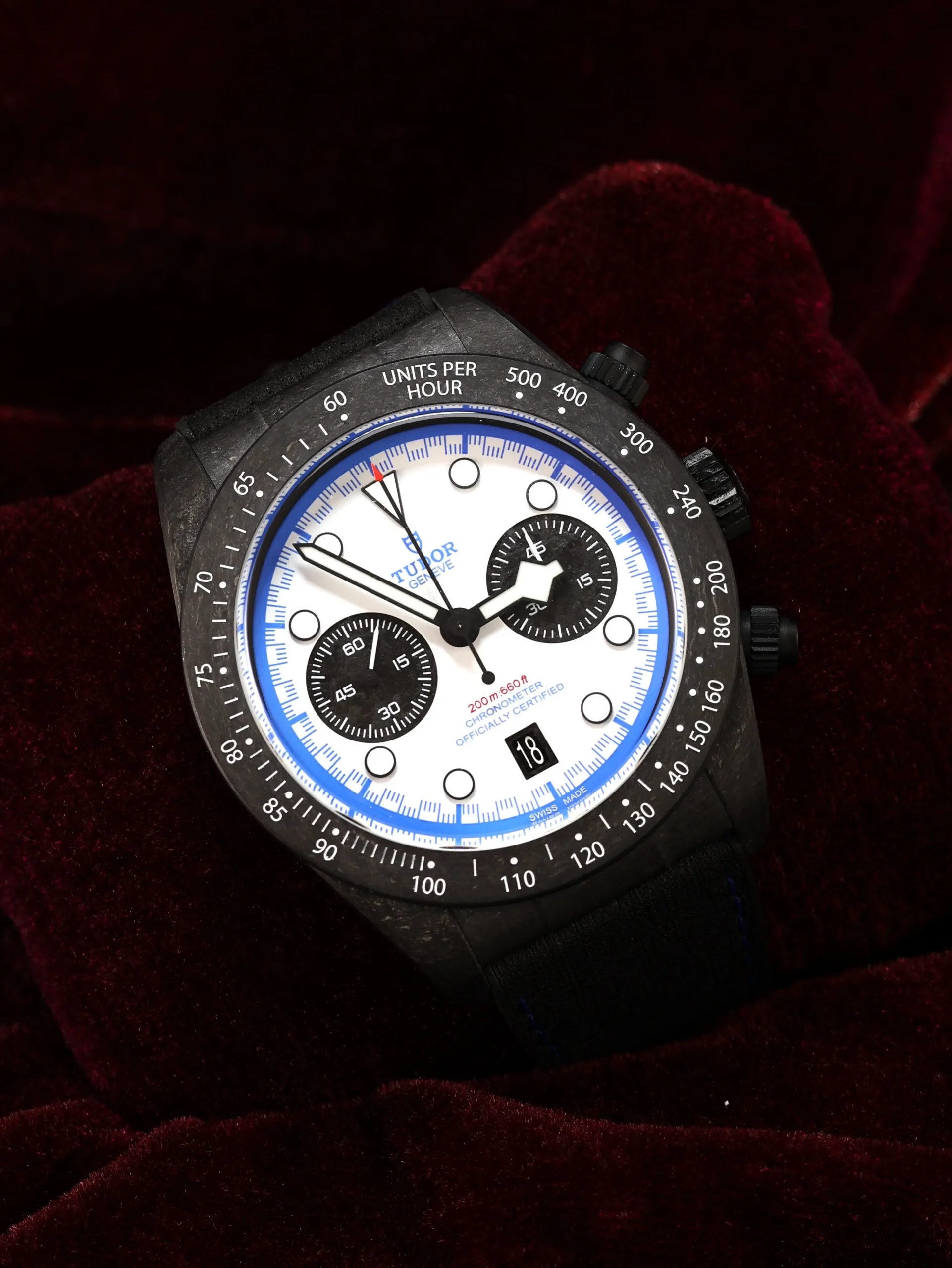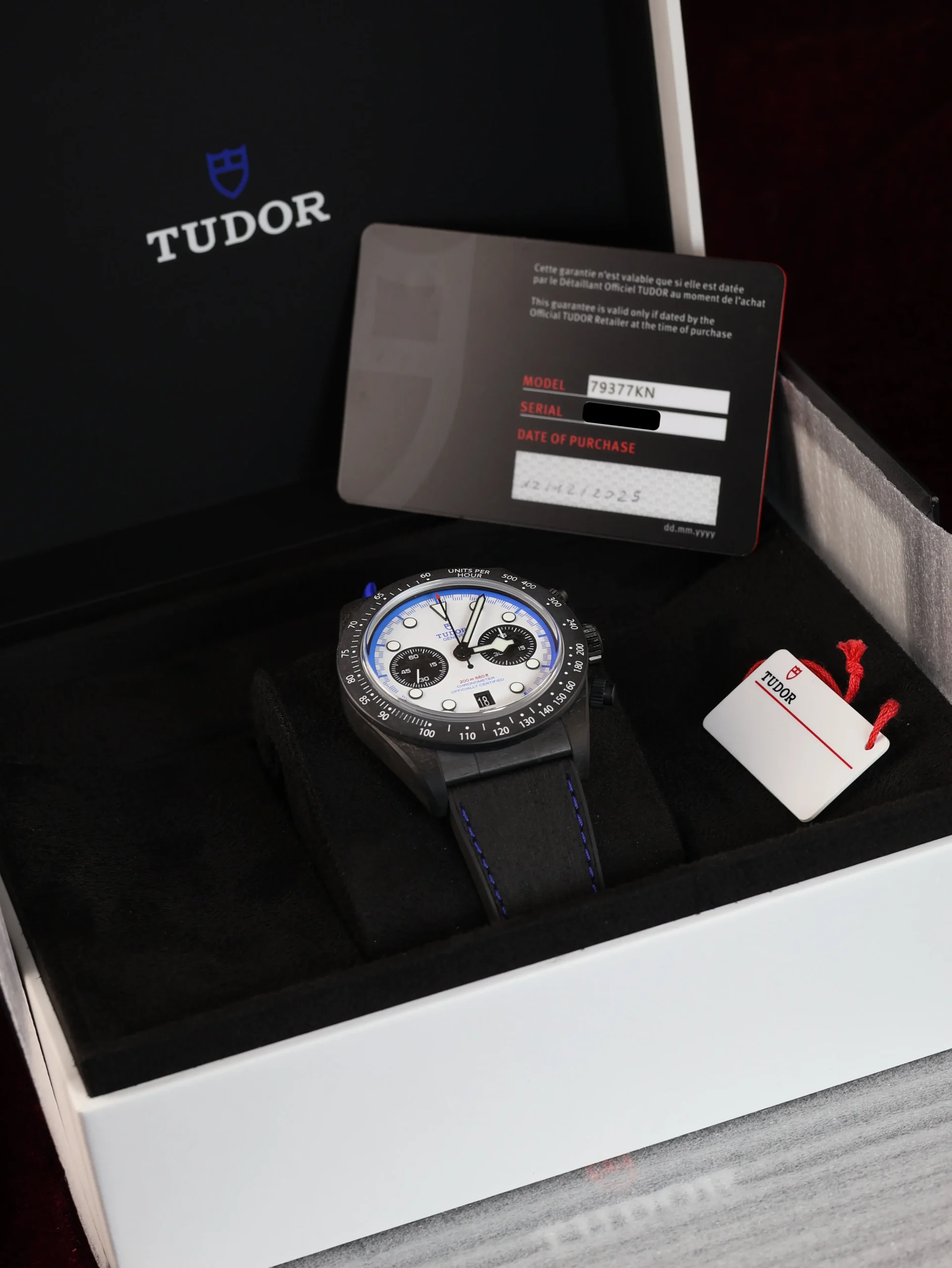 Unworn limited to 2025 pieces Tudor Black Bay Chrono “Carbon 25” (79377KN) self-winding automatic watch. This reference features a white dial and black bezel, encased in a 42mm carbon fibre & titanium case and black straps. Features seconds, minutes, hours, date, and chronograph functions. Functions and keeps time well. Comes with box and warranty papers dated 2025.