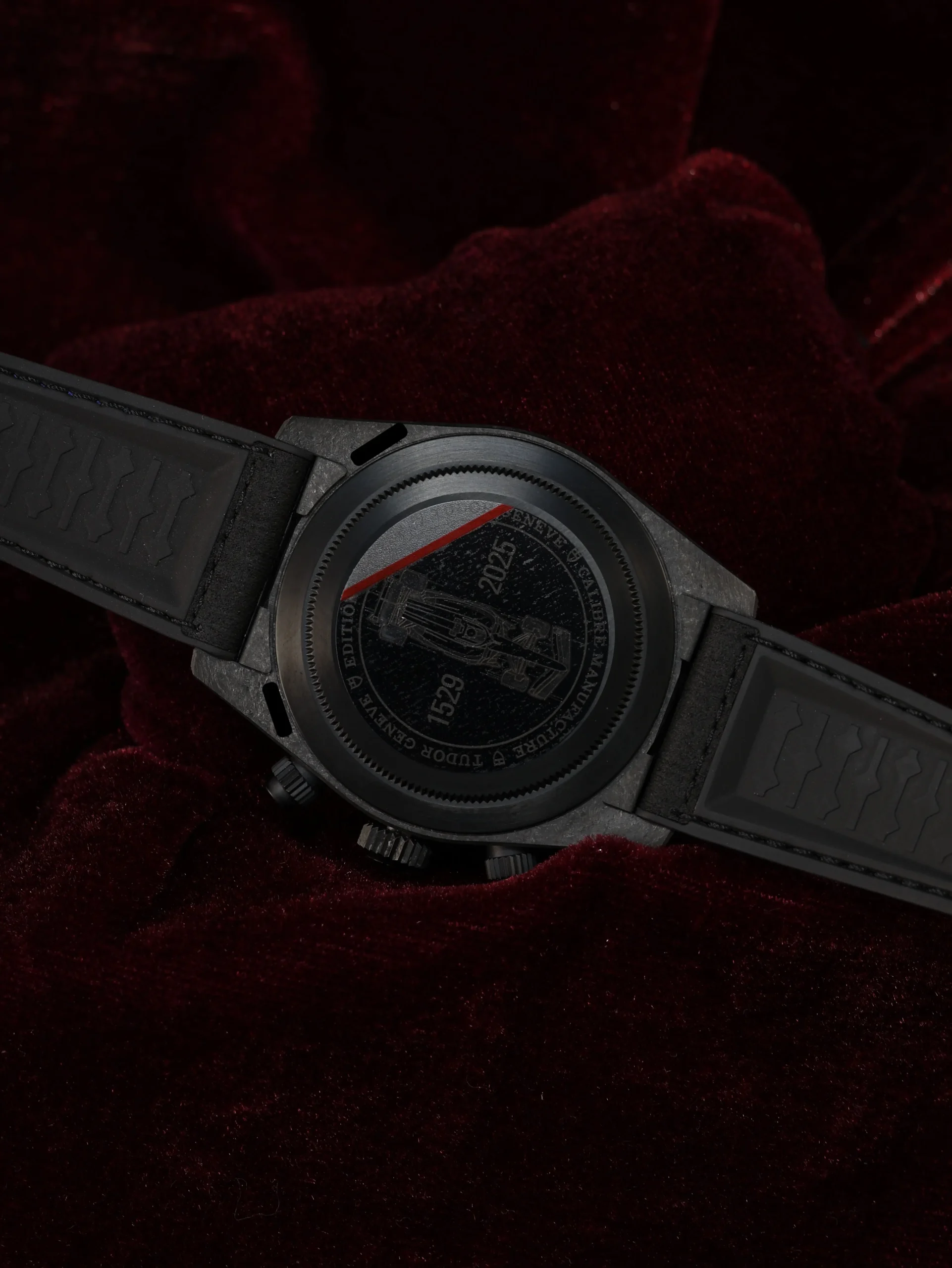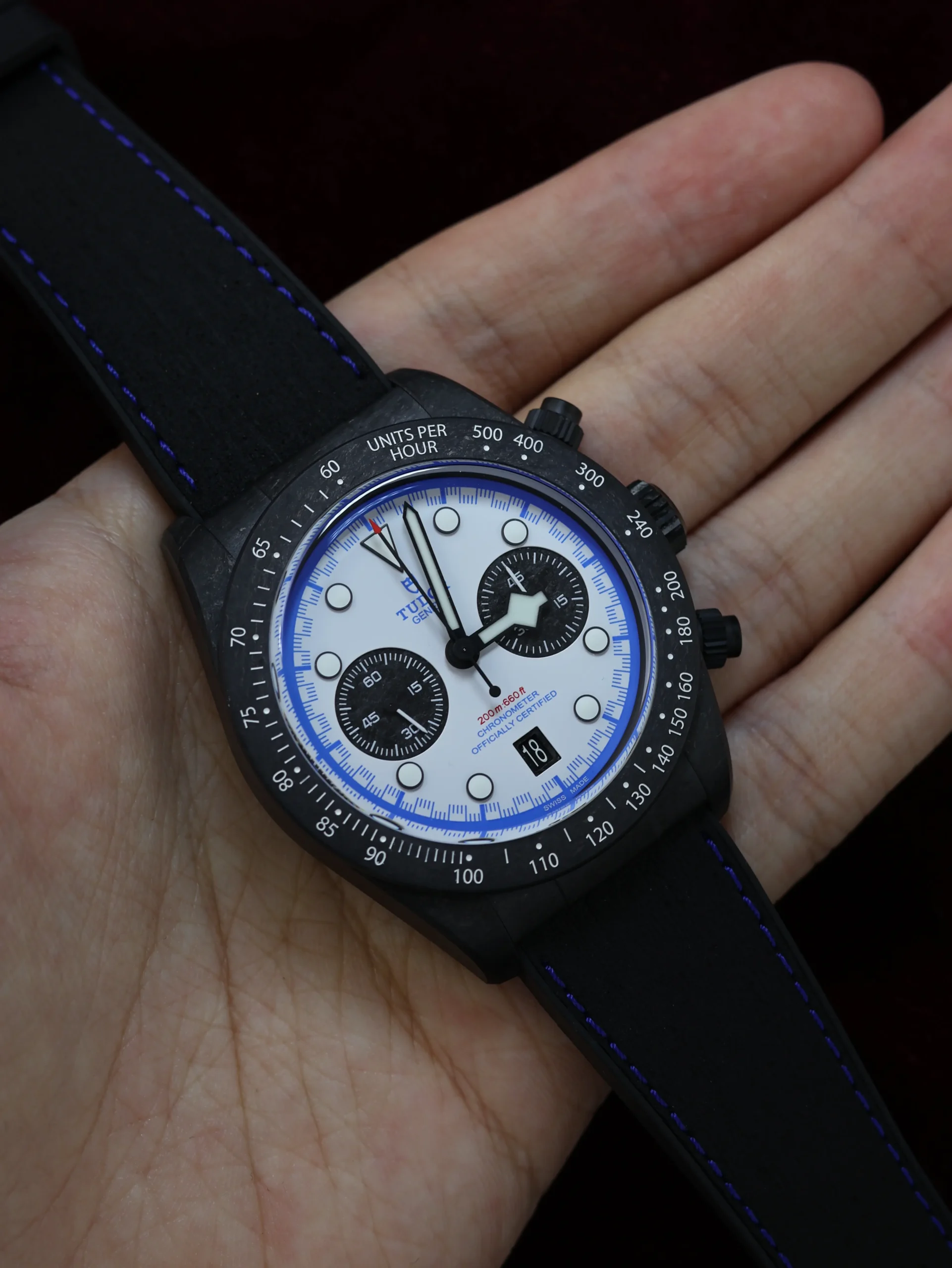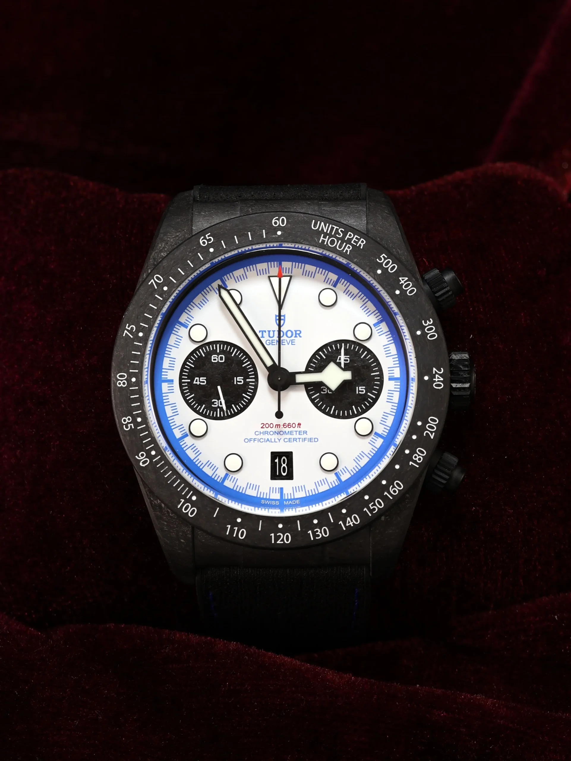 Unworn limited to 2025 pieces Tudor Black Bay Chrono “Carbon 25” (79377KN) self-winding automatic watch. This reference features a white dial and black bezel, encased in a 42mm carbon fibre & titanium case and black straps. Features seconds, minutes, hours, date, and chronograph functions. Functions and keeps time well. Comes with box and warranty papers dated 2025.