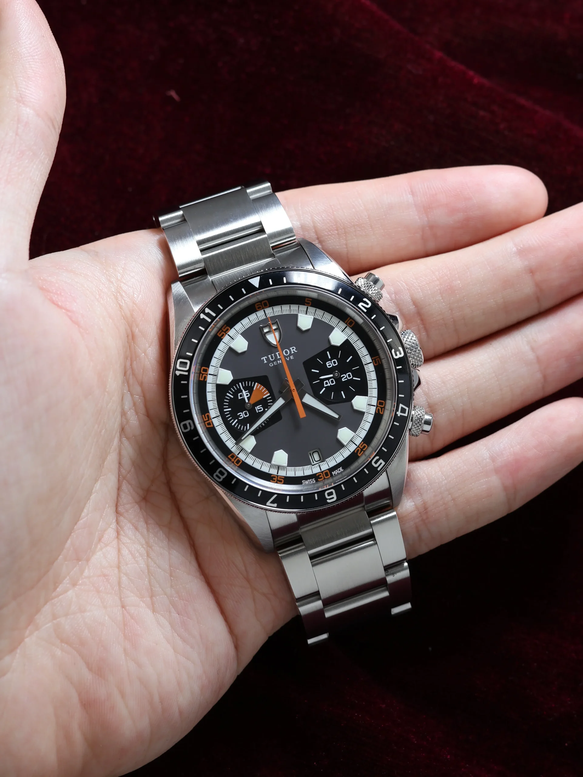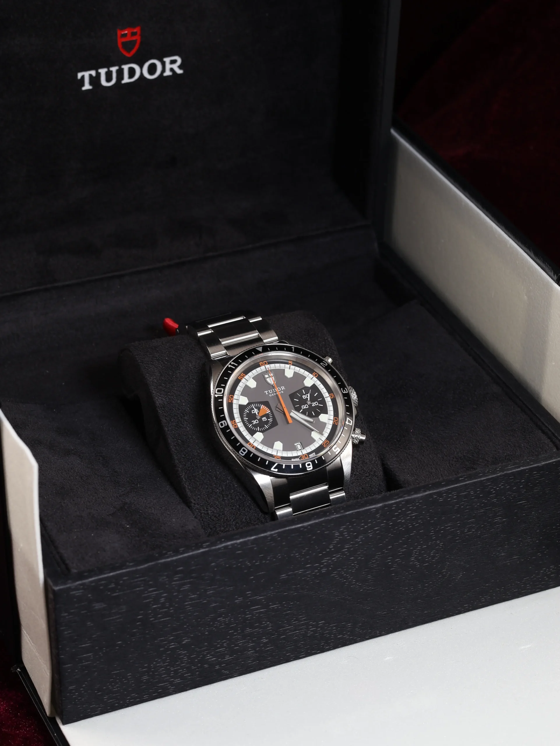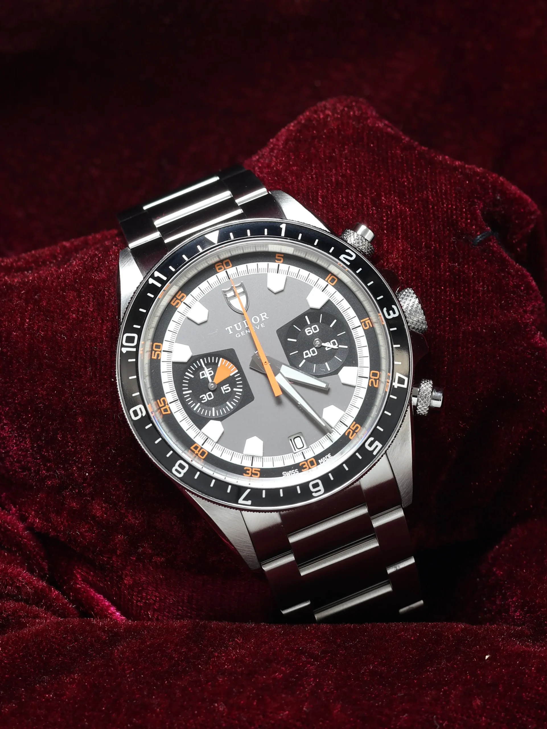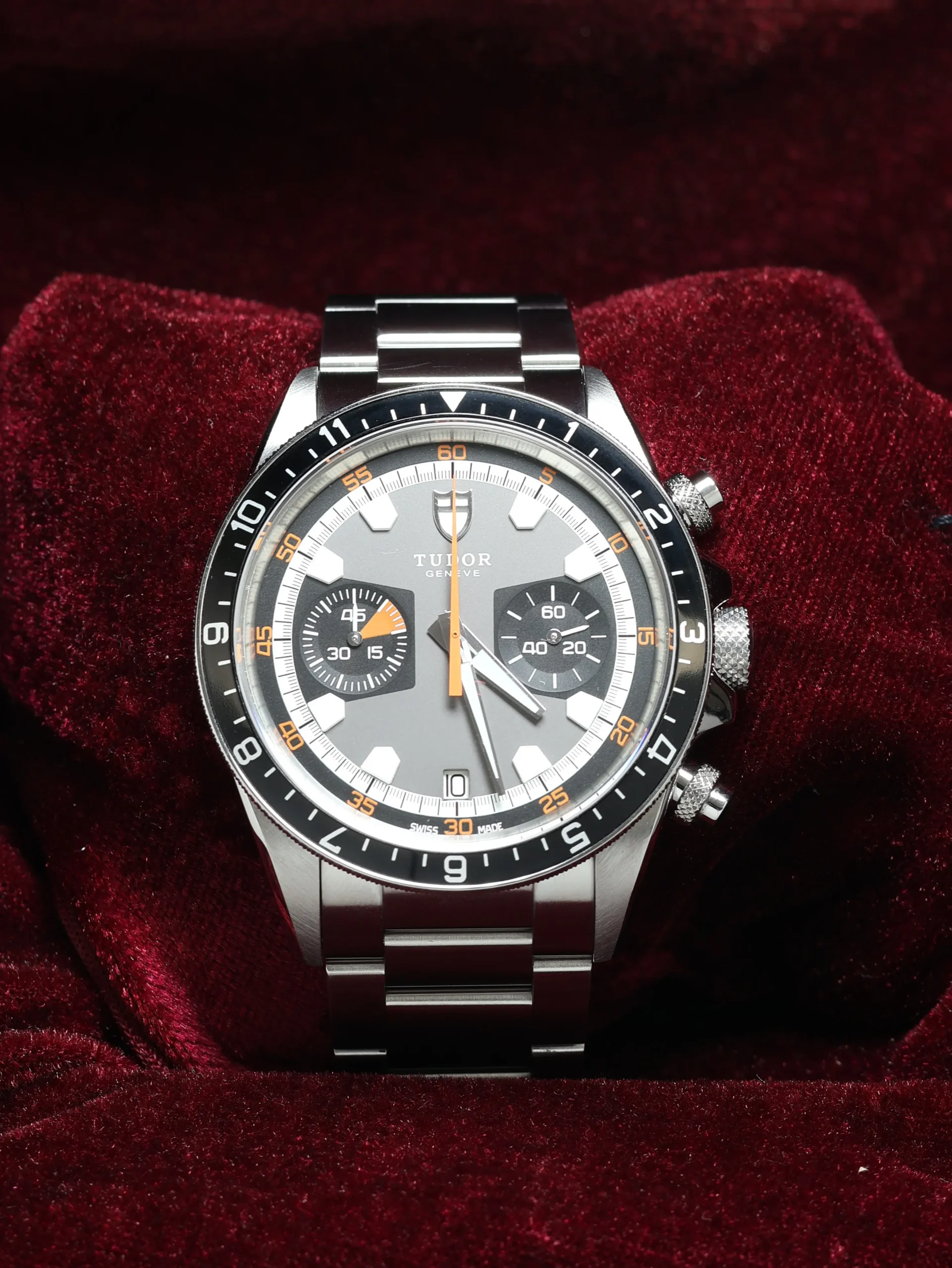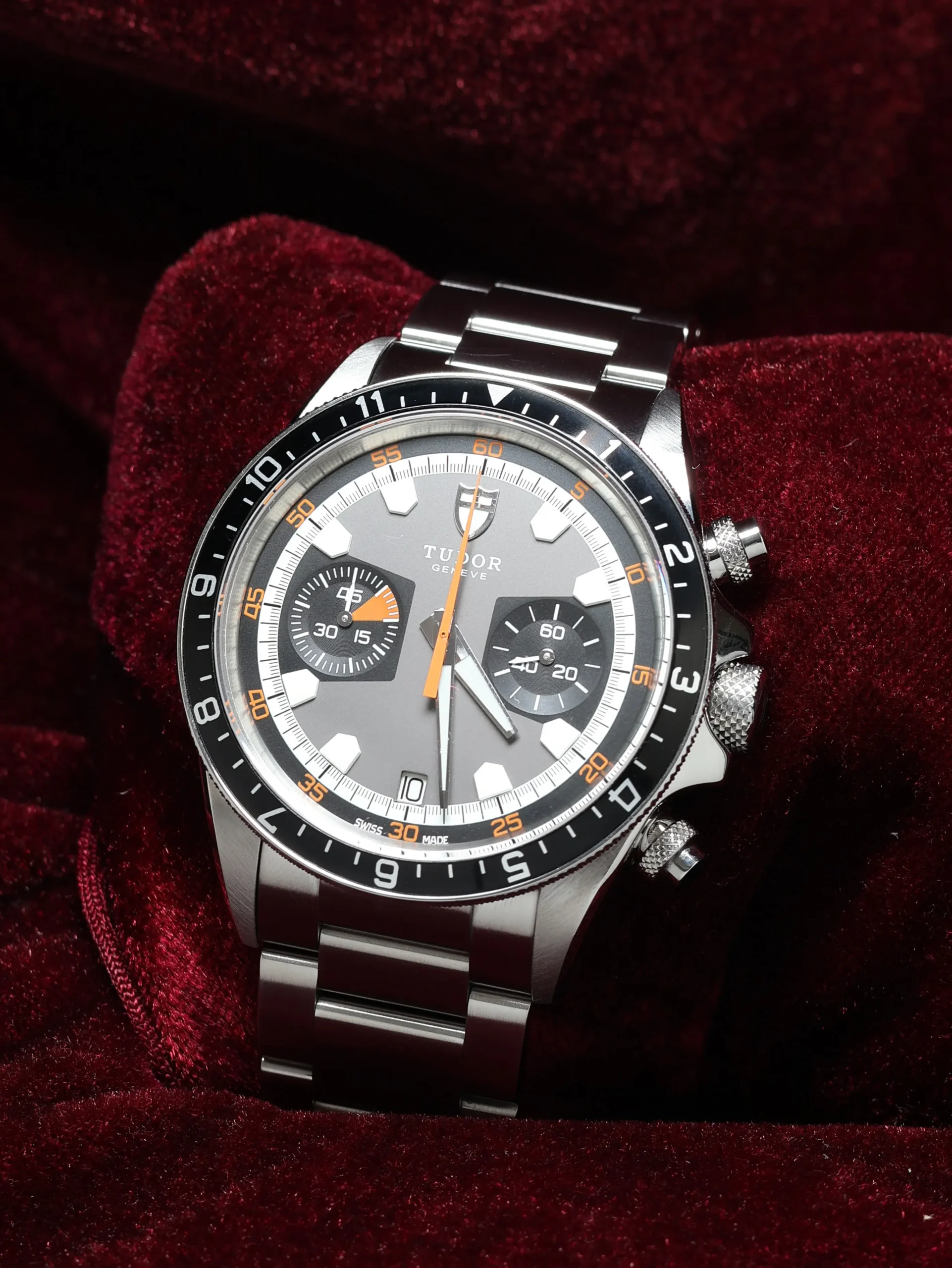 Pre-owned Tudor Heritage Chrono (70330N) self-winding automatic watch. This reference features a grey dial and black bezel, encased in a 42mm steel case and bracelet. Features seconds, minutes, hours, date, chronograph, and GMT dual-time functions. This watch shows light use. Functions and keeps time well. Comes with box and warranty papers dated 2013.